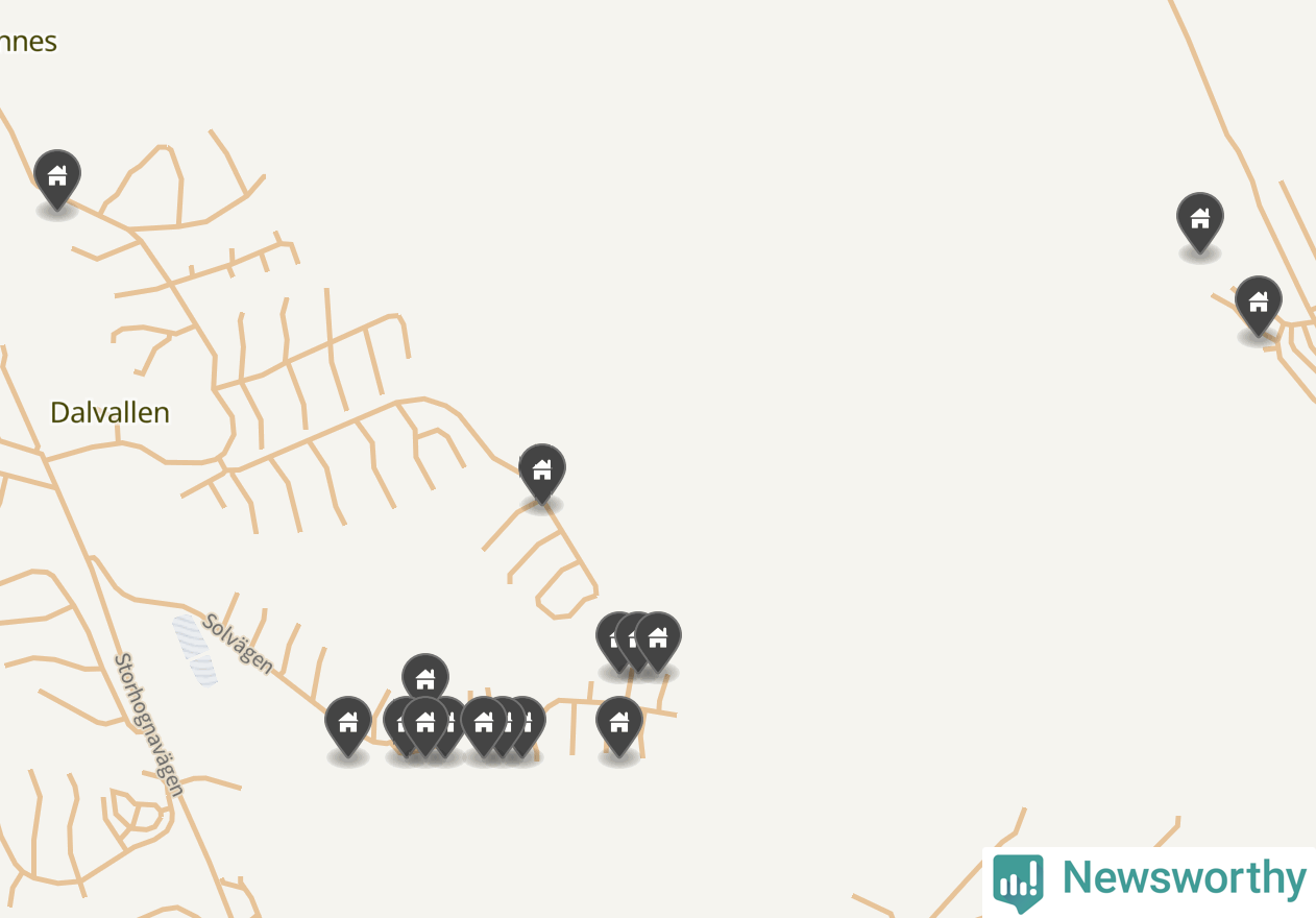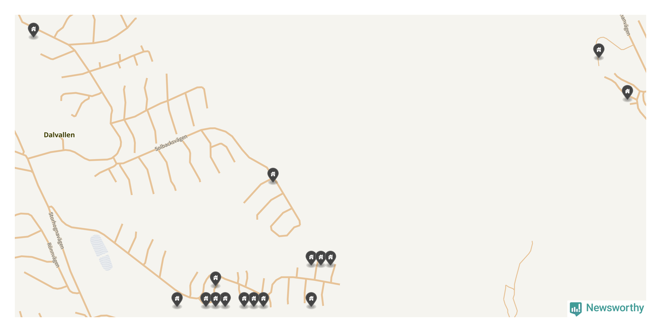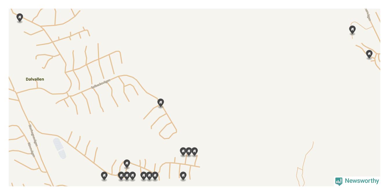De 20 högst taxerade fastigheterna visas. En markör per fastighet. Samtaxerade fastigheter visas bara en gång. Notera att det är centrumpunkten för fastigheten som visas, vilket kan vara missvisande för stora fastigheter.