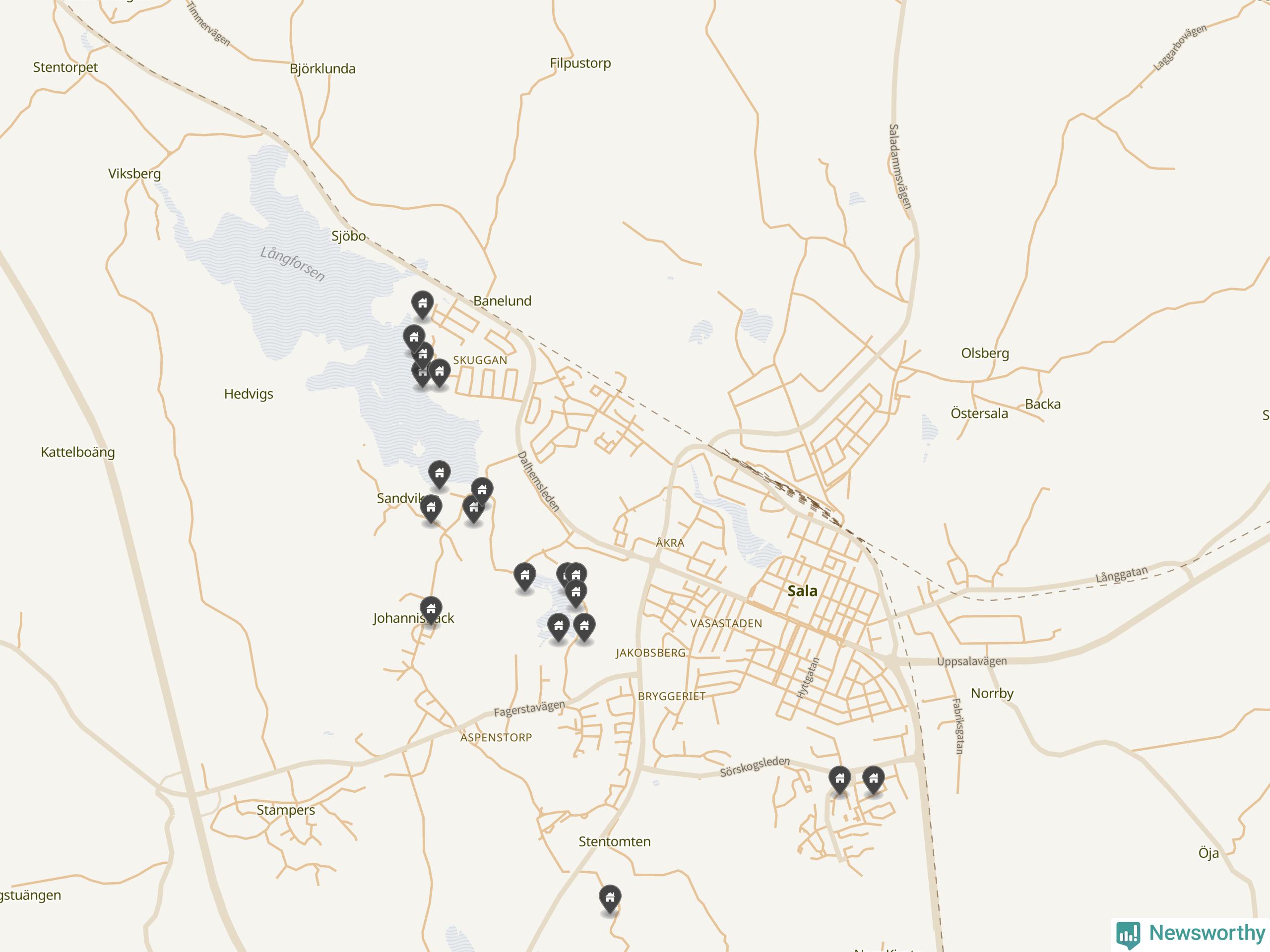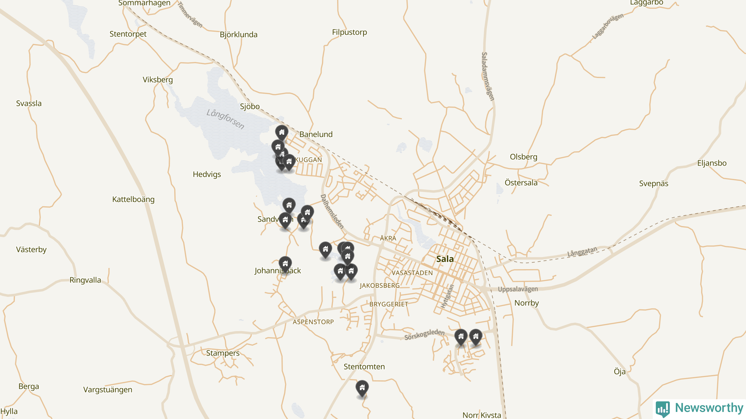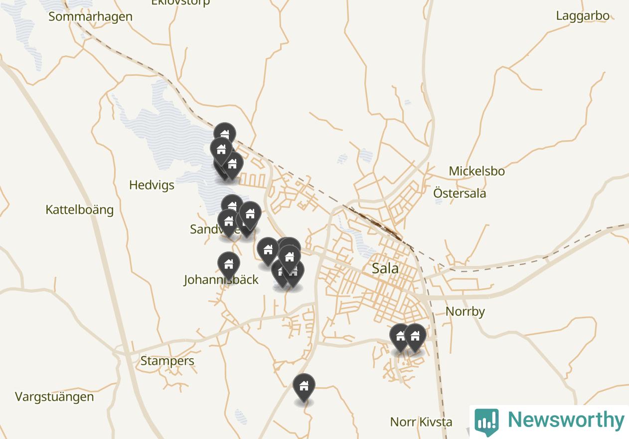 De 100 högst taxerade småhusfastigheterna i Sala har ett snittvärde på 4,6 miljoner kronor, vilket är omkring två miljoner lägre än snittet för alla kommuners 100 högst taxerade småhus. Det visar Newsworthys genomgång av kommunernas högst taxerade småhusfastigheter, som sammanställts med hjälp av data från The intelligence company.