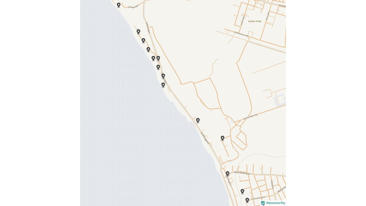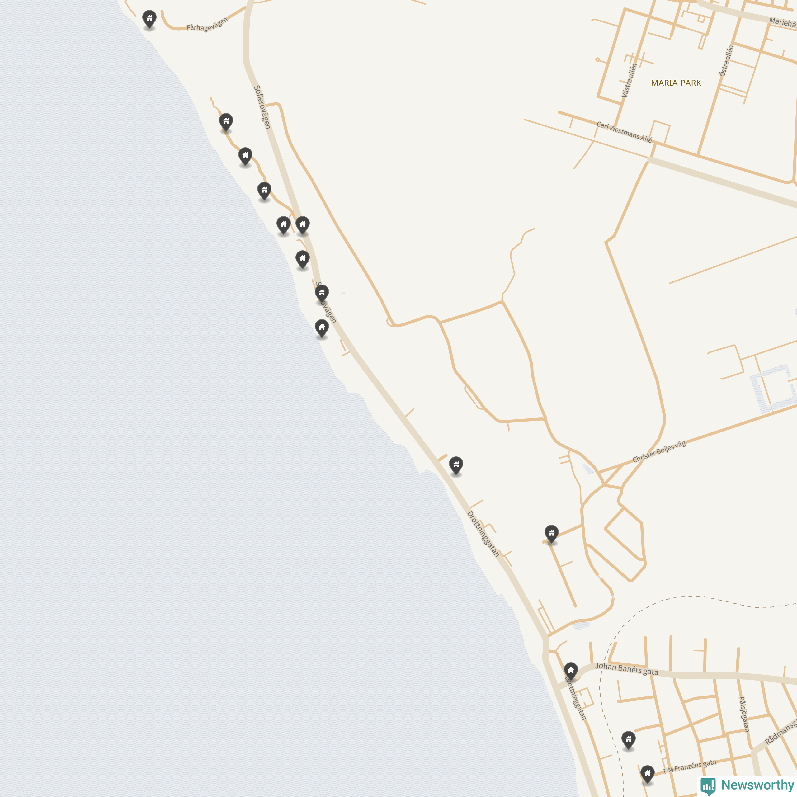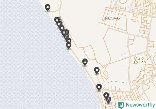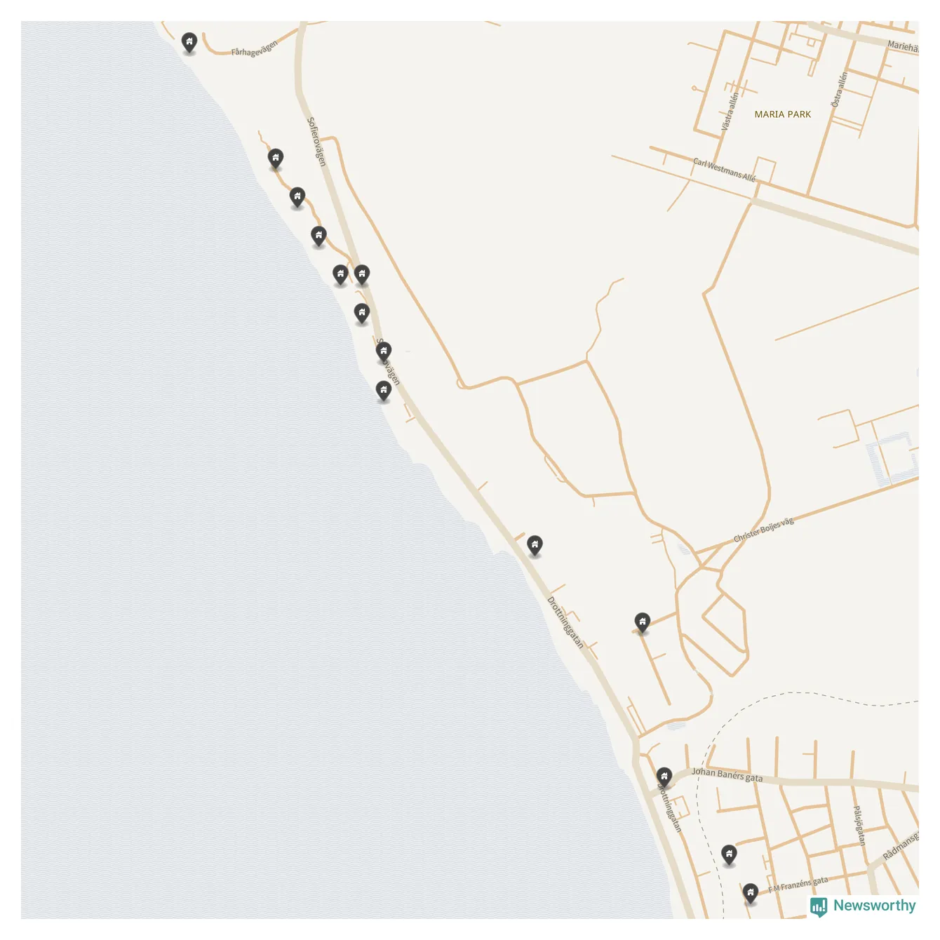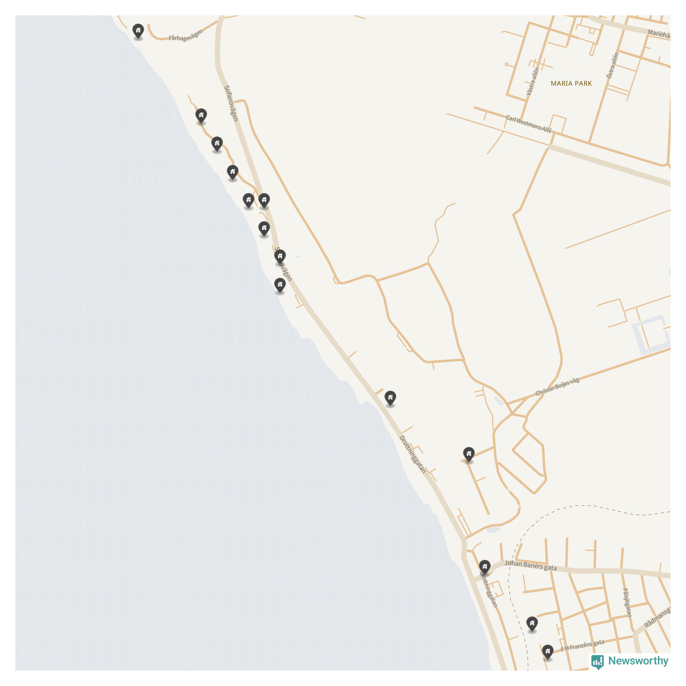 De 20 högst taxerade fastigheterna visas. En markör per fastighet. Samtaxerade fastigheter visas bara en gång. Notera att det är centrumpunkten för fastigheten som visas, vilket kan vara missvisande för stora fastigheter.