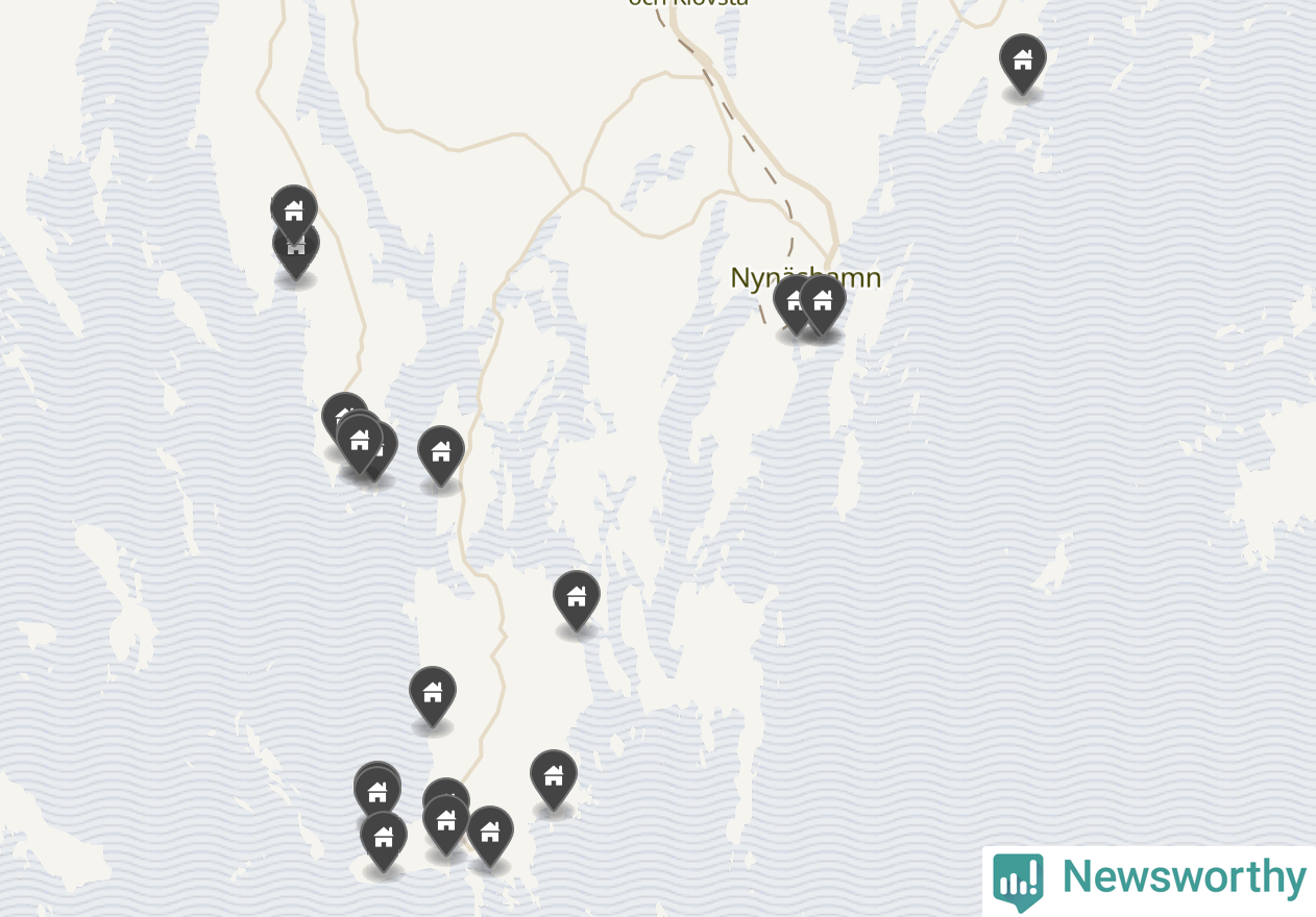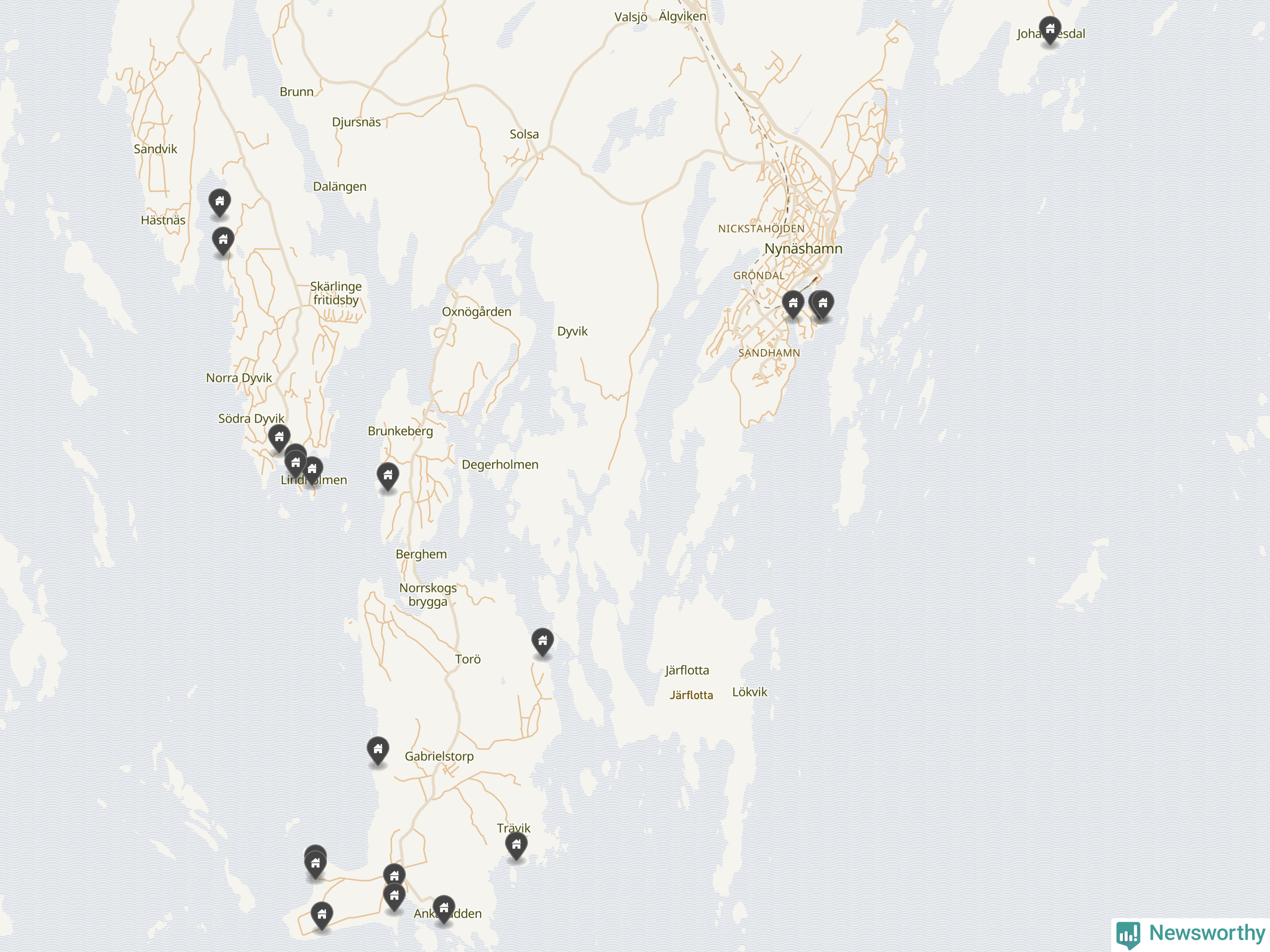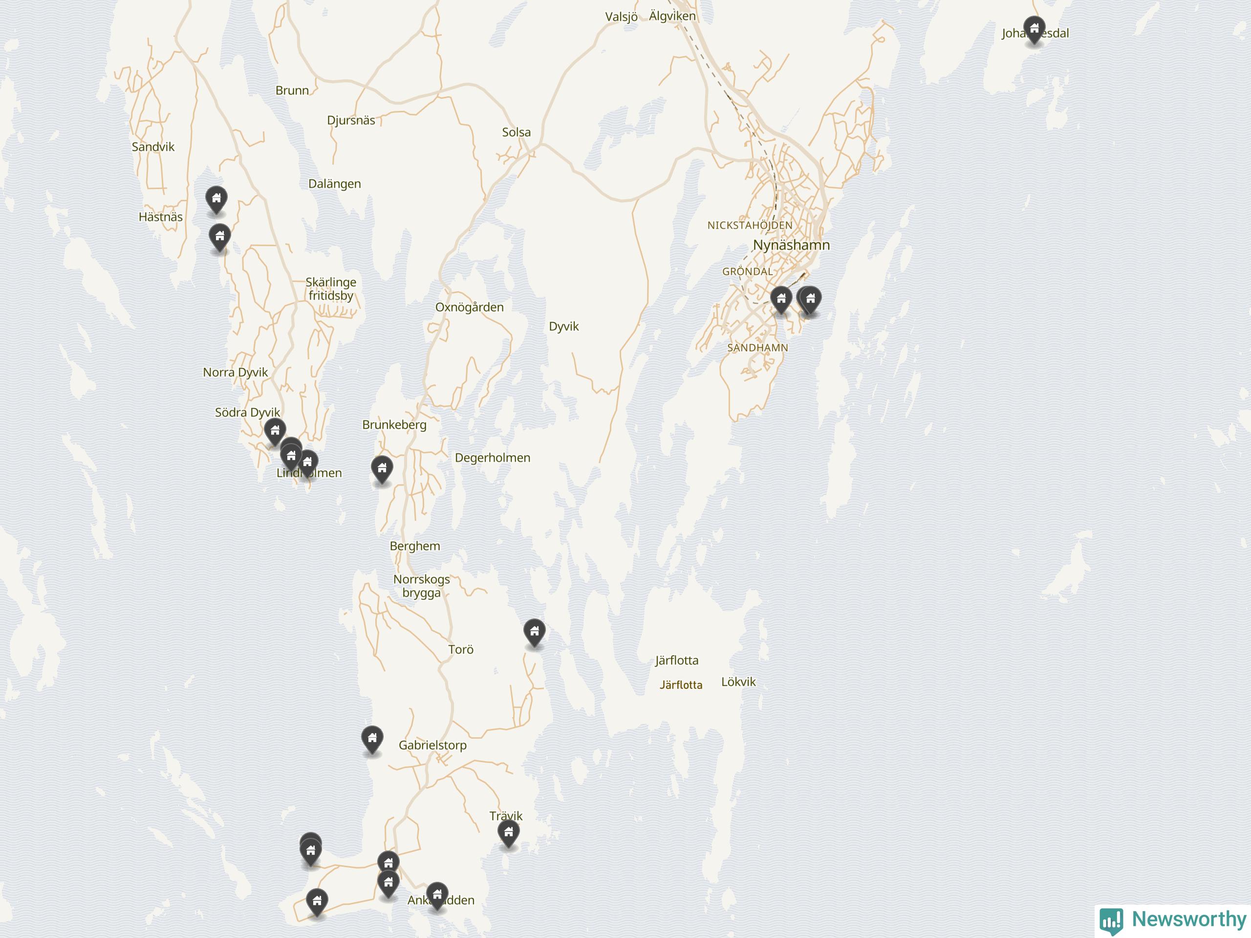 De 100 högst taxerade småhusfastigheterna i Nynäshamn har ett snittvärde på 10,9 miljoner kronor, vilket är omkring fem miljoner högre än snittet för alla kommuners 100 högst taxerade småhus. Det visar Newsworthys genomgång av kommunernas högst taxerade småhusfastigheter, som sammanställts med hjälp av data från The intelligence company.