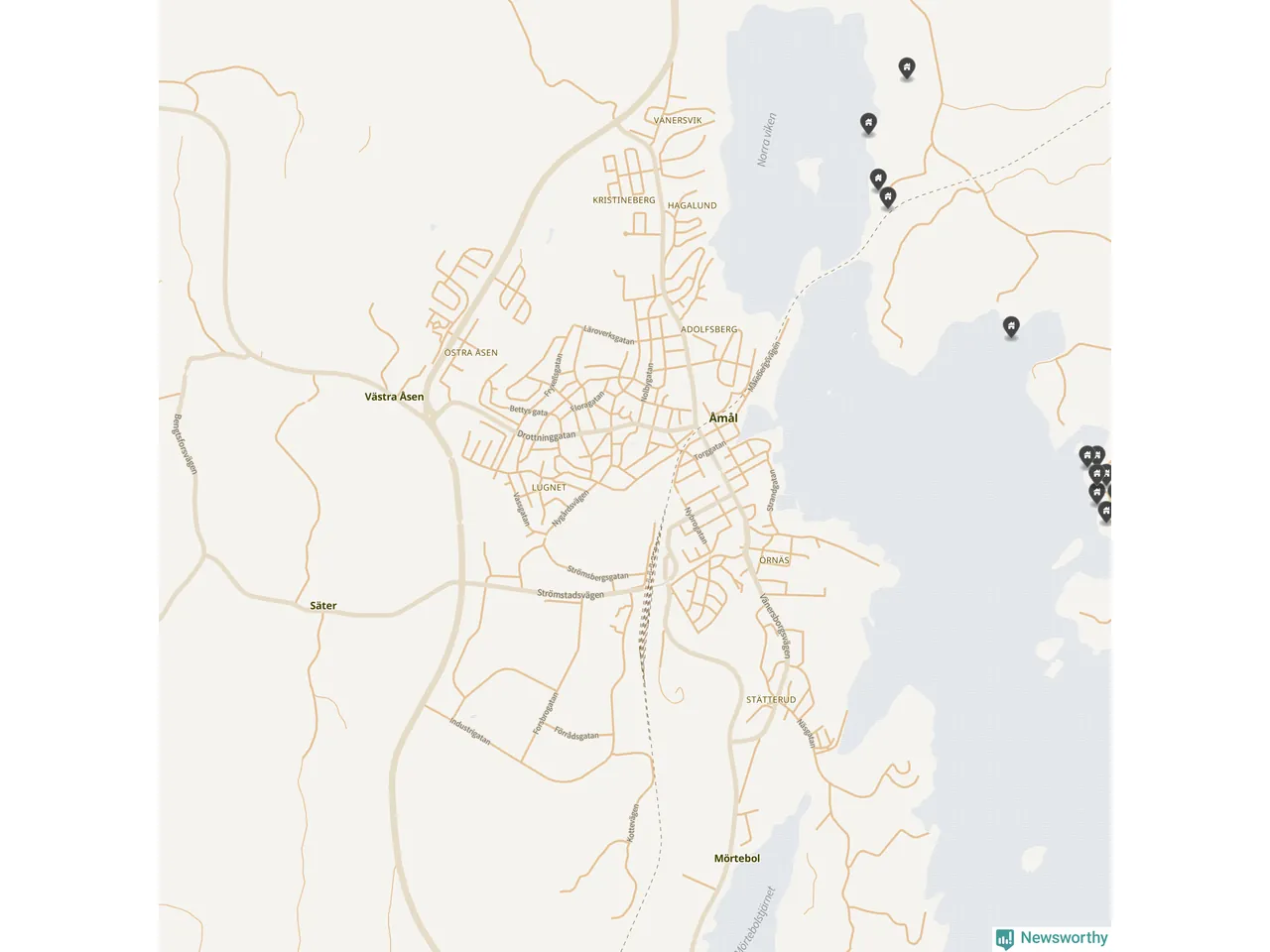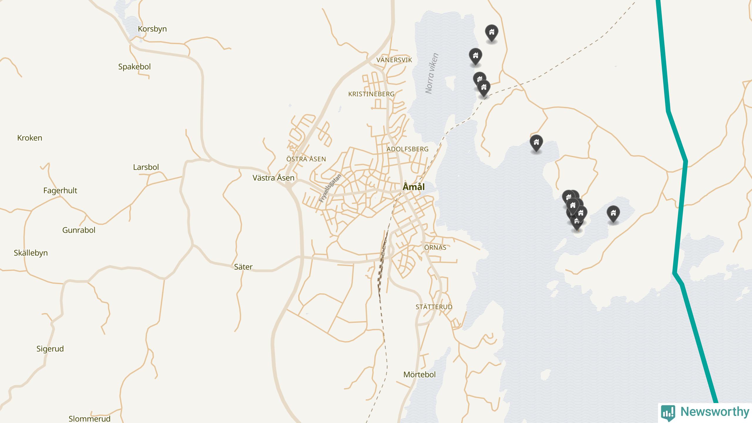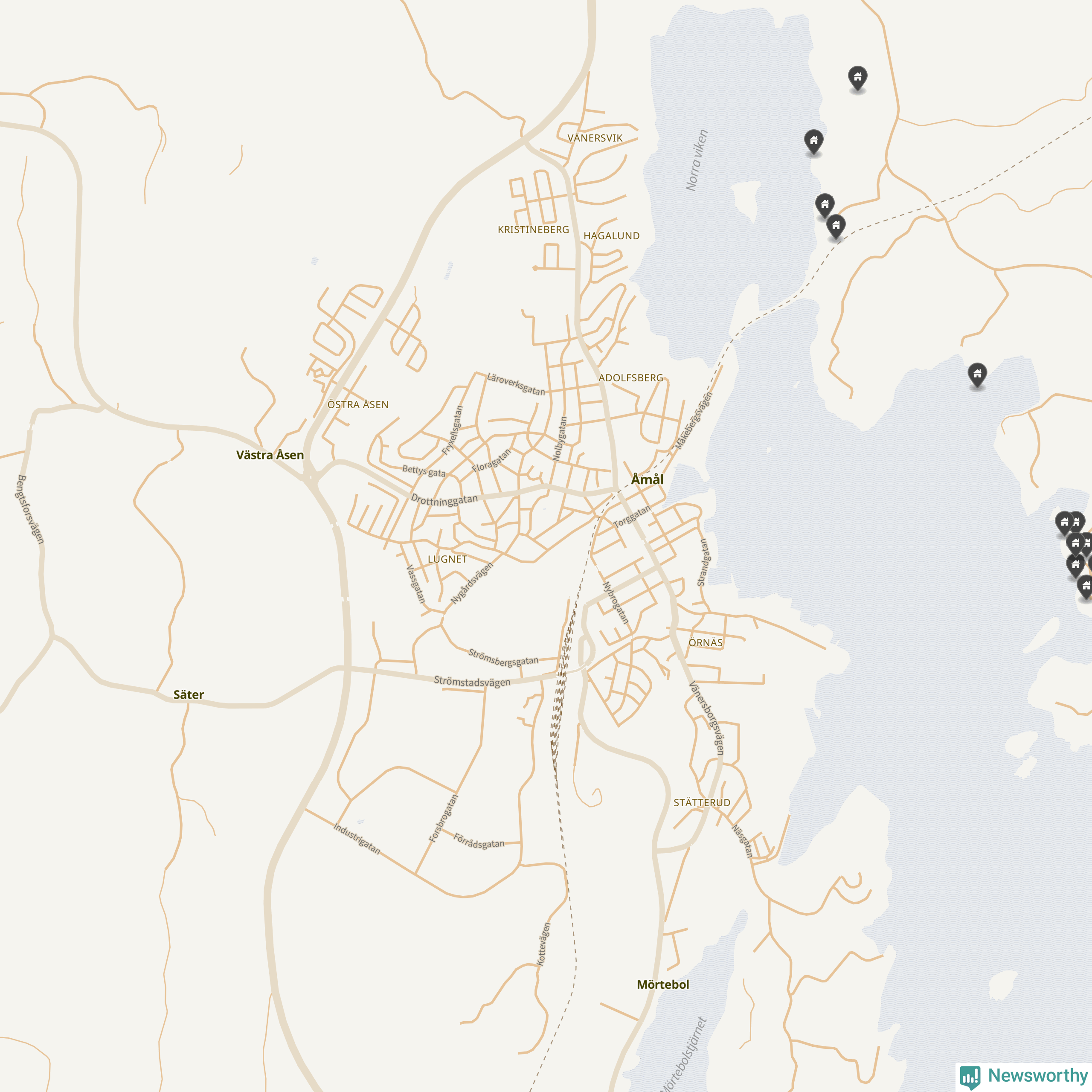 De 100 högst taxerade småhusfastigheterna i Åmål har ett snittvärde på 3,1 miljoner kronor, vilket är omkring tre miljoner lägre än snittet för alla kommuners 100 högst taxerade småhus. Det visar Newsworthys genomgång av kommunernas högst taxerade småhusfastigheter, som sammanställts med hjälp av data från The intelligence company.