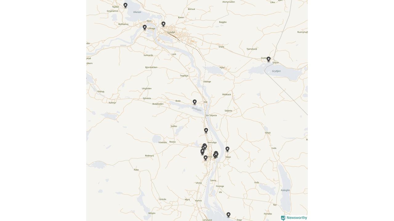 De 20 högst taxerade fastigheterna visas. En markör per fastighet. Samtaxerade fastigheter visas bara en gång. Notera att det är centrumpunkten för fastigheten som visas, vilket kan vara missvisande för stora fastigheter.