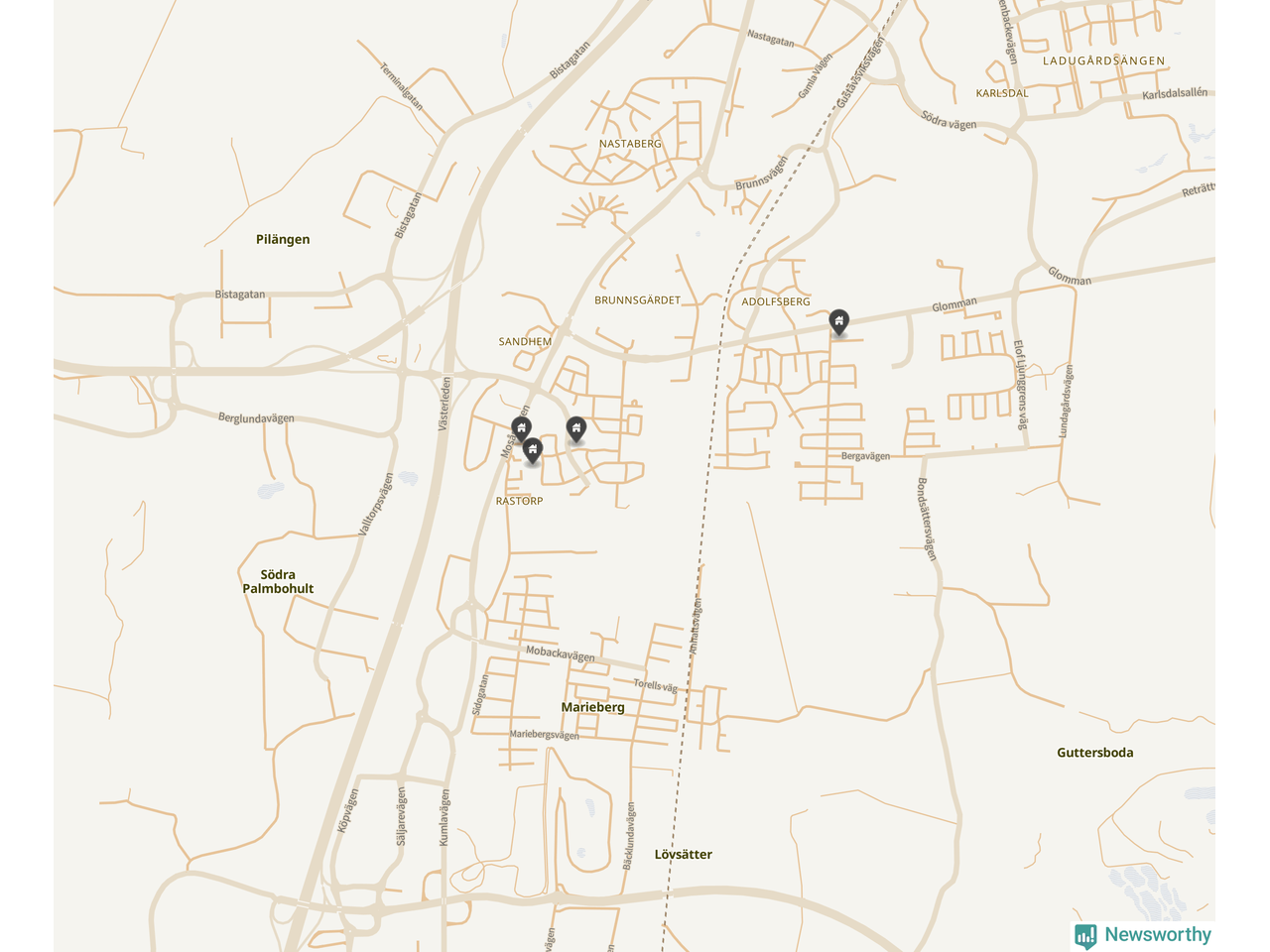 En markör per fastighet. Samtaxerade fastigheter visas bara en gång. Notera att det är centrumpunkten för fastigheterna som visas, vilket kan vara missvisande för stora fastigheter.