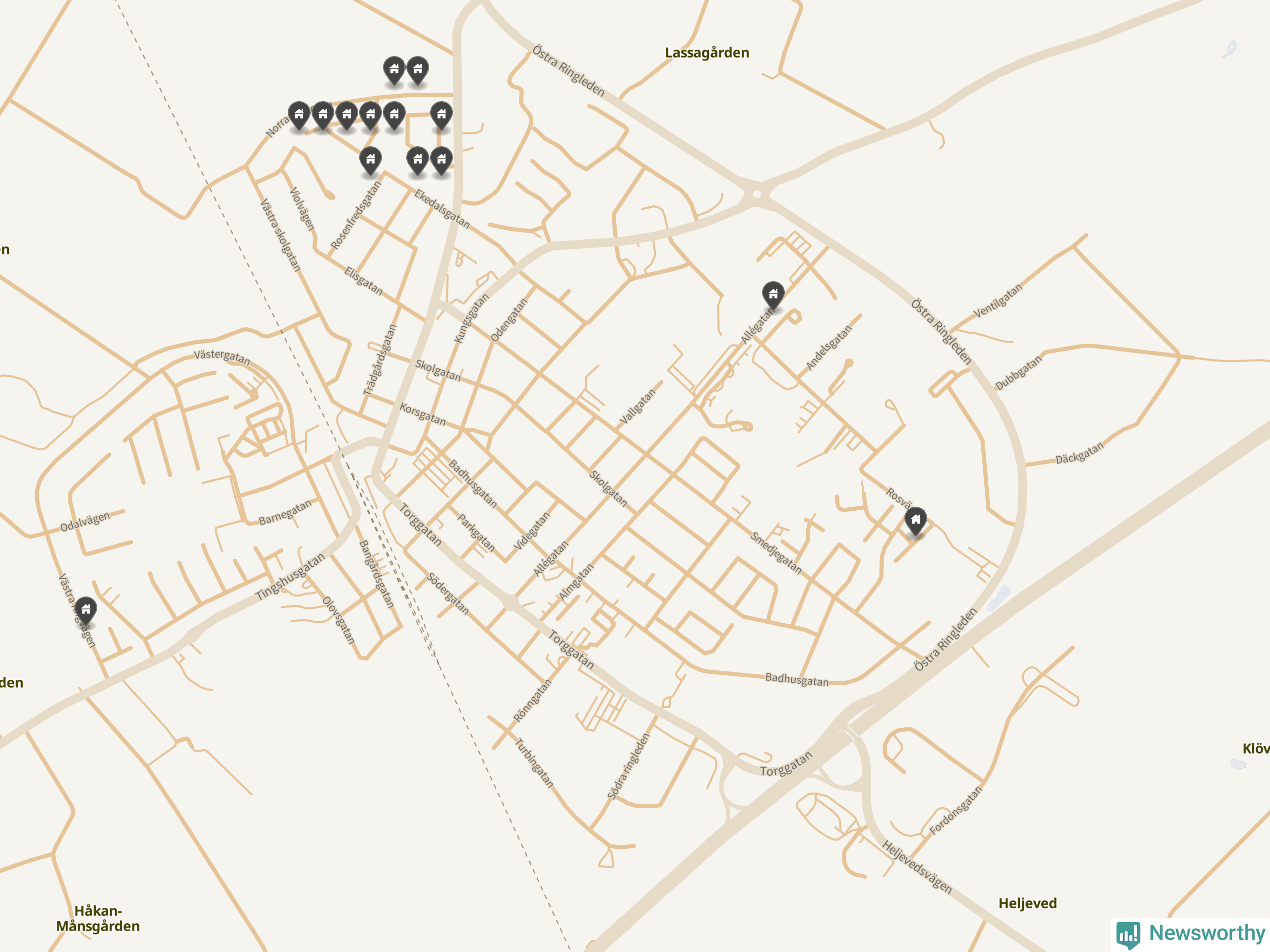 En markör per fastighet. Samtaxerade fastigheter visas bara en gång. Notera att det är centrumpunkten för fastigheterna som visas, vilket kan vara missvisande för stora fastigheter.