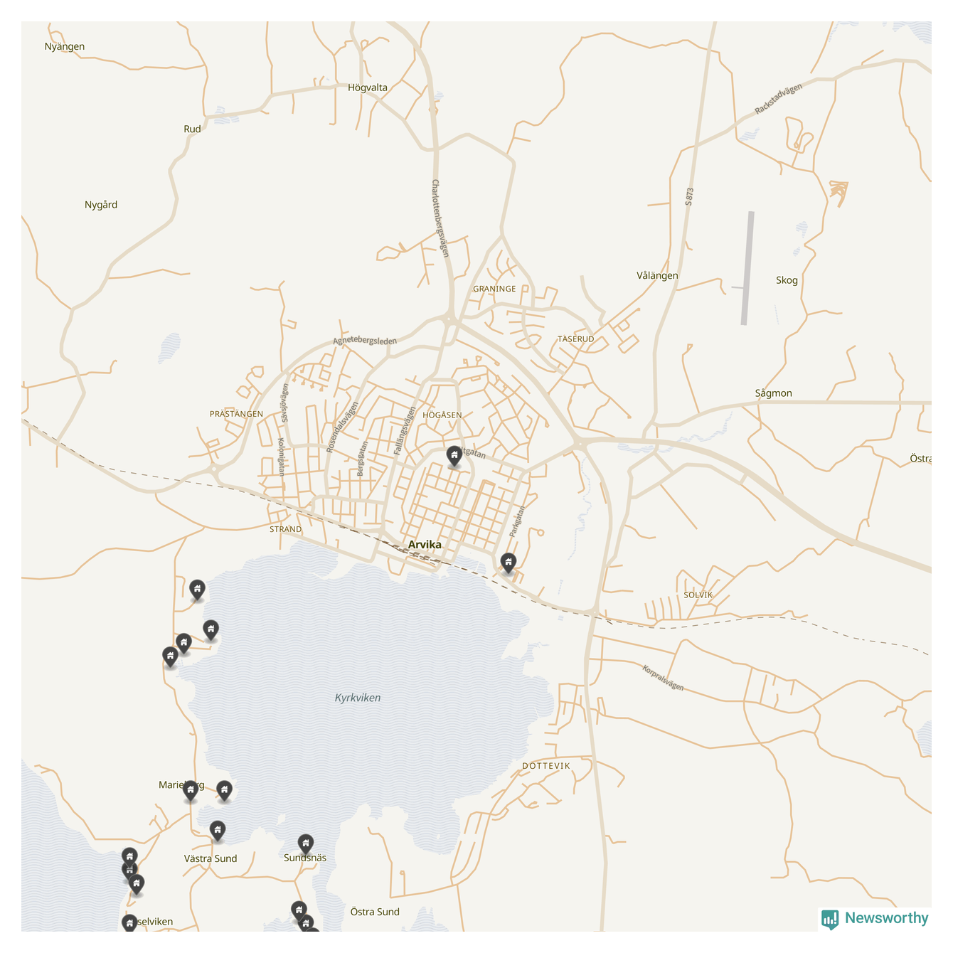 De 20 högst taxerade fastigheterna visas. En markör per fastighet. Samtaxerade fastigheter visas bara en gång. Notera att det är centrumpunkten för fastigheten som visas, vilket kan vara missvisande för stora fastigheter.