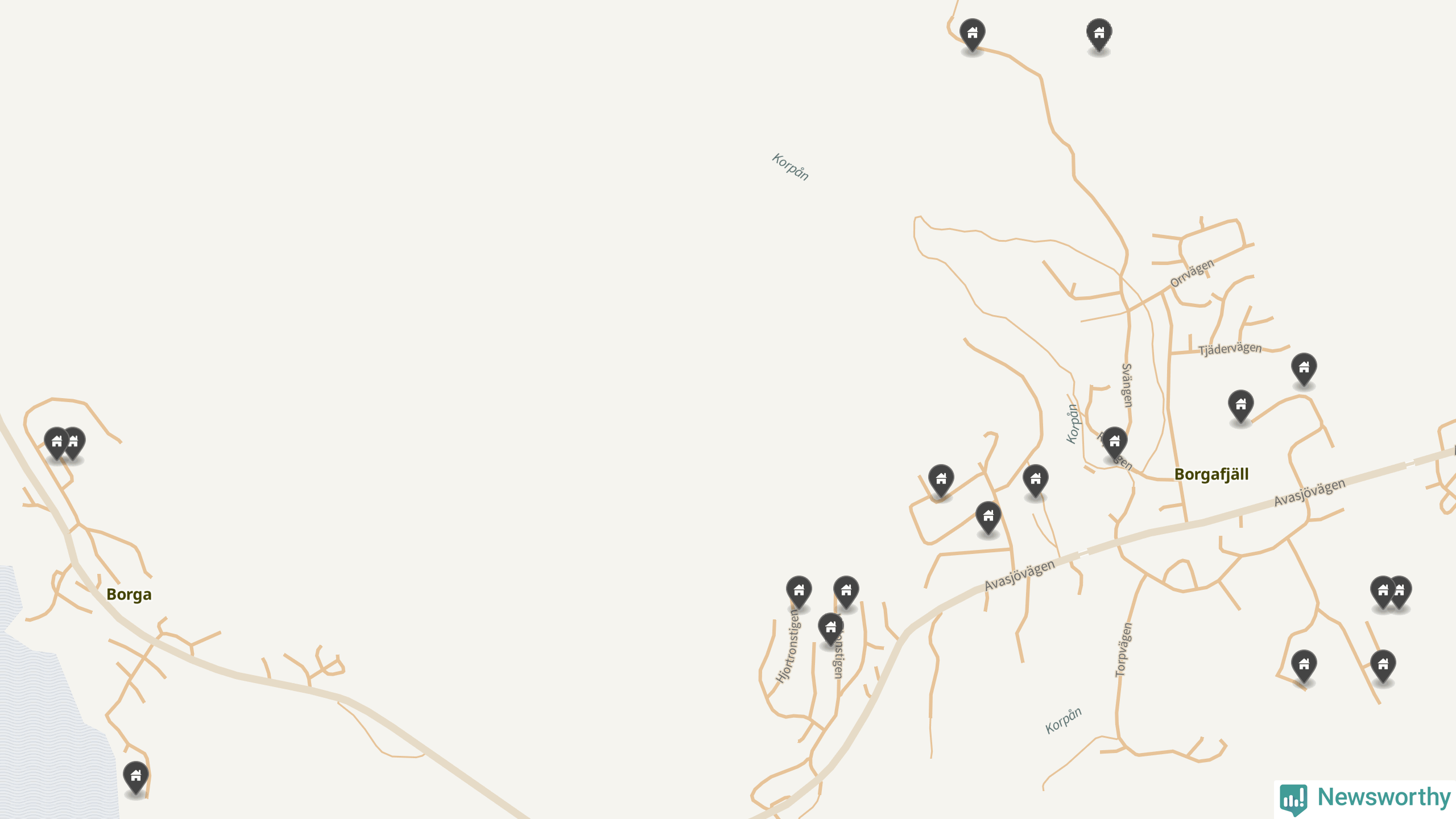 De 20 högst taxerade fastigheterna visas. En markör per fastighet. Samtaxerade fastigheter visas bara en gång. Notera att det är centrumpunkten för fastigheten som visas, vilket kan vara missvisande för stora fastigheter.