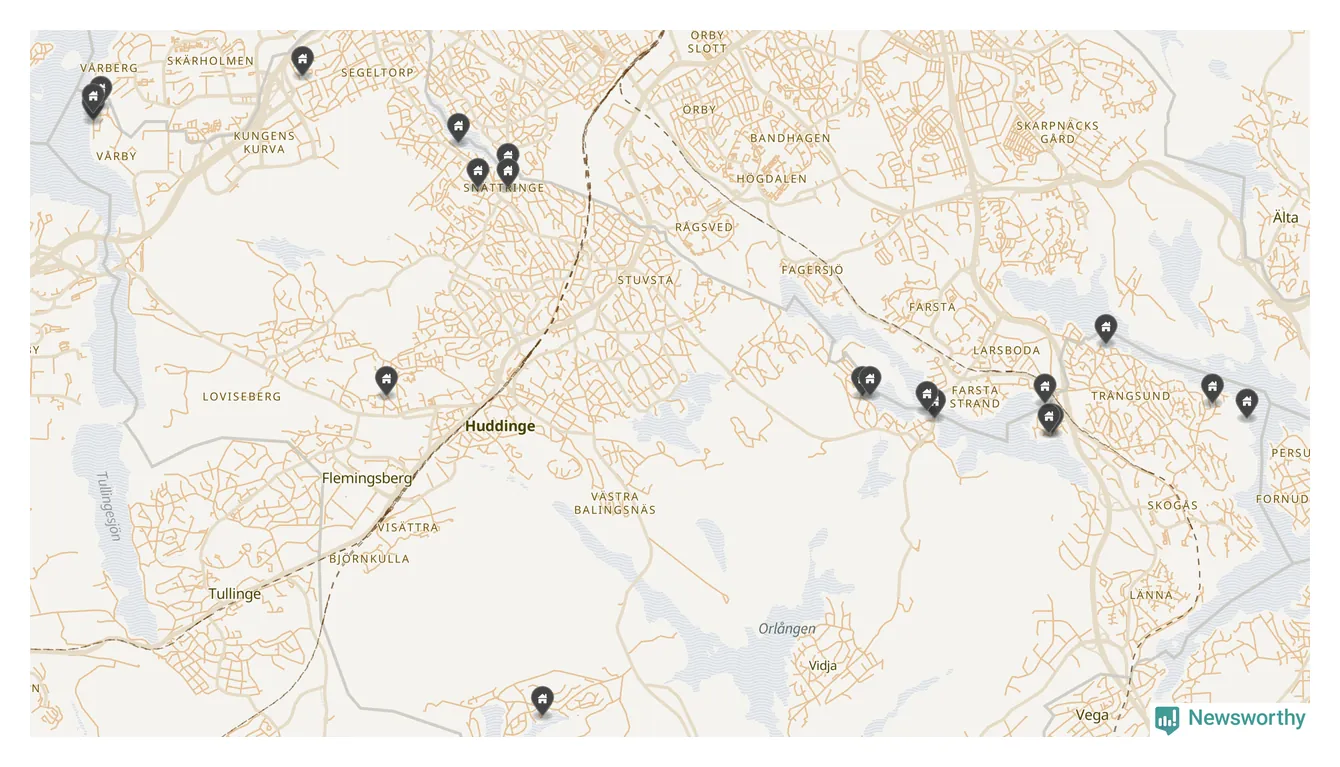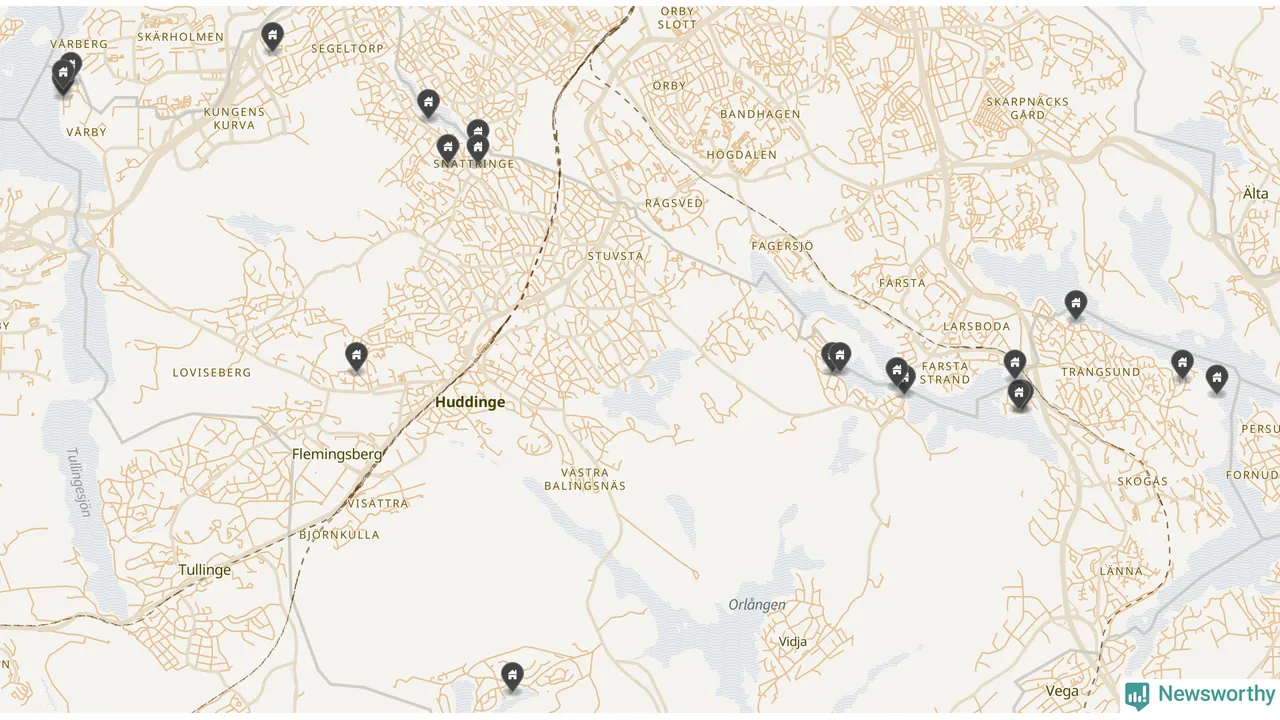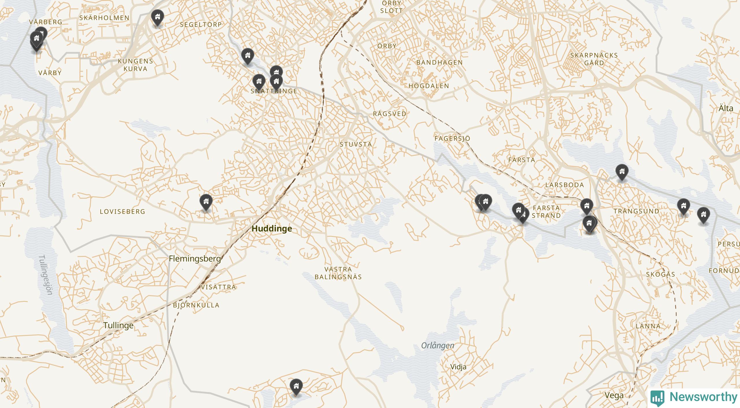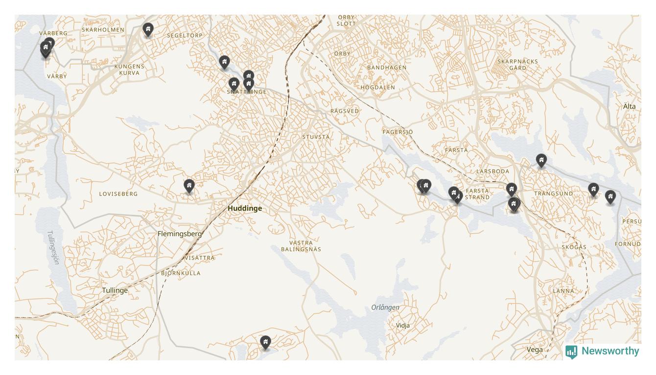De 100 högst taxerade småhusfastigheterna i Huddinge har ett snittvärde på 10,9 miljoner kronor, vilket är omkring fem miljoner högre än snittet för alla kommuners 100 högst taxerade småhus. Det visar Newsworthys genomgång av kommunernas högst taxerade småhusfastigheter, som sammanställts med hjälp av data från The intelligence company.