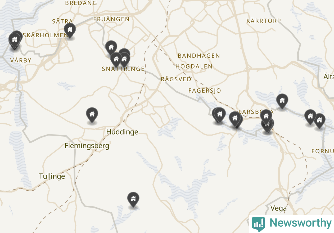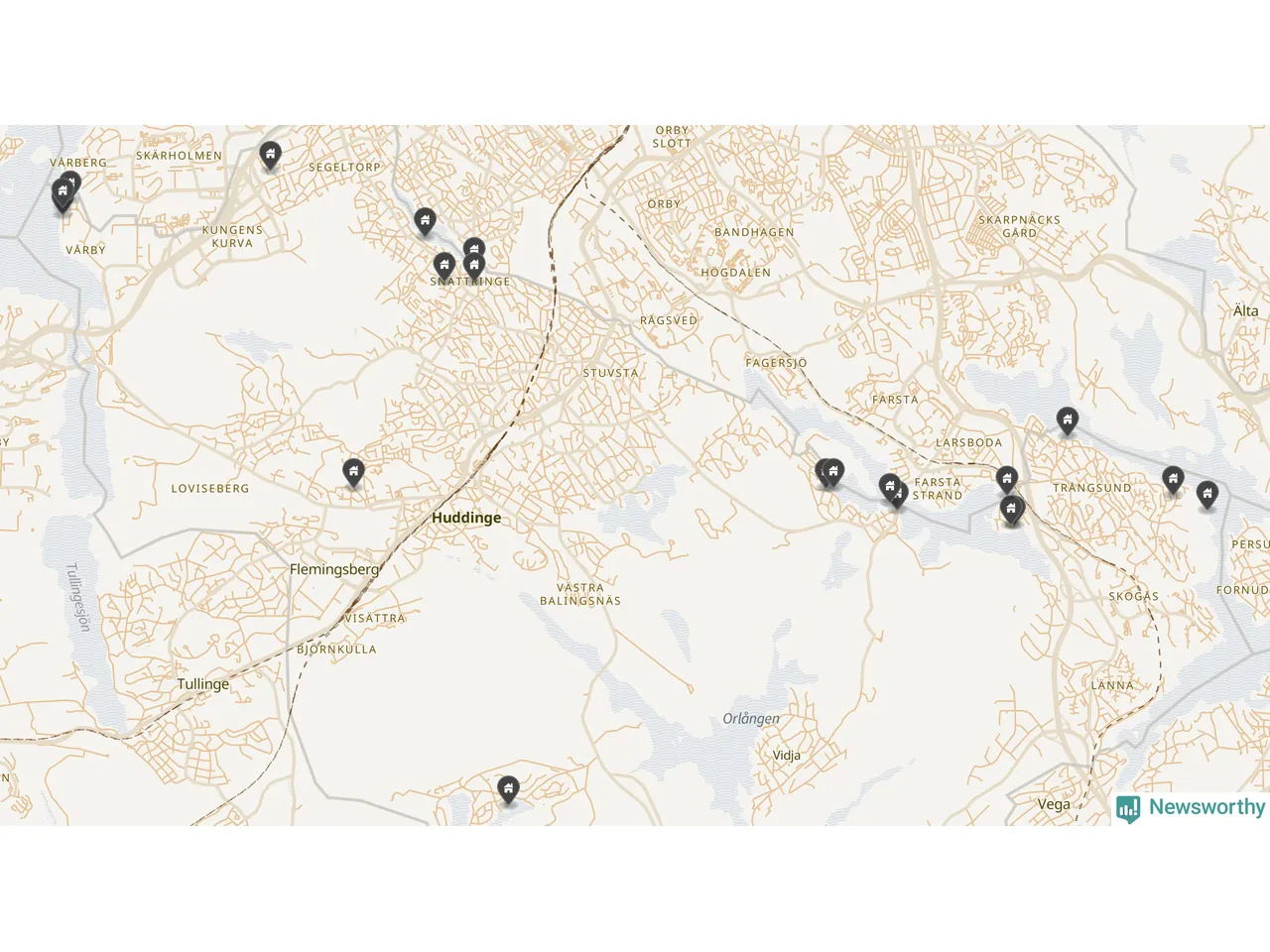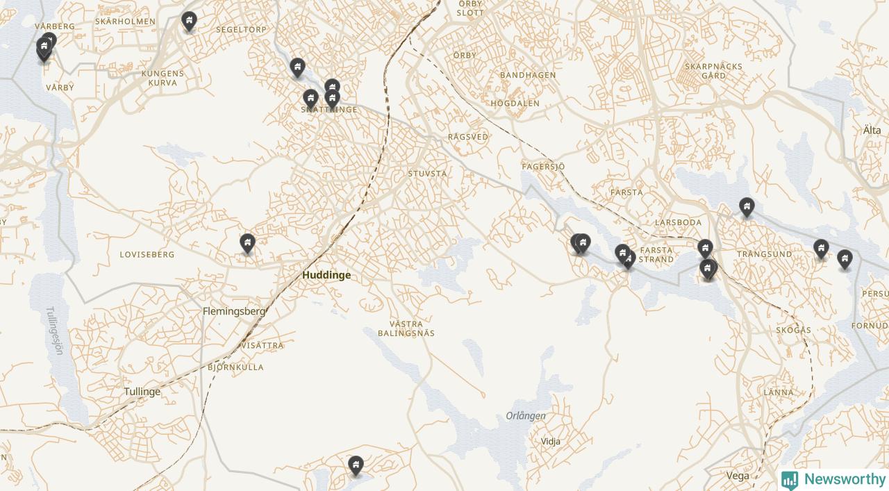 De 100 högst taxerade småhusfastigheterna i Huddinge har ett snittvärde på 10,9 miljoner kronor, vilket är omkring fem miljoner högre än snittet för alla kommuners 100 högst taxerade småhus. Det visar Newsworthys genomgång av kommunernas högst taxerade småhusfastigheter, som sammanställts med hjälp av data från The intelligence company.