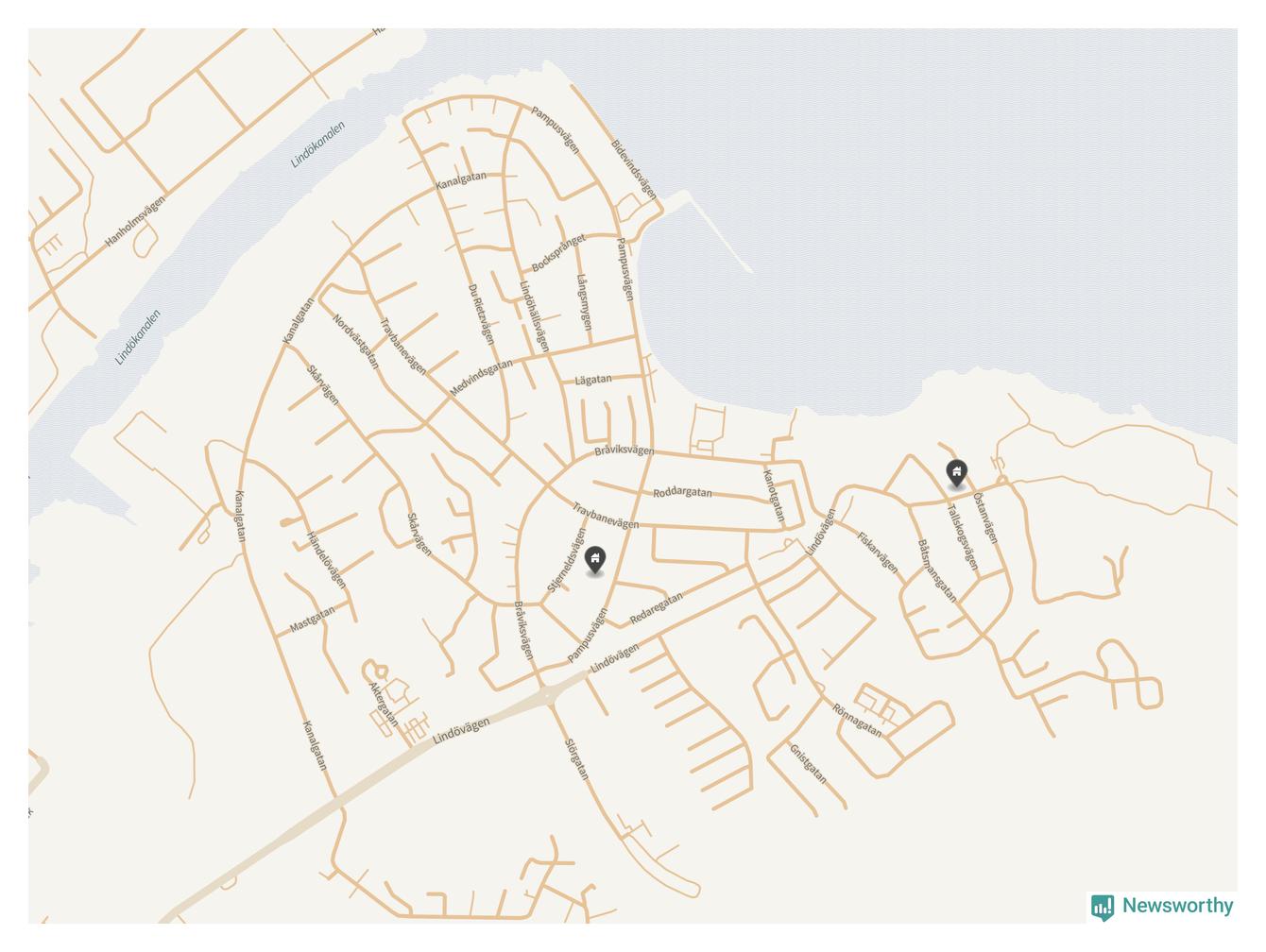 En markör per fastighet. Samtaxerade fastigheter visas bara en gång. Notera att det är centrumpunkten för fastigheterna som visas, vilket kan vara missvisande för stora fastigheter.