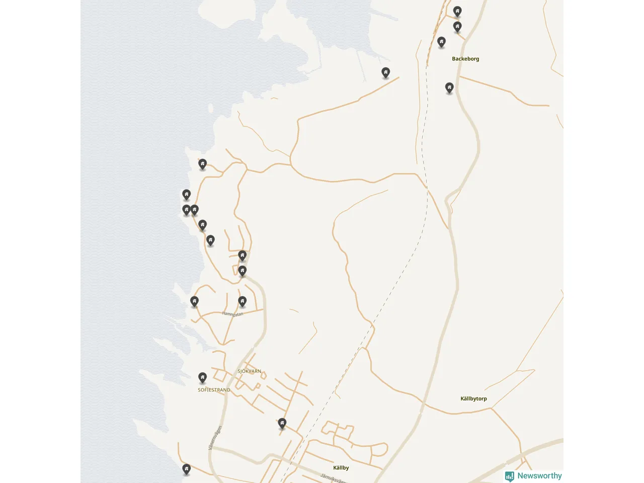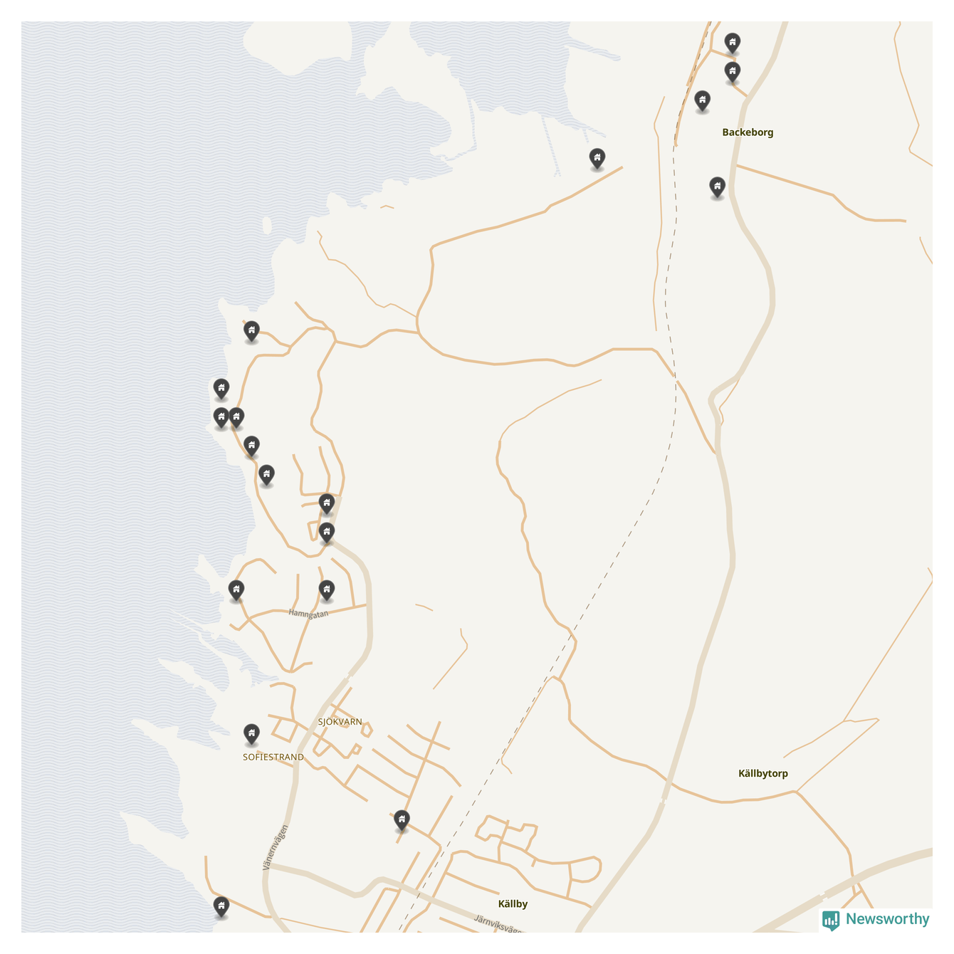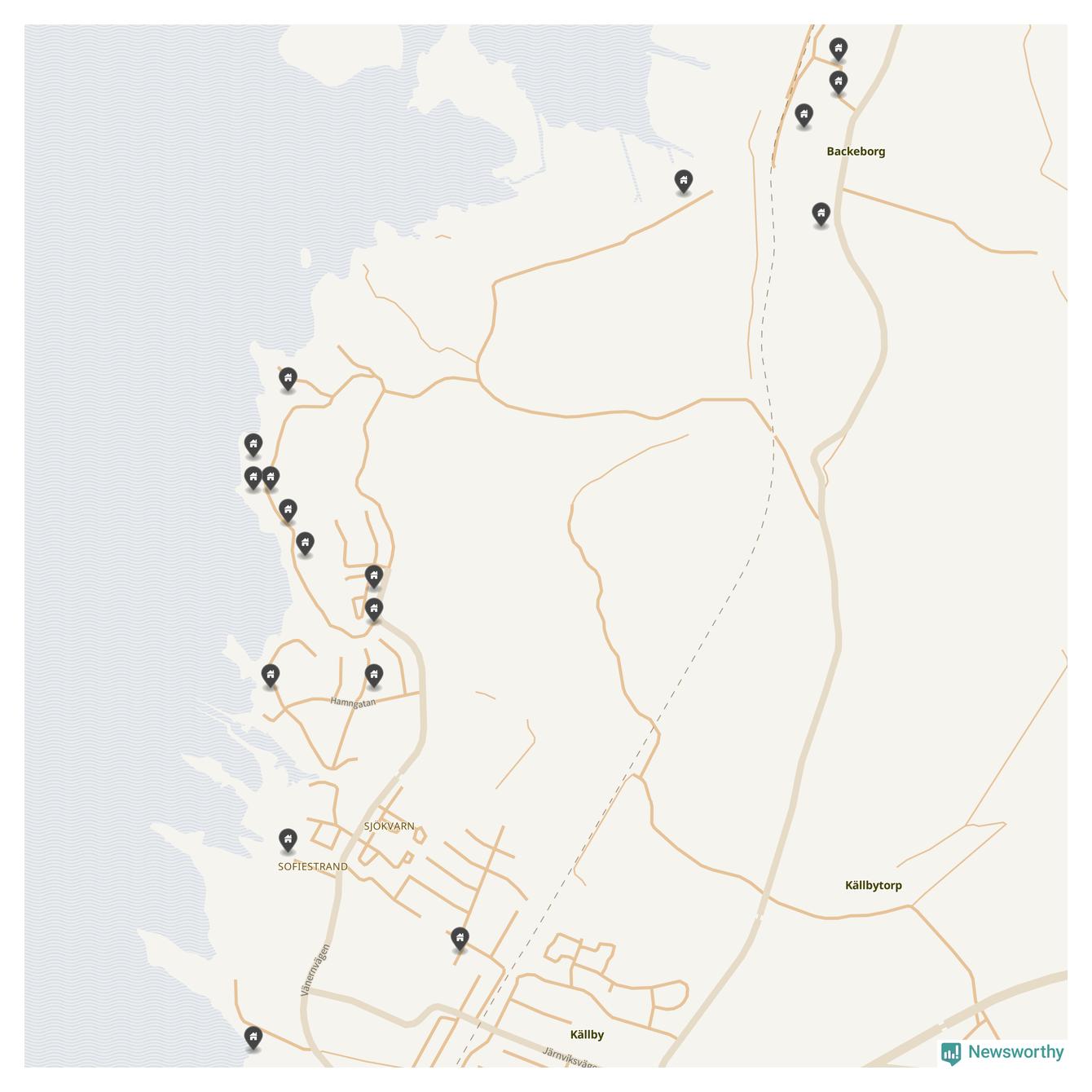De 20 högst taxerade fastigheterna visas. En markör per fastighet. Samtaxerade fastigheter visas bara en gång. Notera att det är centrumpunkten för fastigheten som visas, vilket kan vara missvisande för stora fastigheter.