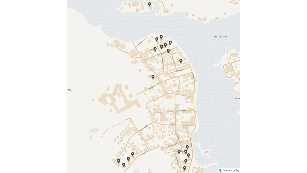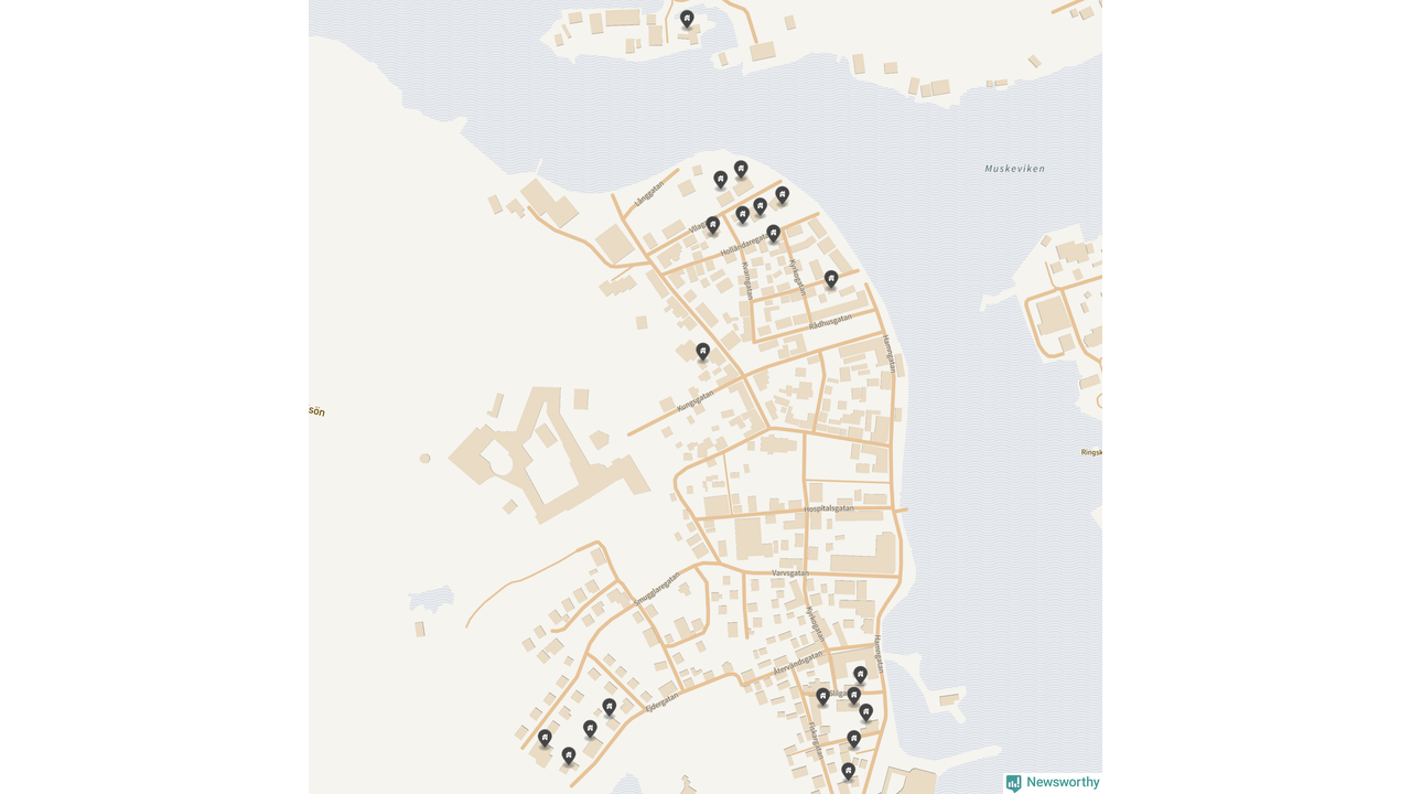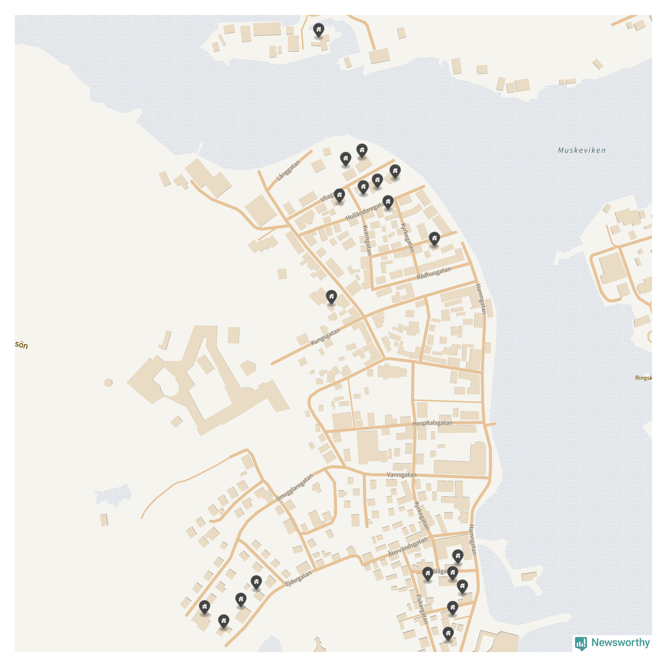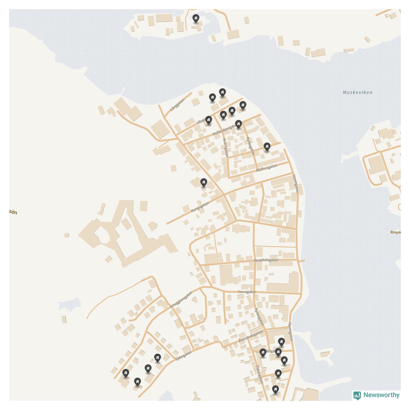 De 20 högst taxerade fastigheterna visas. En markör per fastighet. Samtaxerade fastigheter visas bara en gång. Notera att det är centrumpunkten för fastigheten som visas, vilket kan vara missvisande för stora fastigheter.