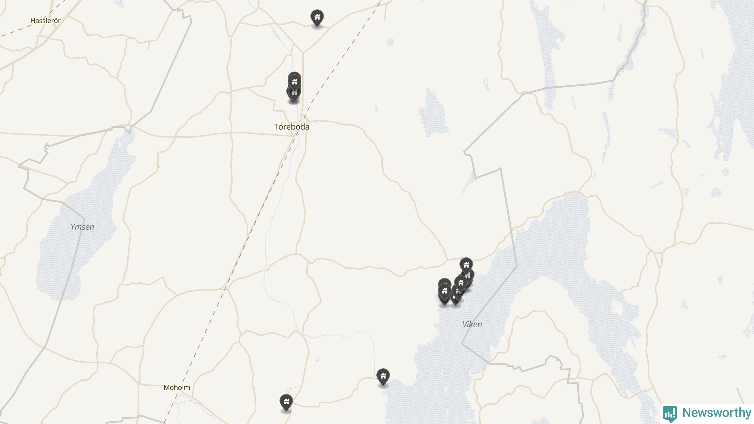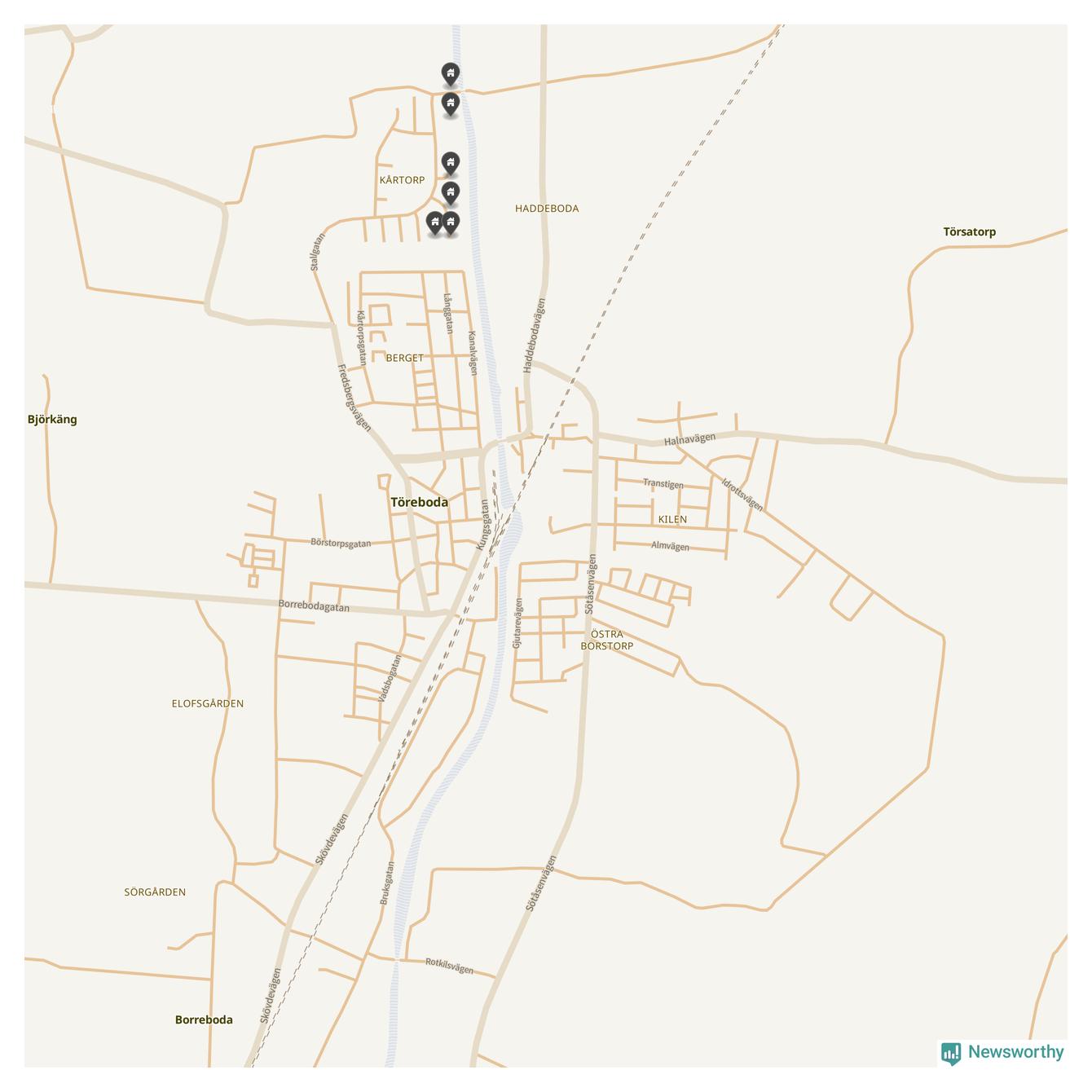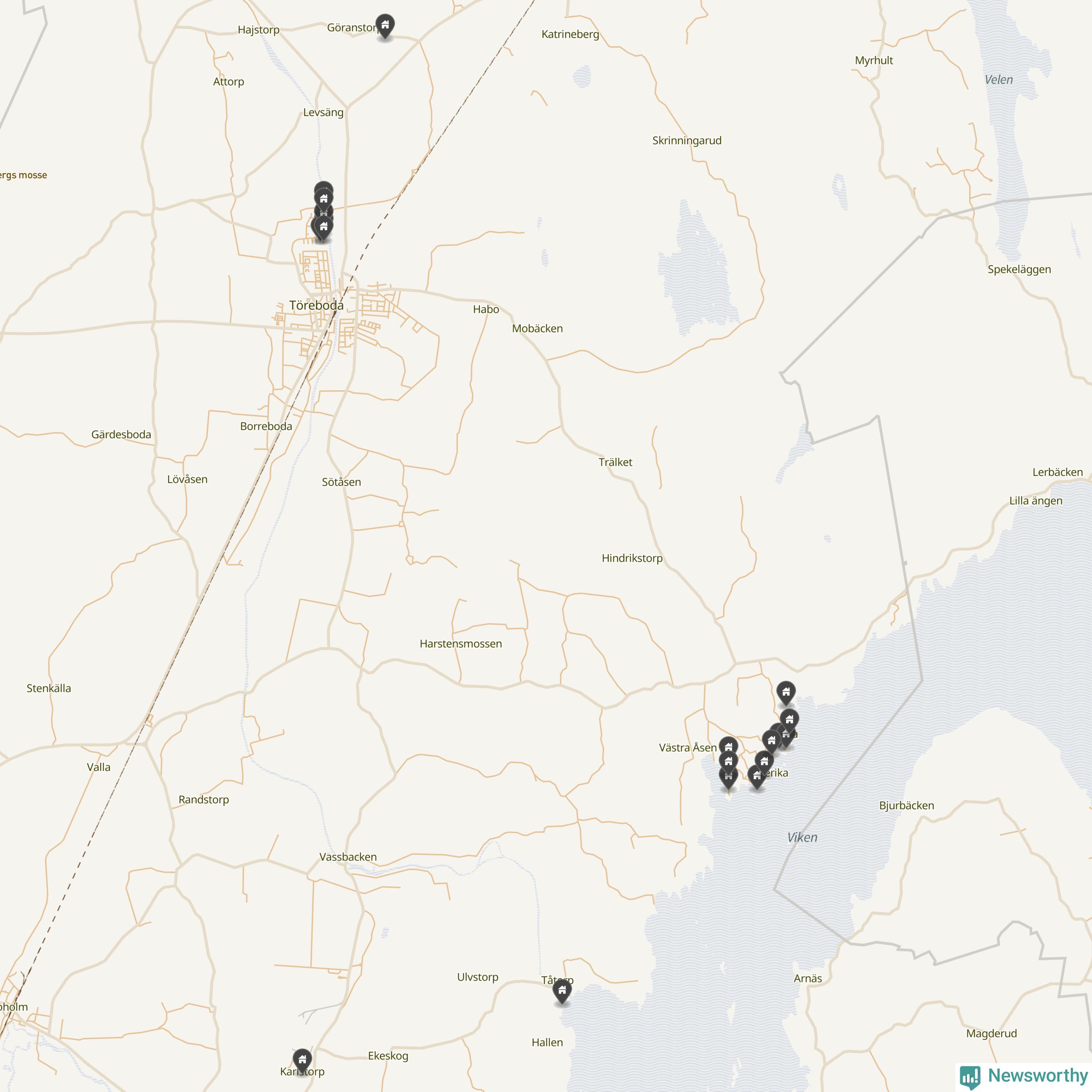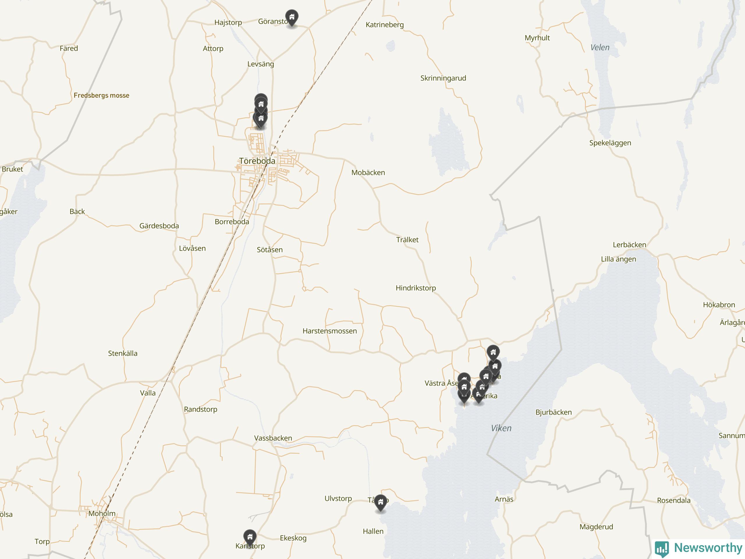 De 100 högst taxerade småhusfastigheterna i Töreboda har ett snittvärde på 2,3 miljoner kronor, vilket är omkring fyra miljoner lägre än snittet för alla kommuners 100 högst taxerade småhus. Det visar Newsworthys genomgång av kommunernas högst taxerade småhusfastigheter, som sammanställts med hjälp av data från The intelligence company.