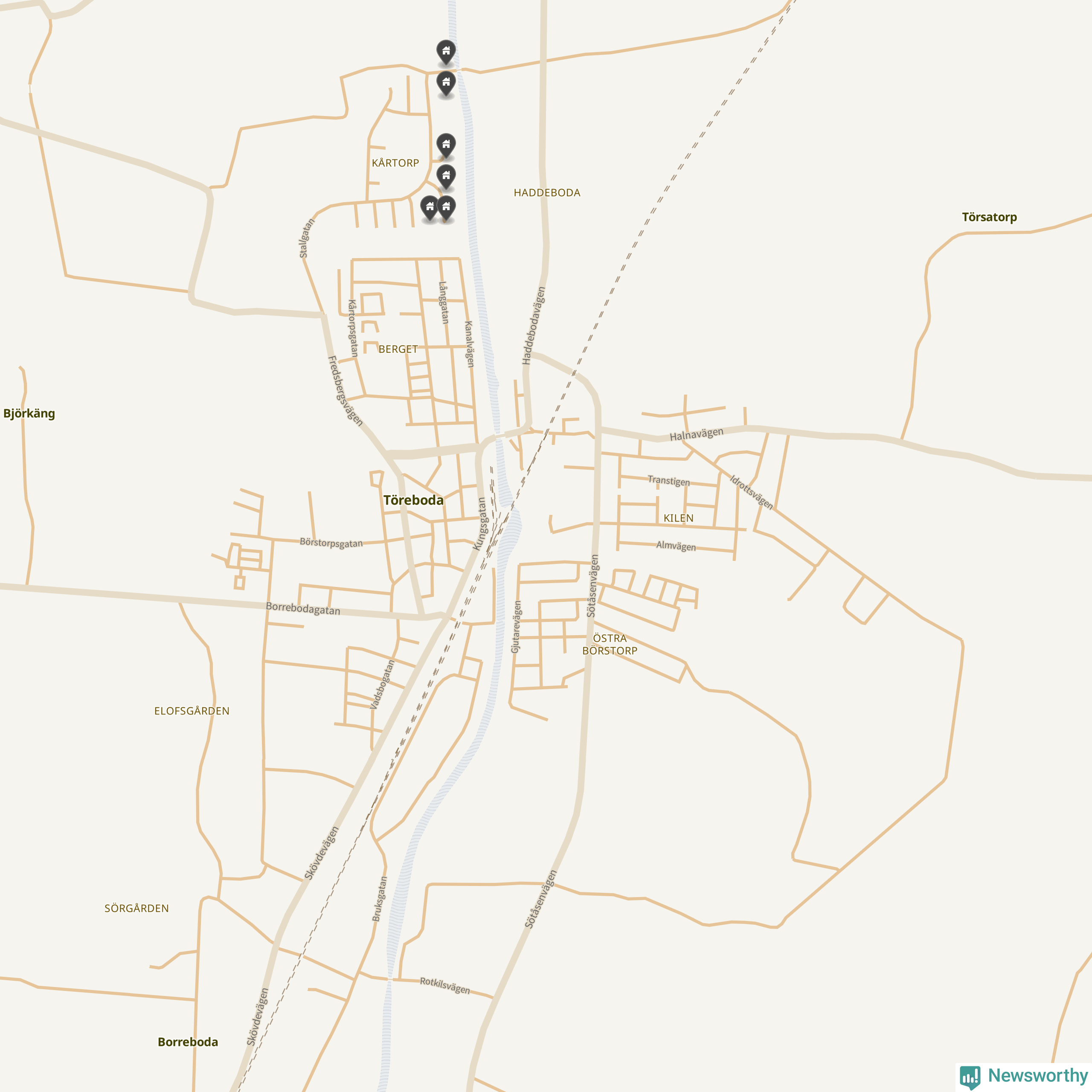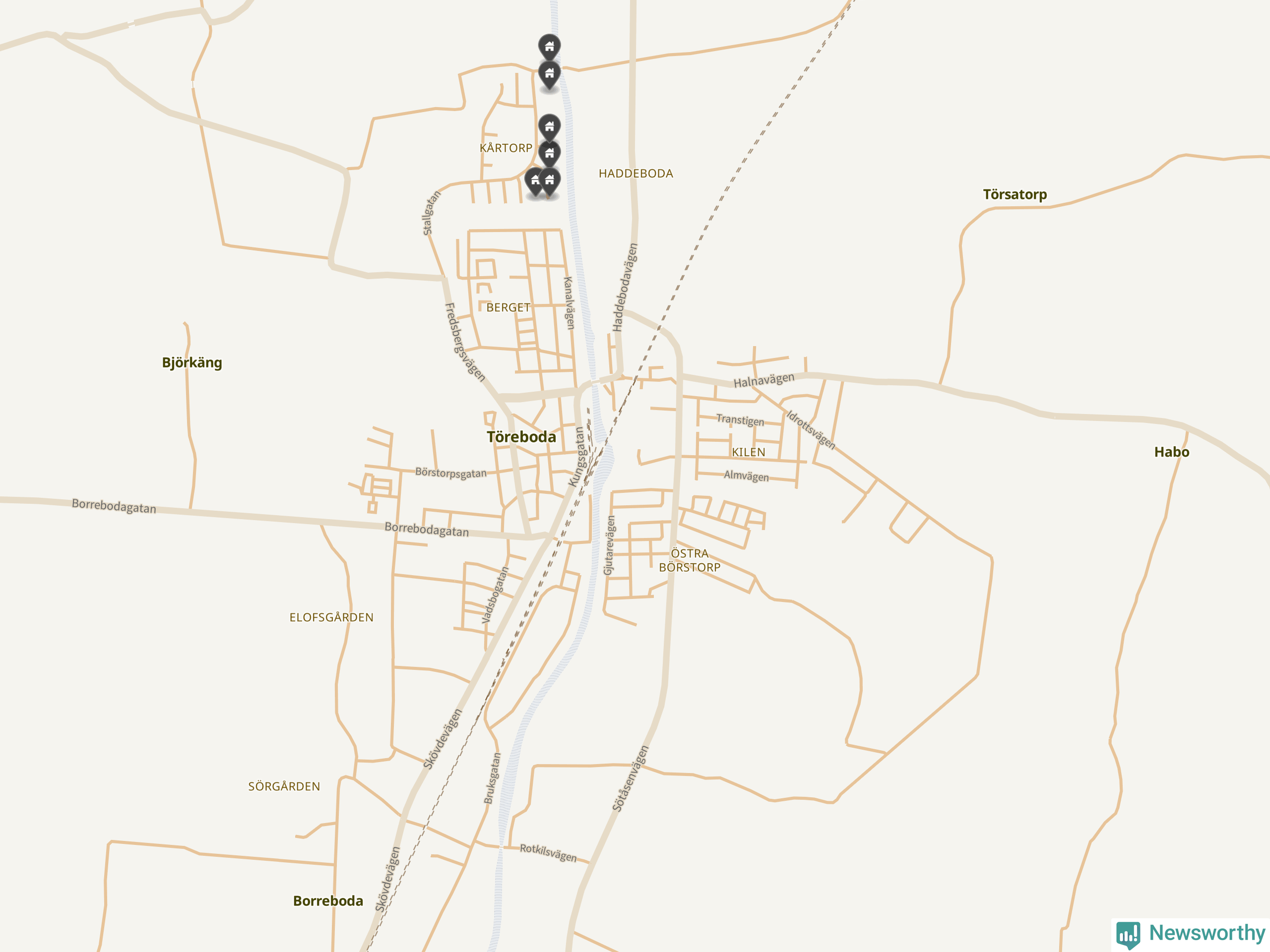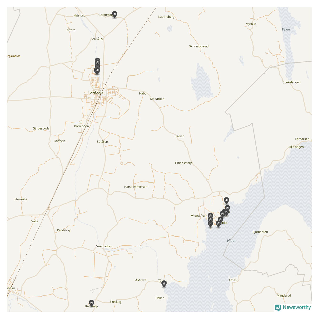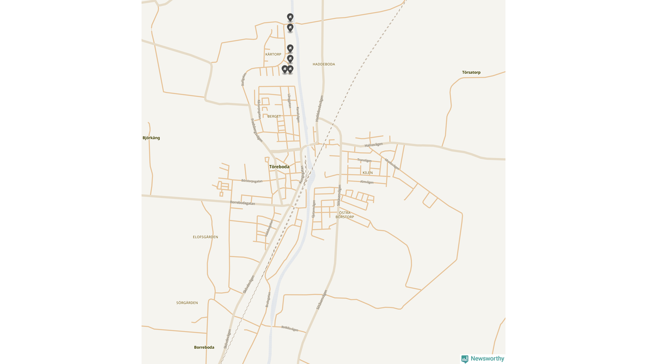 De 100 högst taxerade småhusfastigheterna i Töreboda har ett snittvärde på 2,3 miljoner kronor, vilket är omkring fyra miljoner lägre än snittet för alla kommuners 100 högst taxerade småhus. Det visar Newsworthys genomgång av kommunernas högst taxerade småhusfastigheter, som sammanställts med hjälp av data från The intelligence company.
