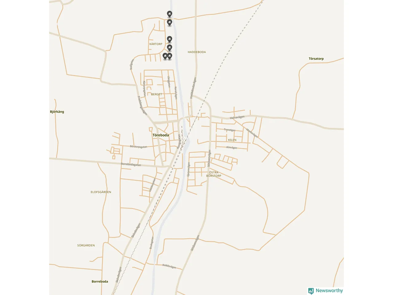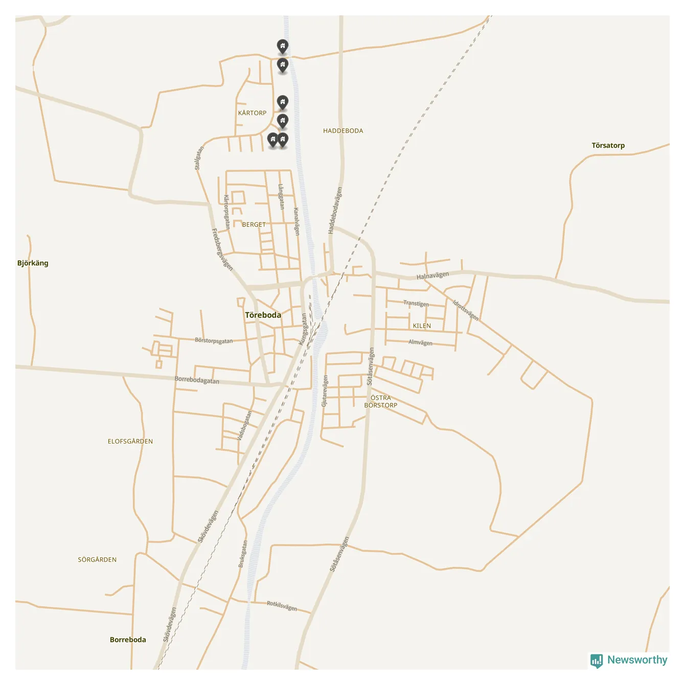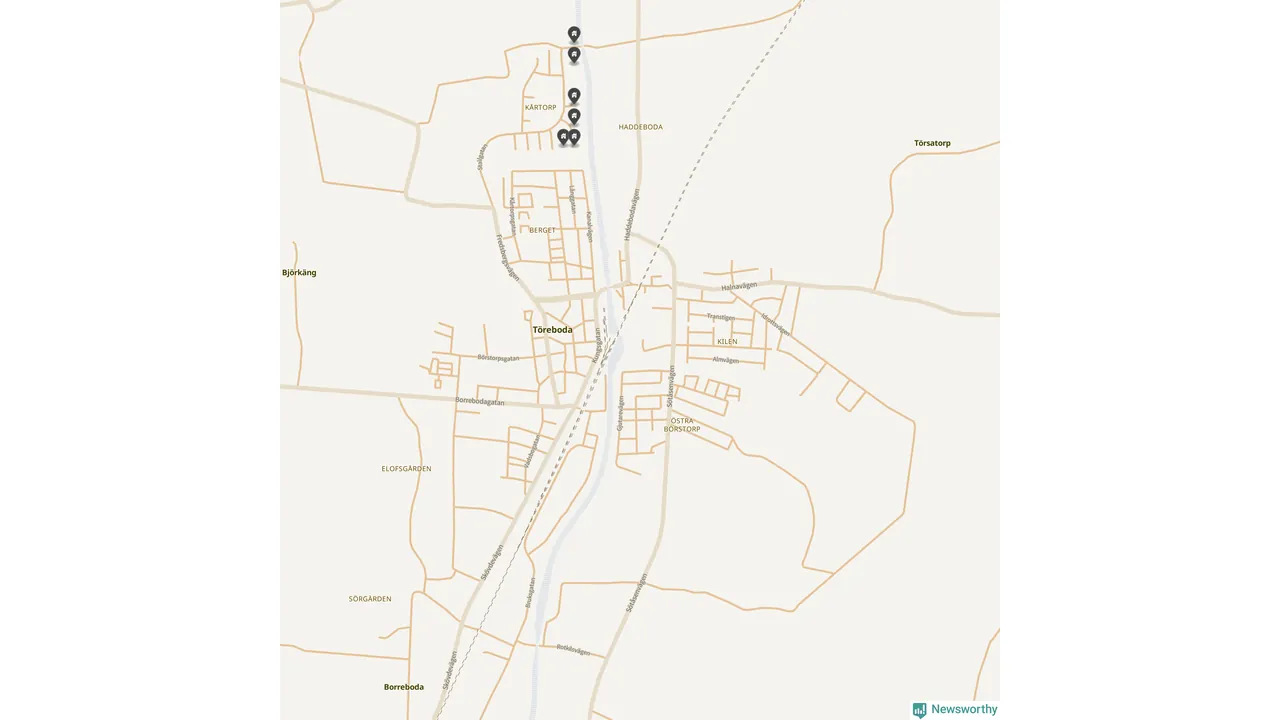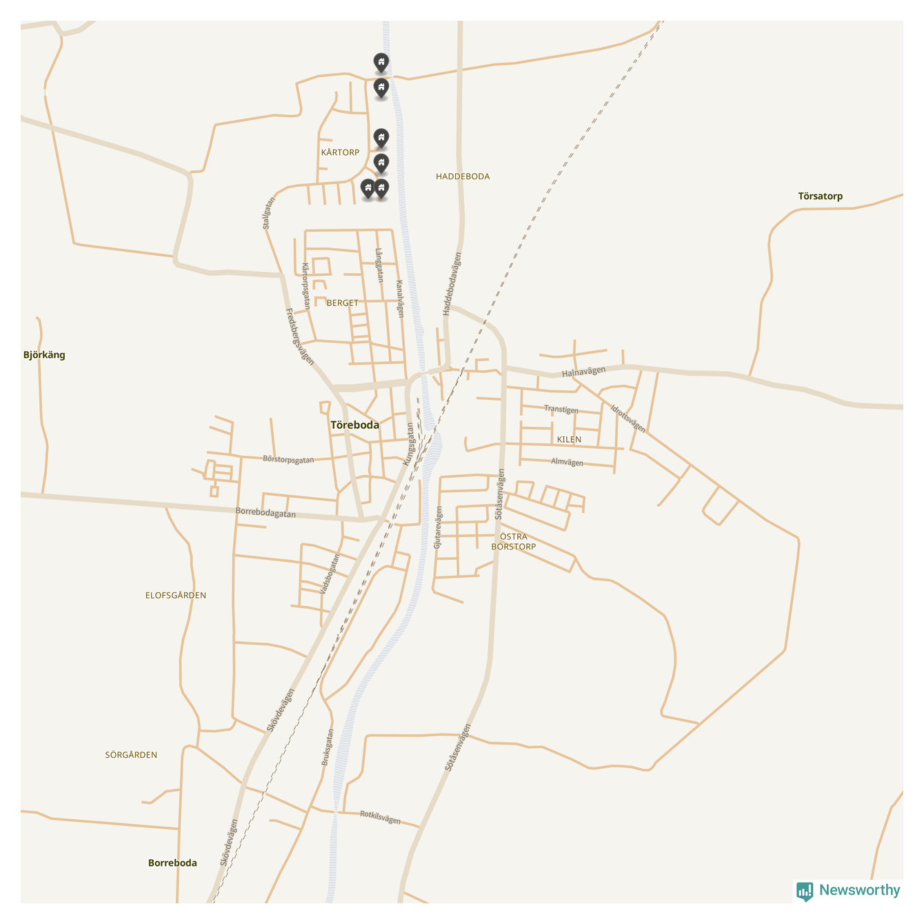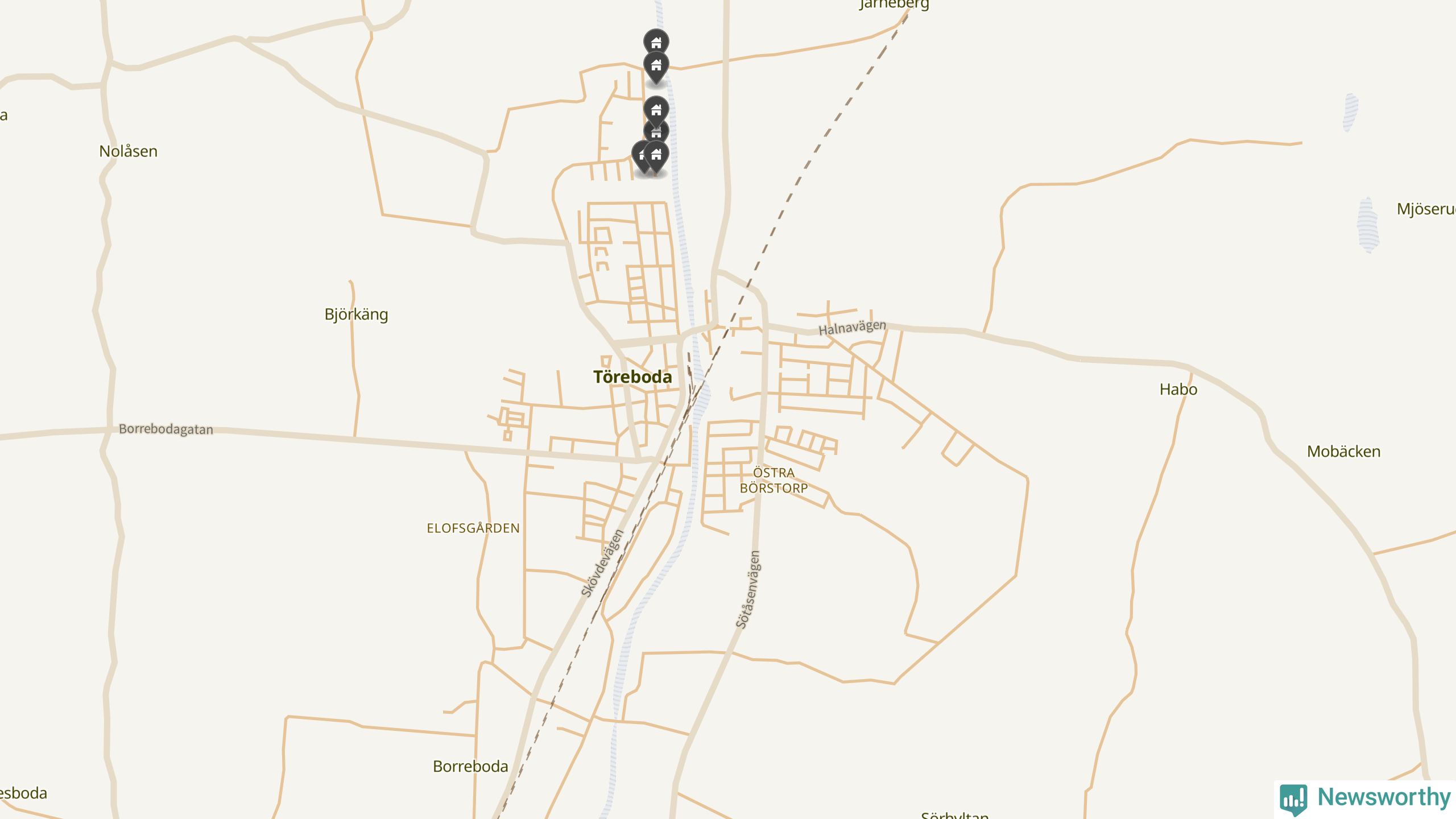 De 100 högst taxerade småhusfastigheterna i Töreboda har ett snittvärde på 2,3 miljoner kronor, vilket är omkring fyra miljoner lägre än snittet för alla kommuners 100 högst taxerade småhus. Det visar Newsworthys genomgång av kommunernas högst taxerade småhusfastigheter, som sammanställts med hjälp av data från The intelligence company.