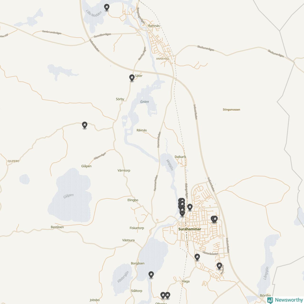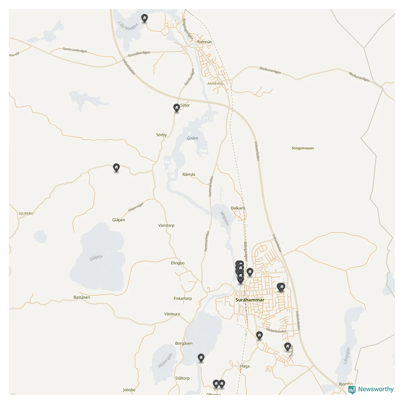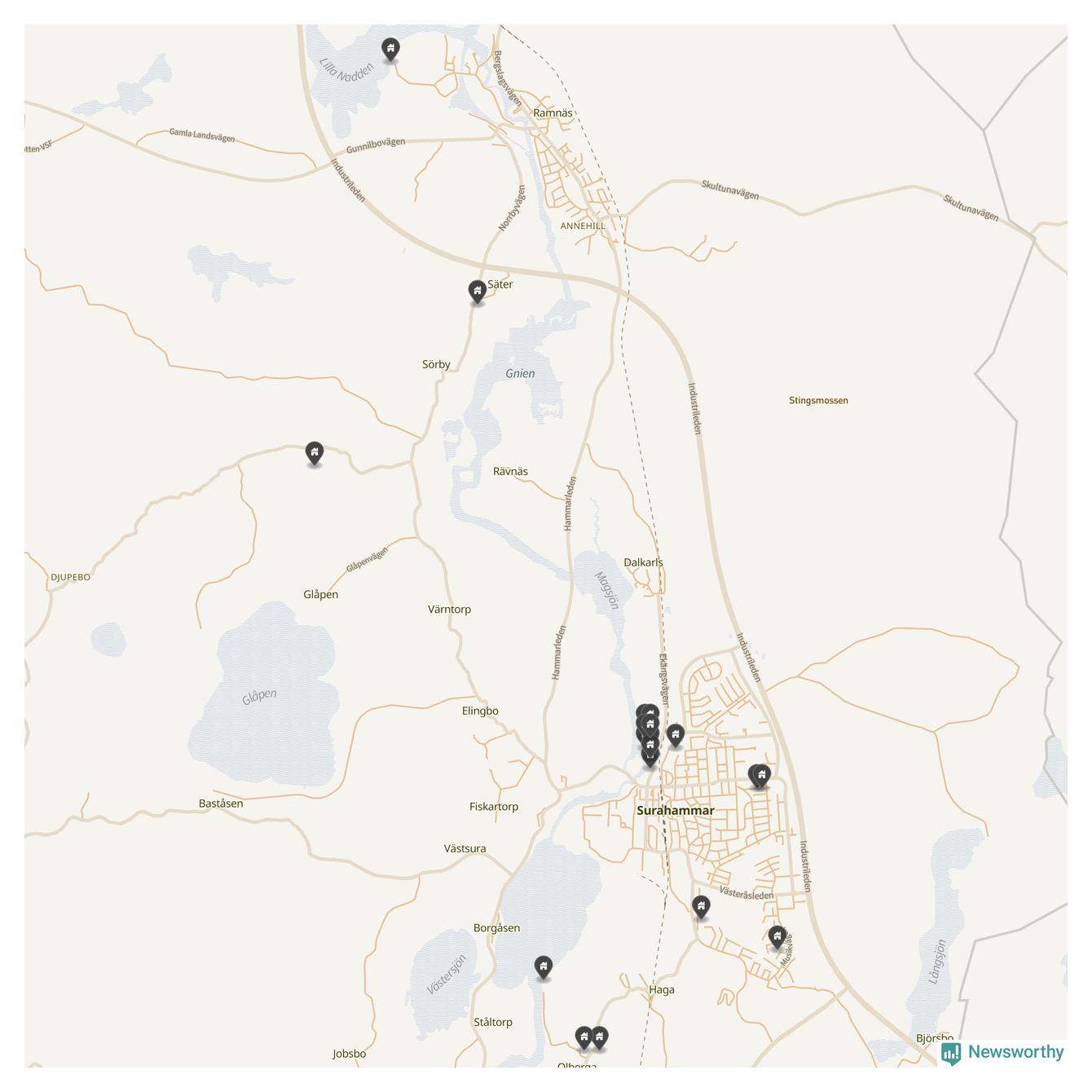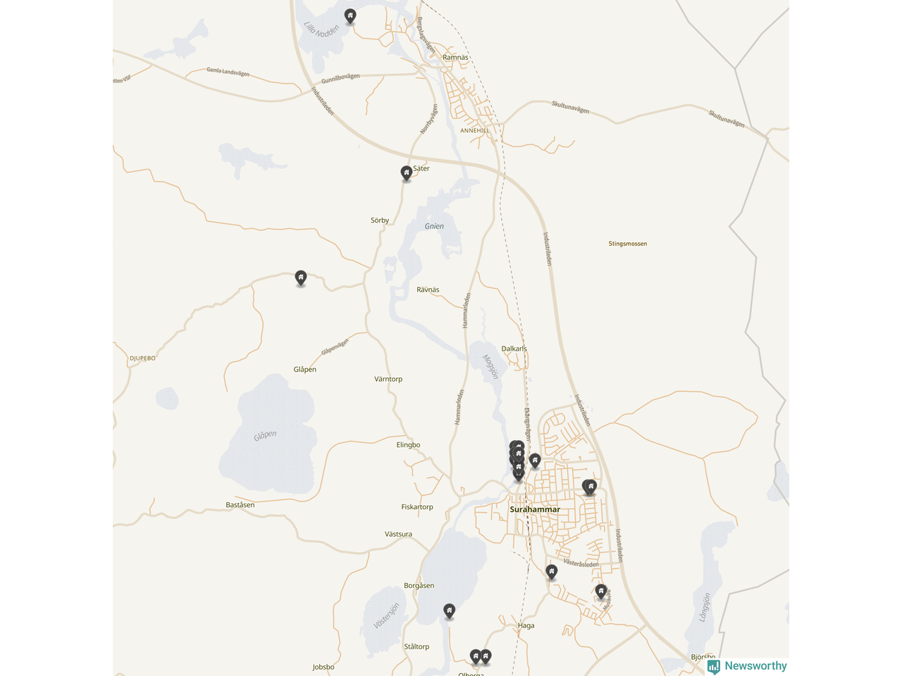 51 | Surahammar Surahammar 10:162 | Ekängsvägen 7 | 2,7 miljoner | 4 994 m² | Visa |