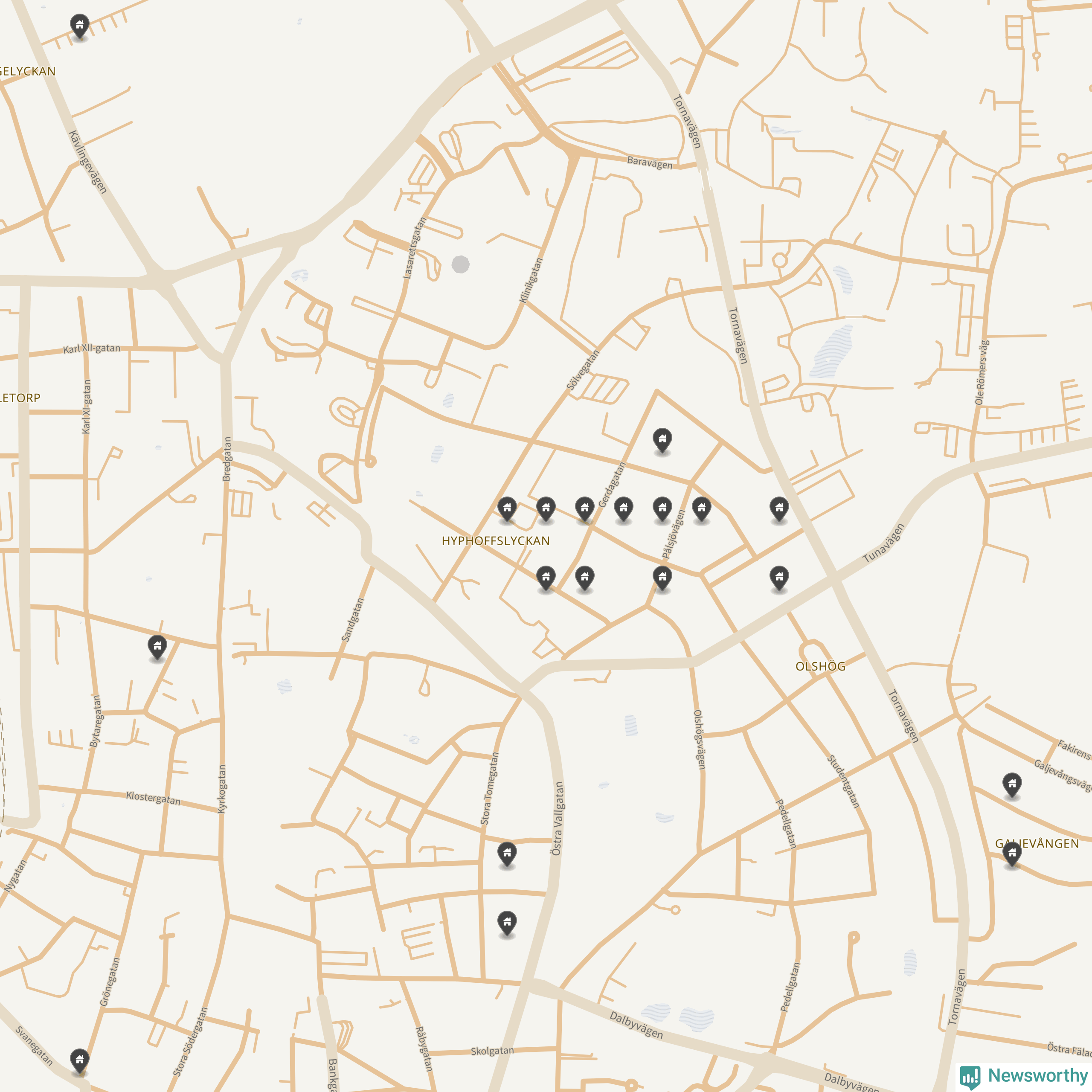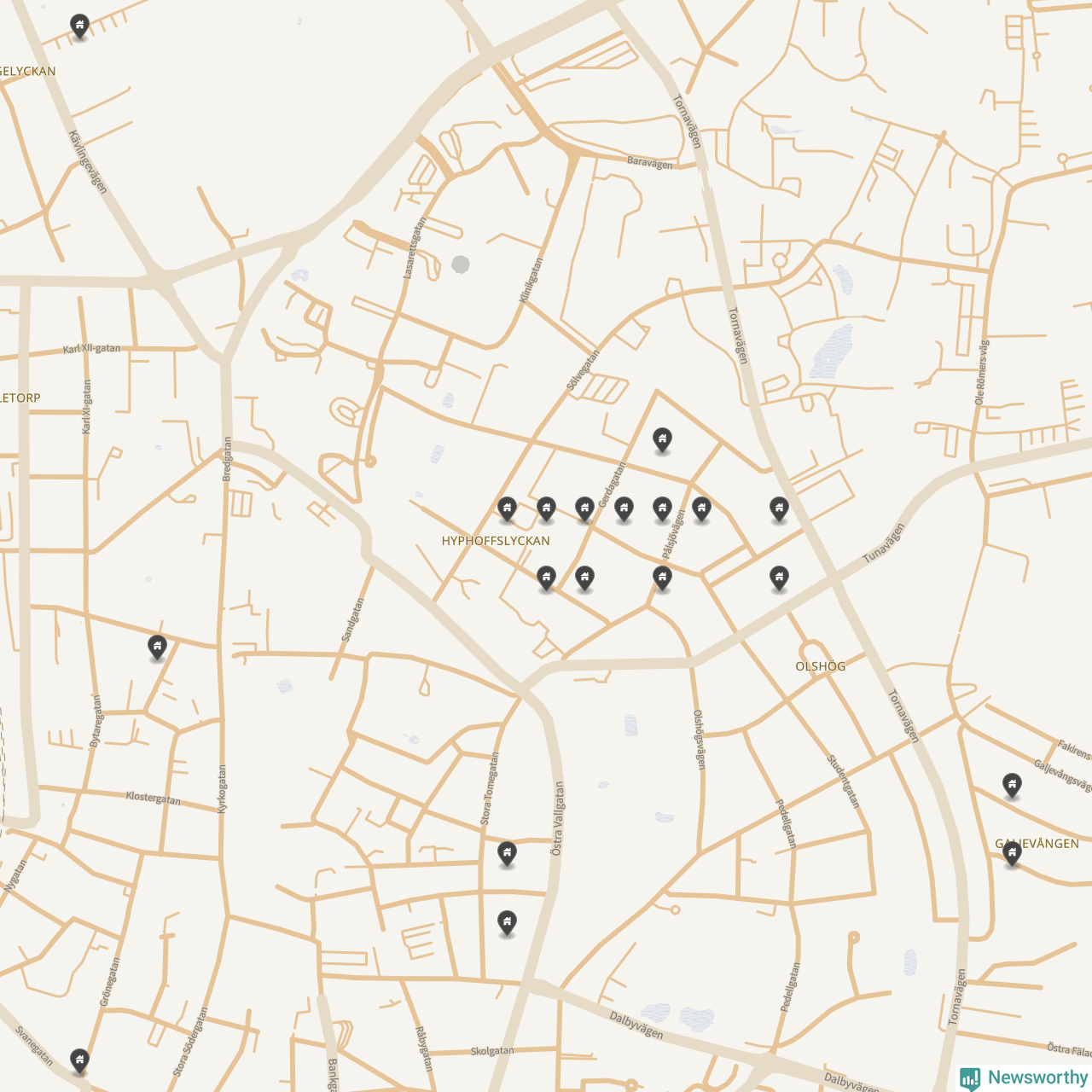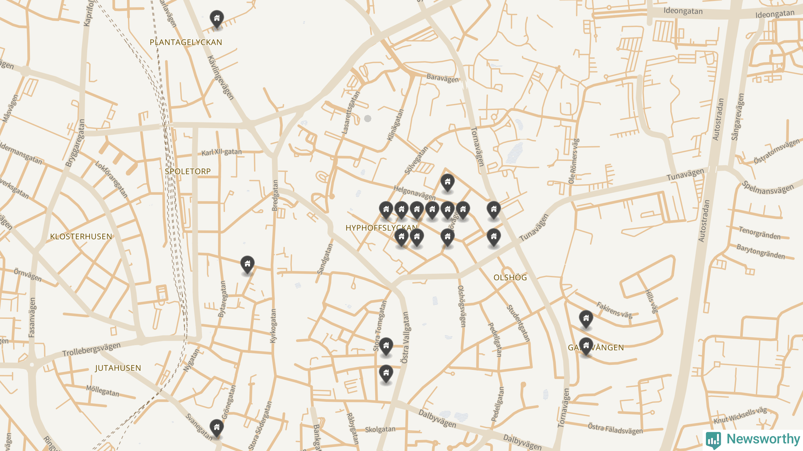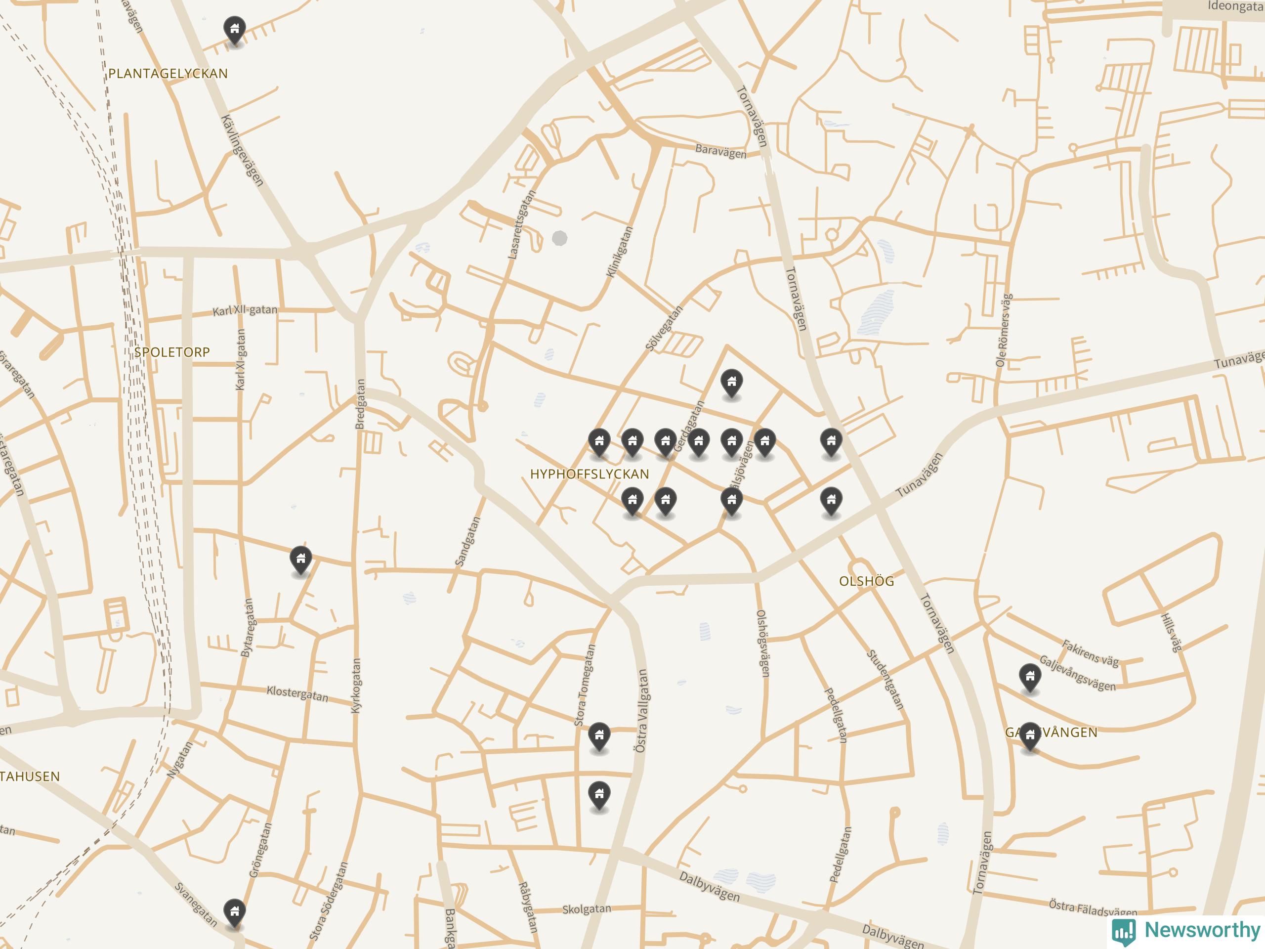 En markör per fastighet. Samtaxerade fastigheter visas bara en gång. Notera att det är centrumpunkten för fastigheterna som visas, vilket kan vara missvisande för stora fastigheter.