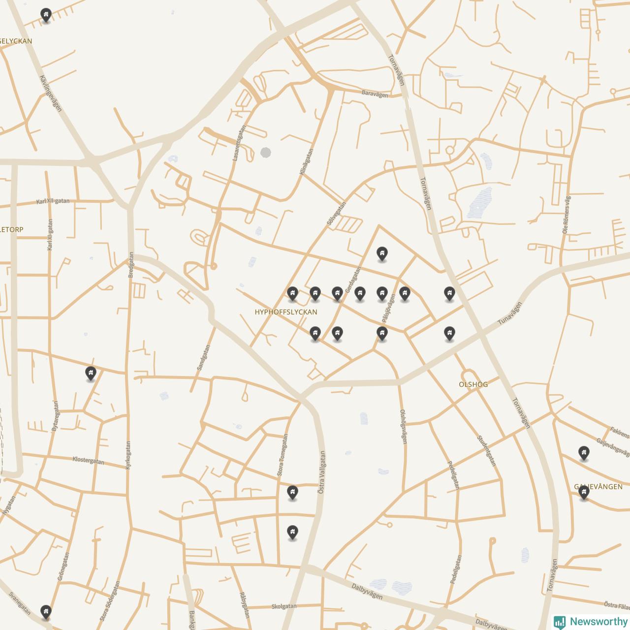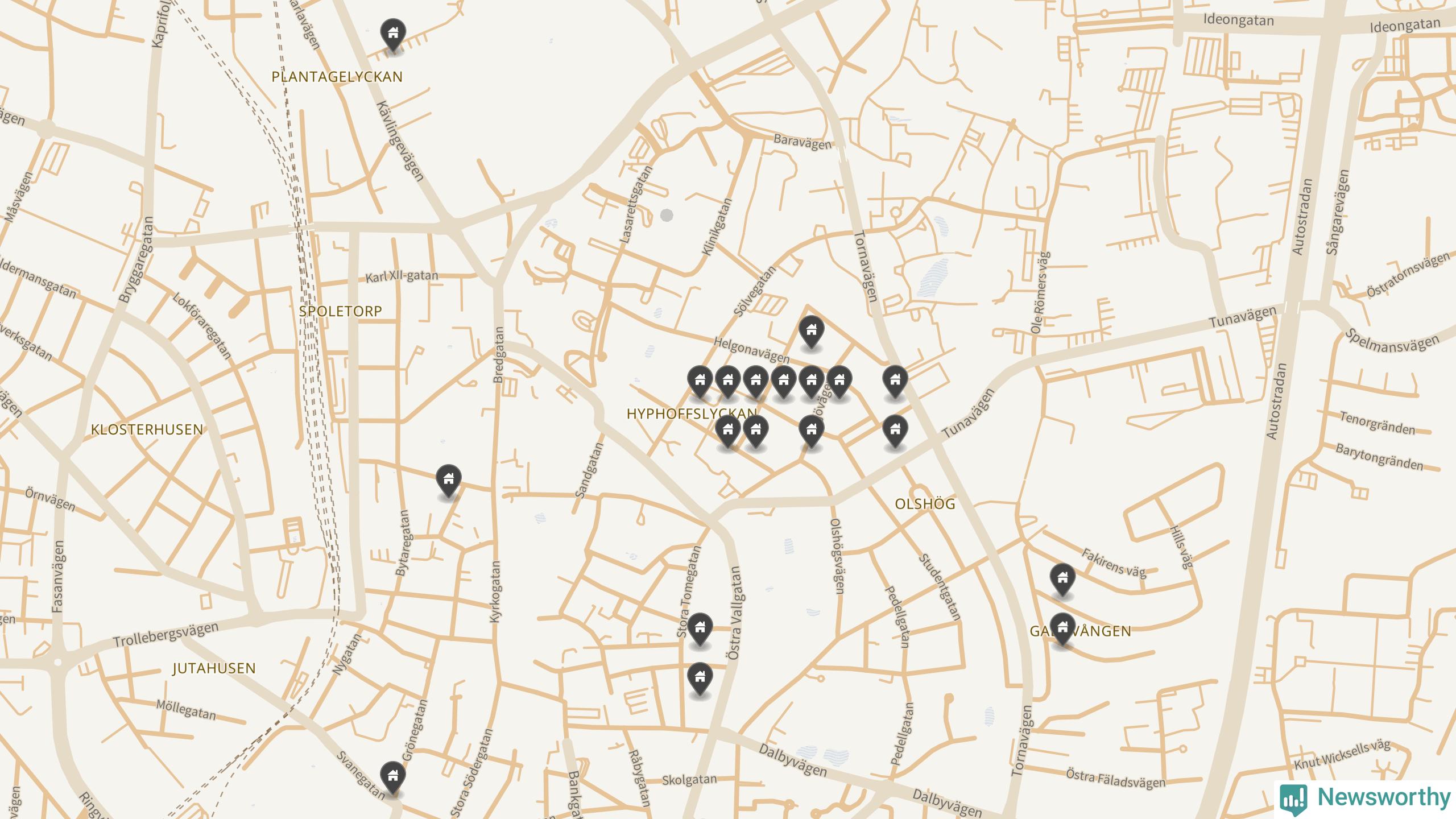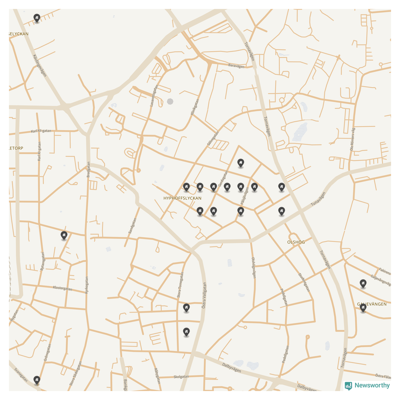 En markör per fastighet. Samtaxerade fastigheter visas bara en gång. Notera att det är centrumpunkten för fastigheterna som visas, vilket kan vara missvisande för stora fastigheter.
