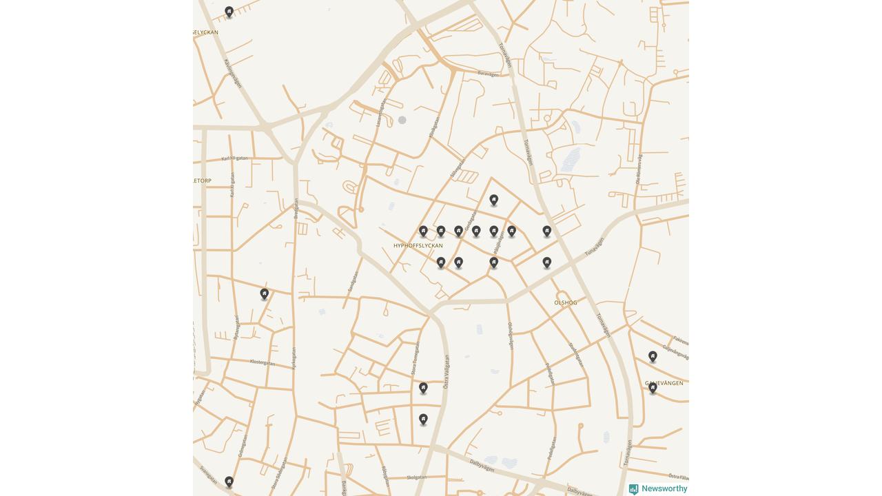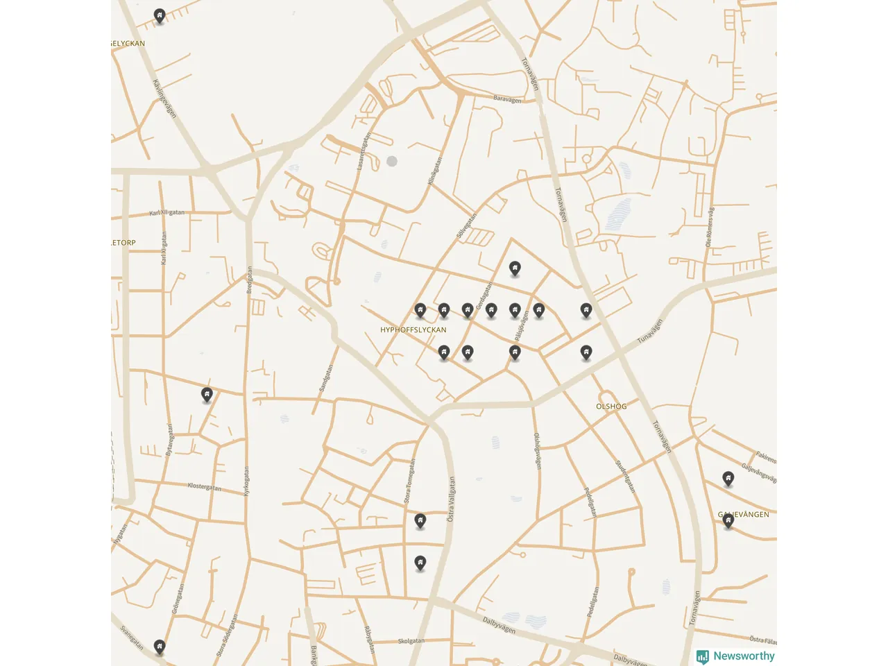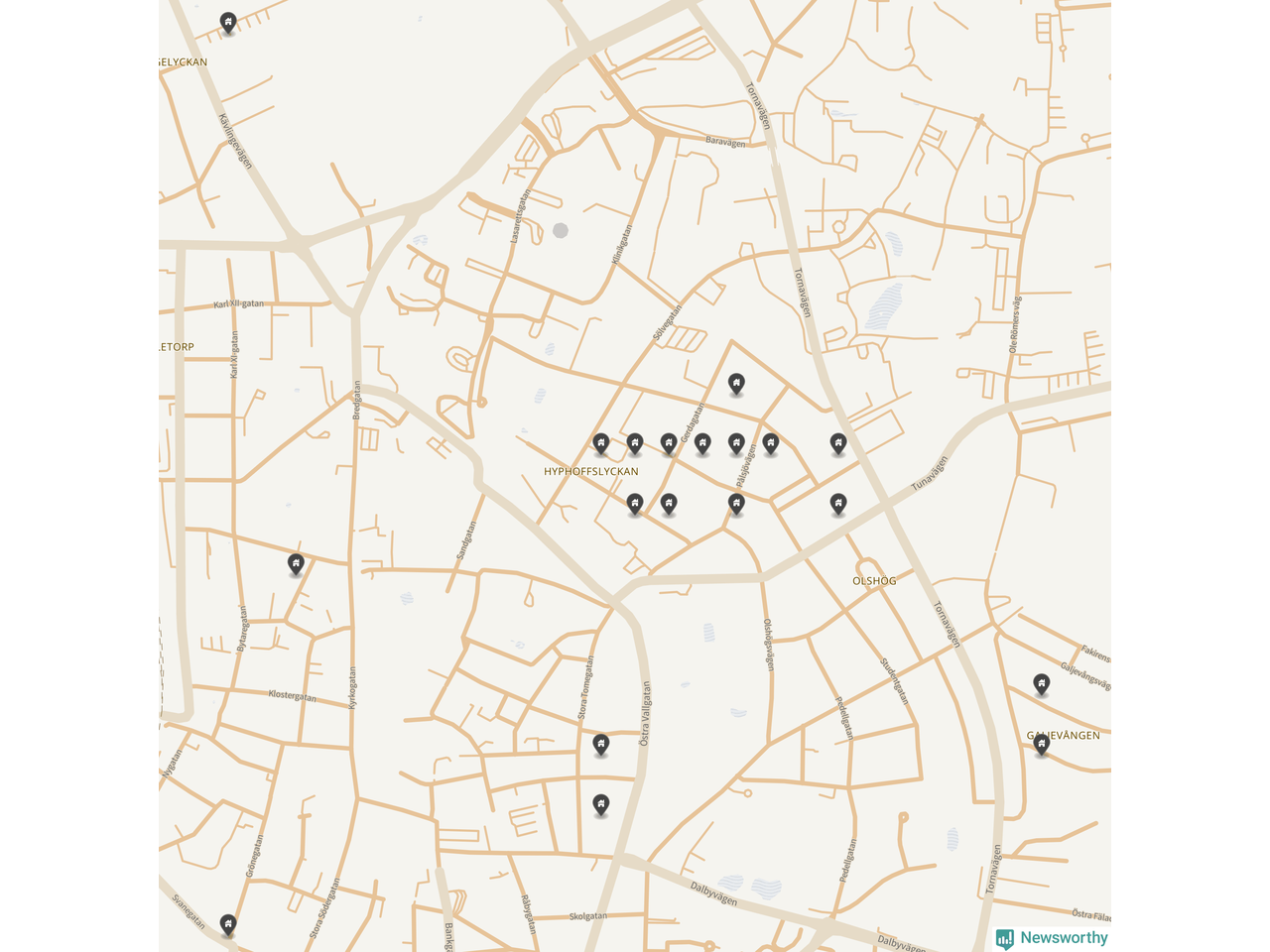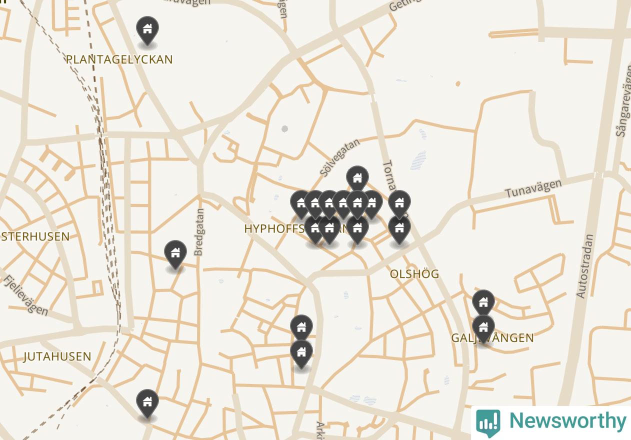 En markör per fastighet. Samtaxerade fastigheter visas bara en gång. Notera att det är centrumpunkten för fastigheterna som visas, vilket kan vara missvisande för stora fastigheter.