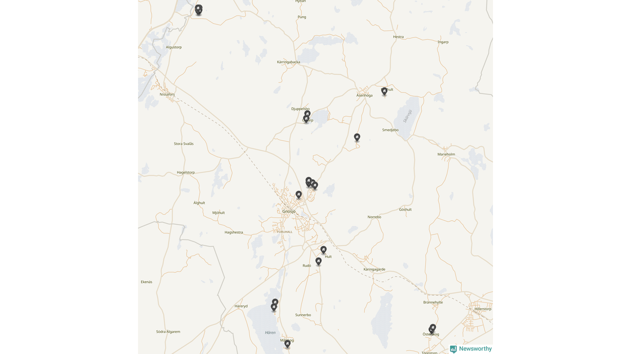86 | Gnosjö Töllstorp 1:649 | Ingen uppgift | 2,2 miljoner | 1 306 m² | Visa |