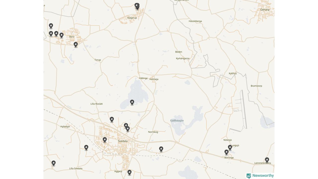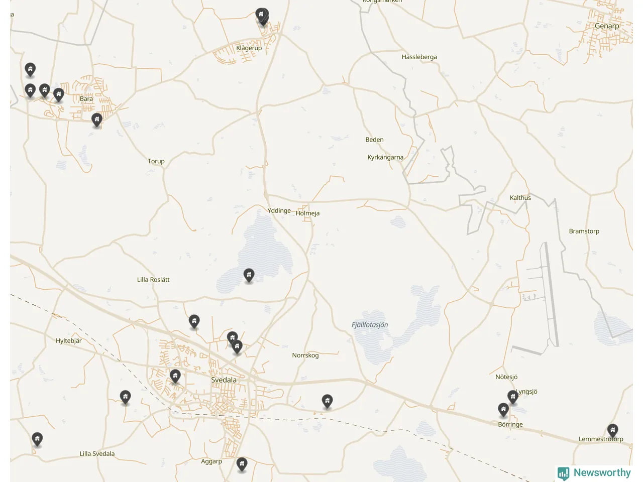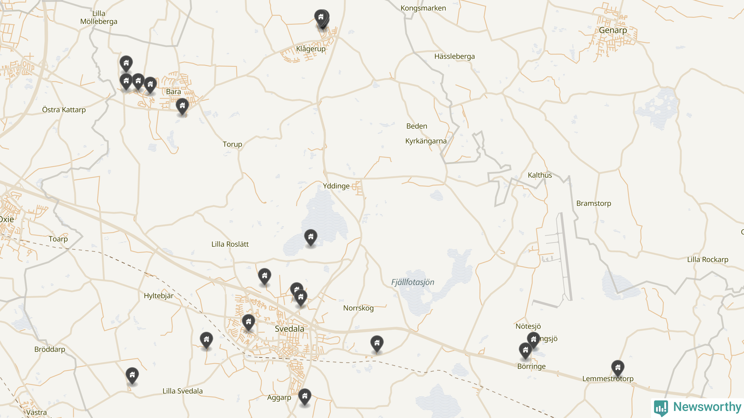 | 22 | Svedala Svedala 129:14 | Börringevägen 109 | 6,9 miljoner | 6 250 m² | Visa |