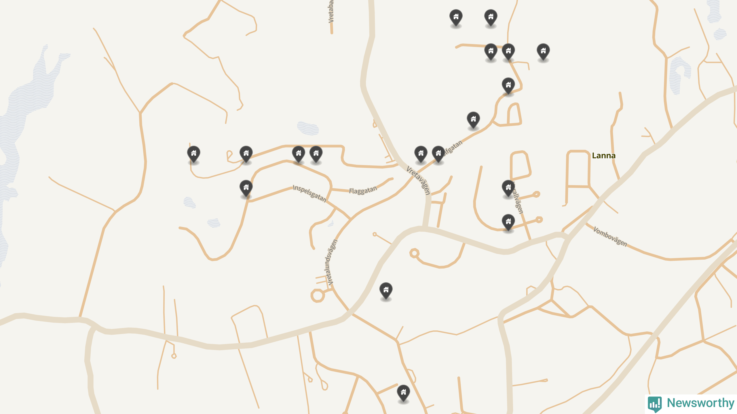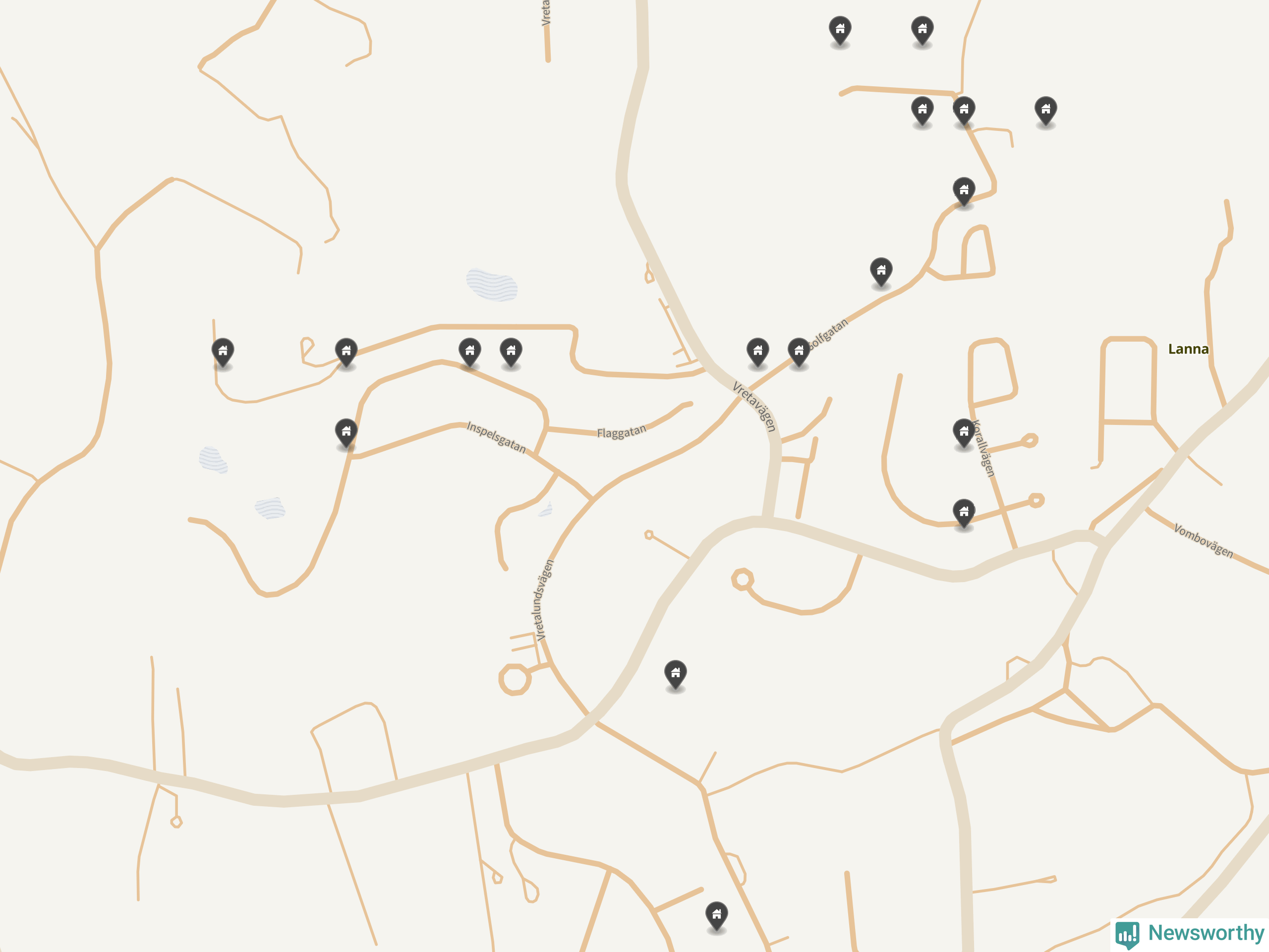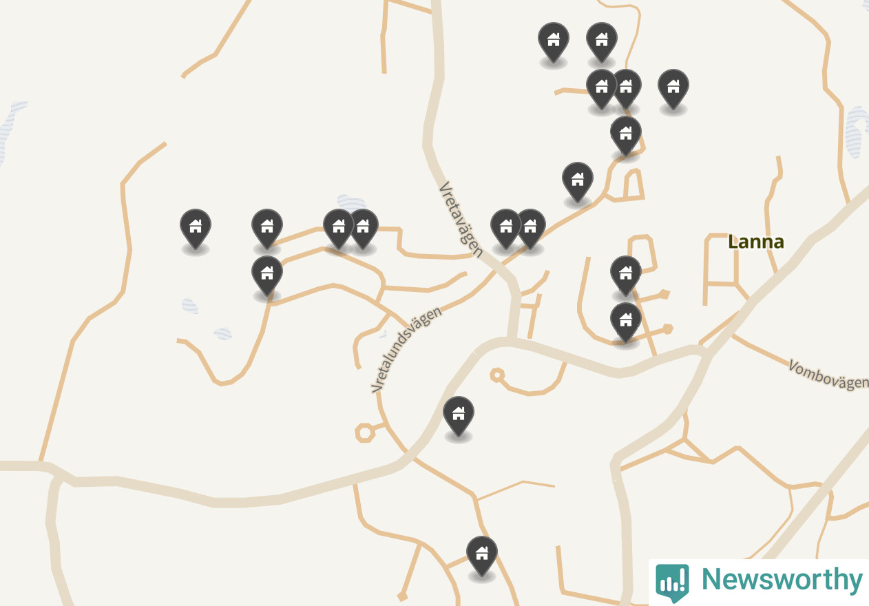 En markör per fastighet. Samtaxerade fastigheter visas bara en gång. Notera att det är centrumpunkten för fastigheterna som visas, vilket kan vara missvisande för stora fastigheter.