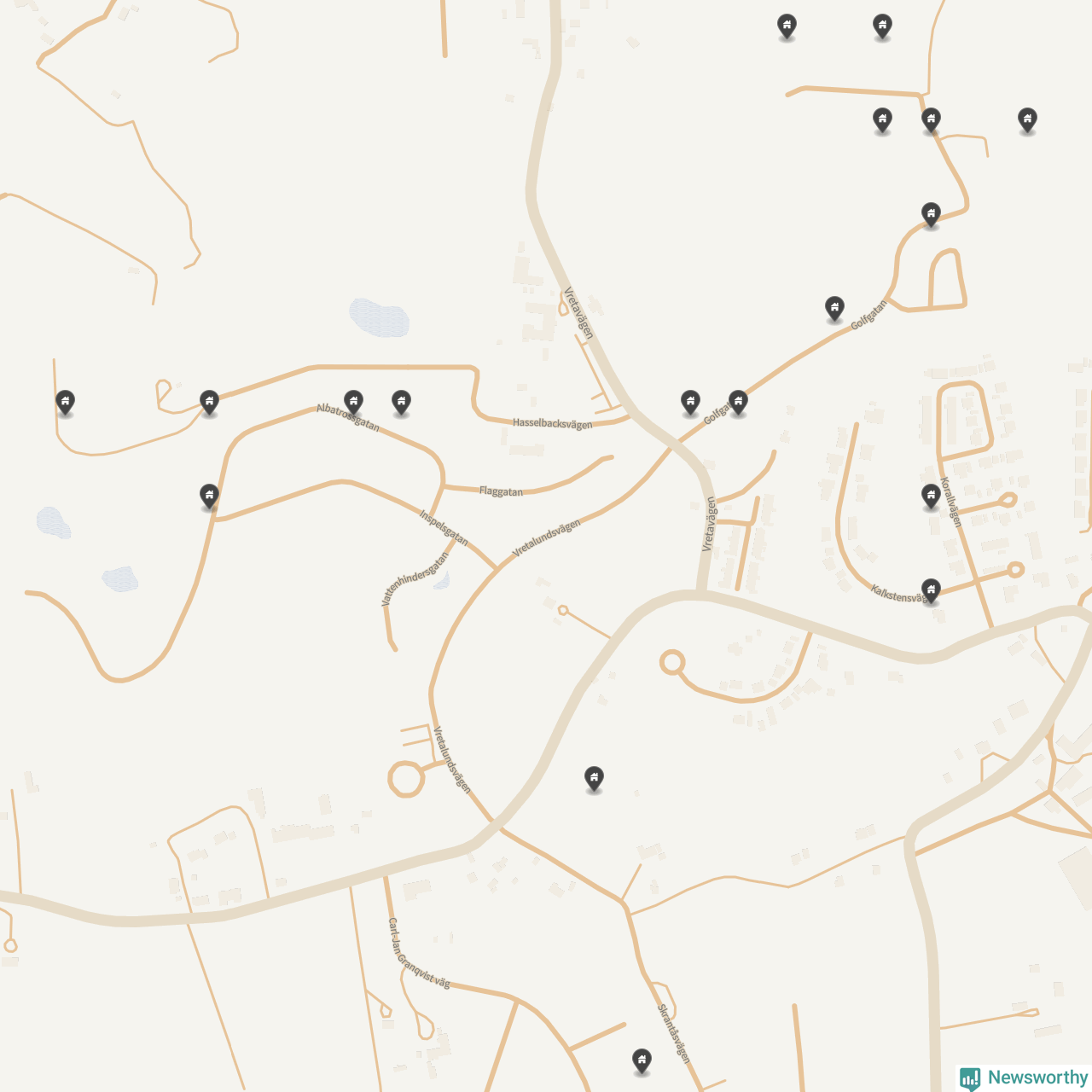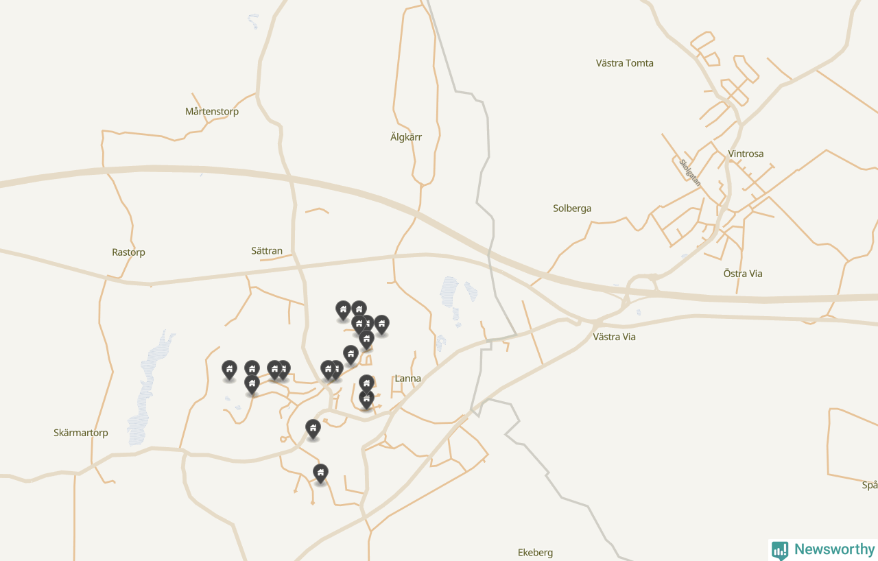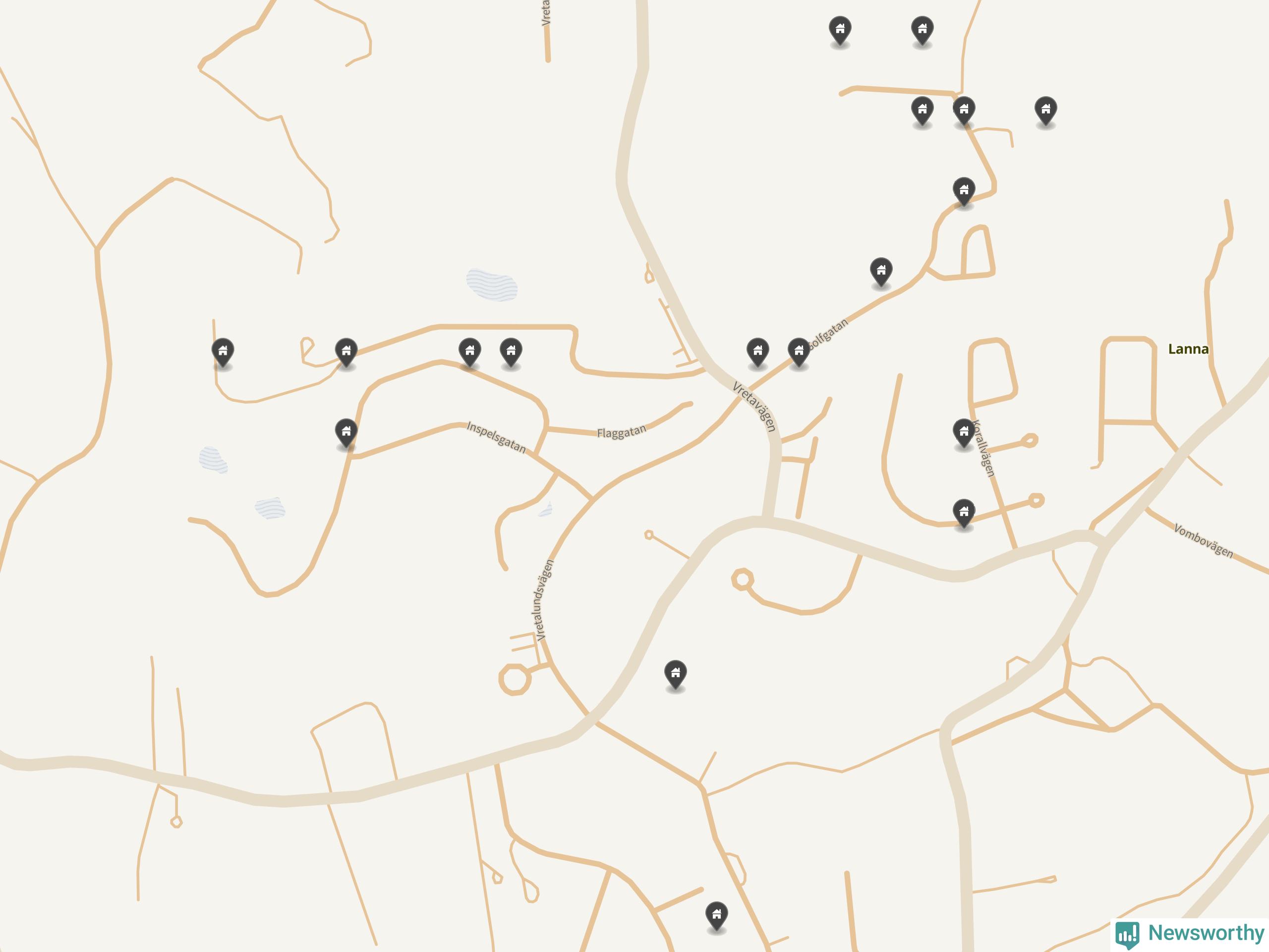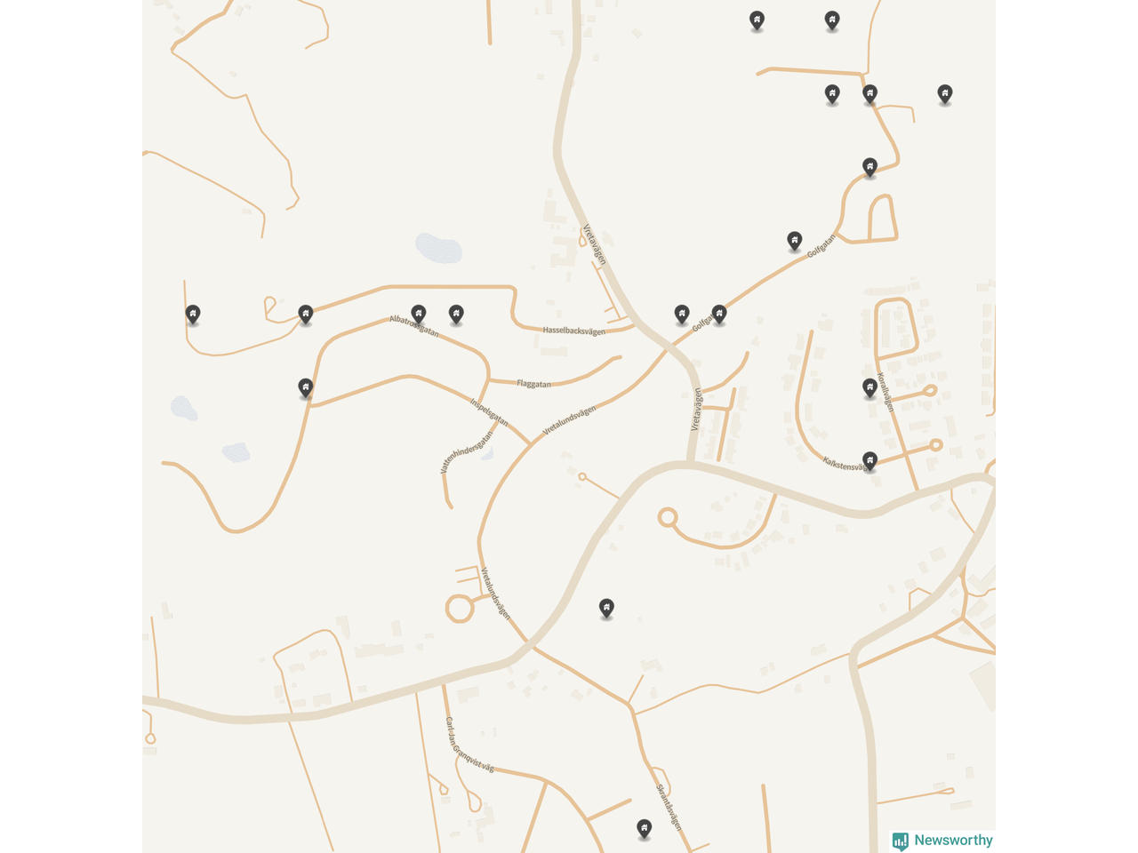En markör per fastighet. Samtaxerade fastigheter visas bara en gång. Notera att det är centrumpunkten för fastigheterna som visas, vilket kan vara missvisande för stora fastigheter.