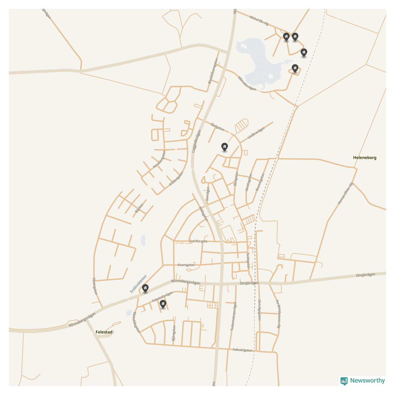 En markör per fastighet. Samtaxerade fastigheter visas bara en gång. Notera att det är centrumpunkten för fastigheterna som visas, vilket kan vara missvisande för stora fastigheter.