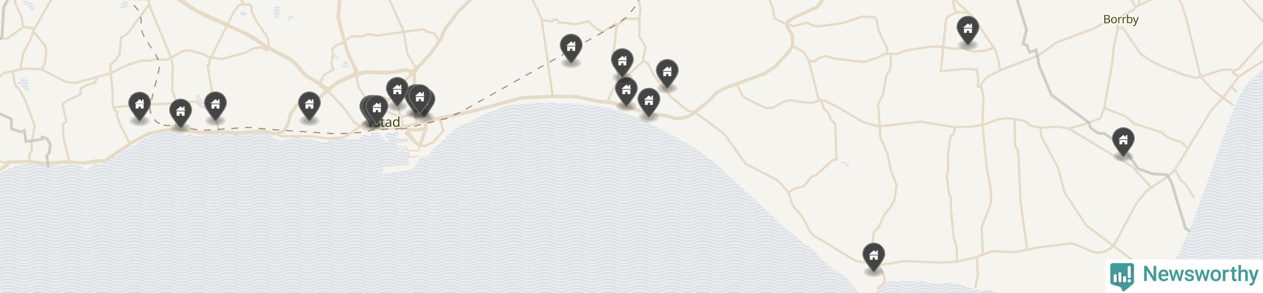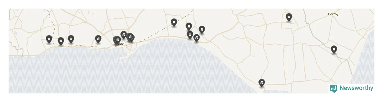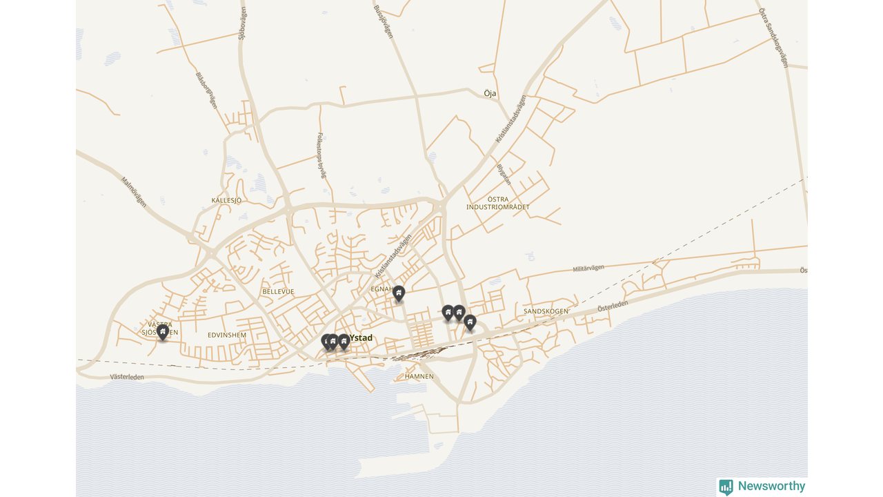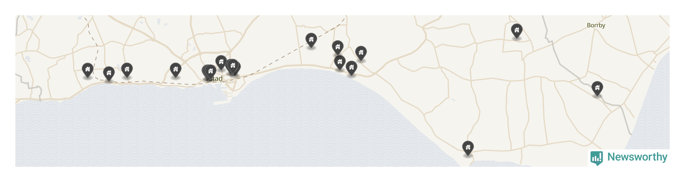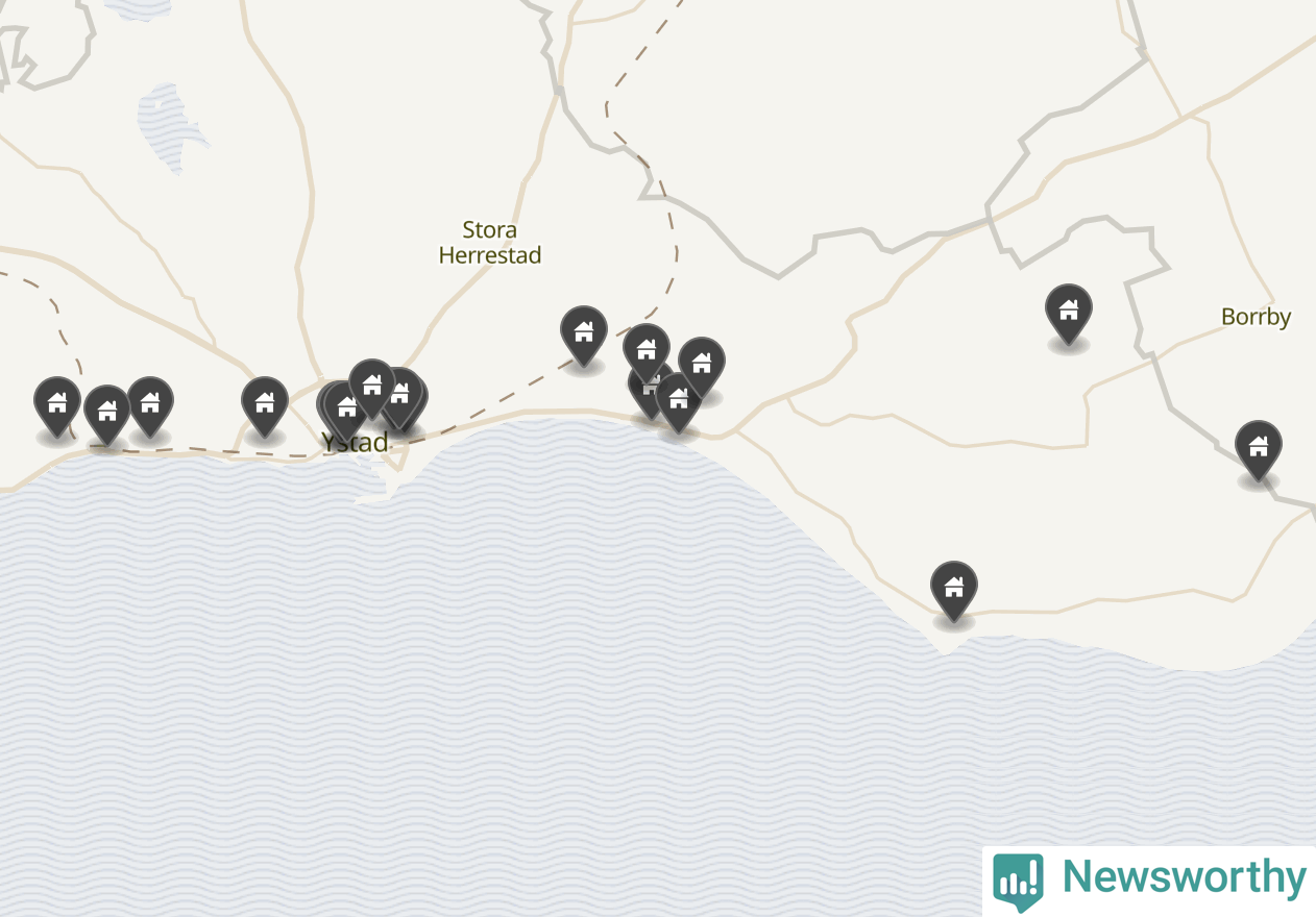 | 1 | Ystad Kåseberga 14:114 | Kasevägen 23 | 16 miljoner | 5 598 m² | Visa |