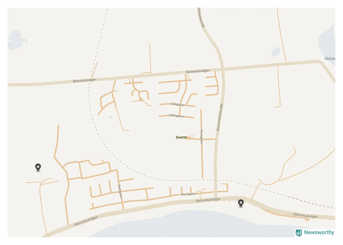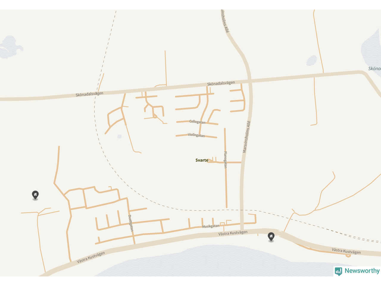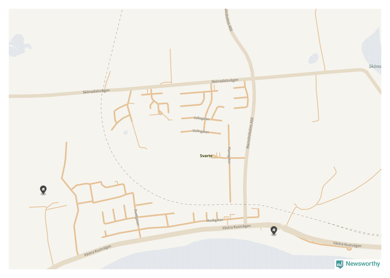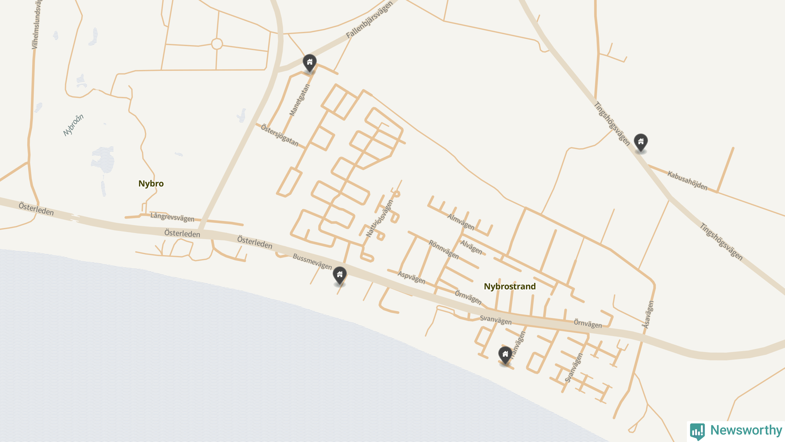 En markör per fastighet. Samtaxerade fastigheter visas bara en gång. Notera att det är centrumpunkten för fastigheterna som visas, vilket kan vara missvisande för stora fastigheter.