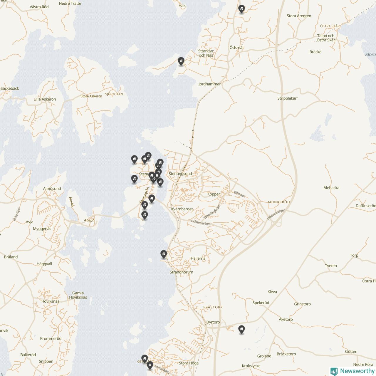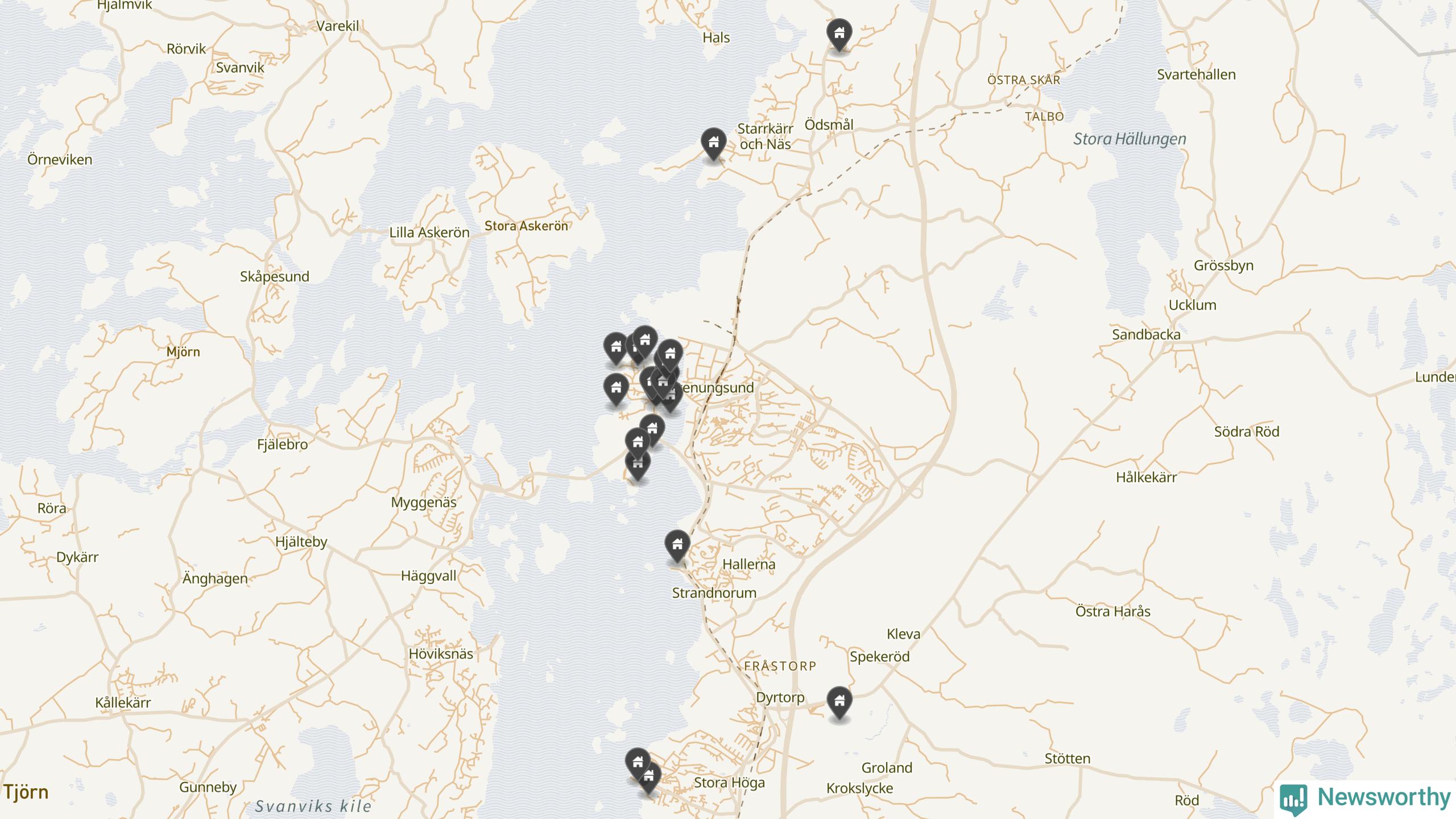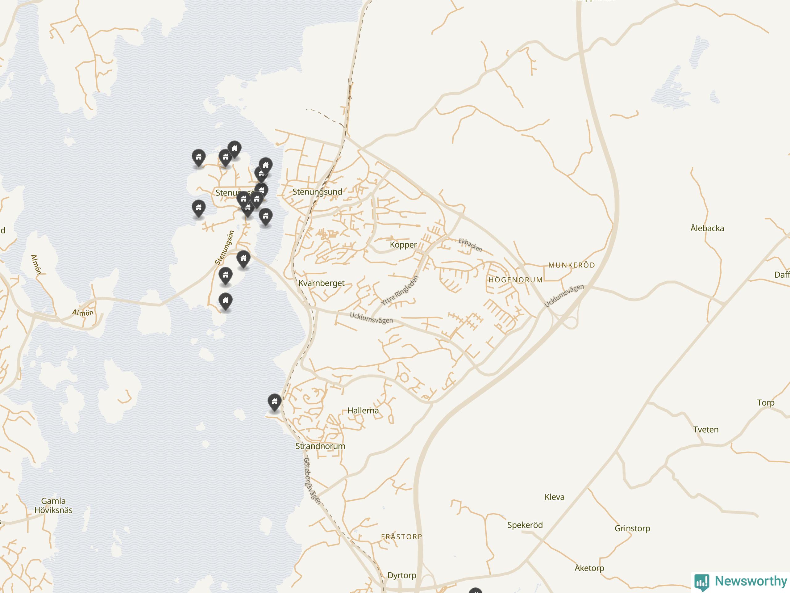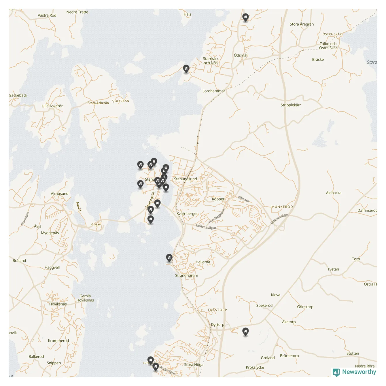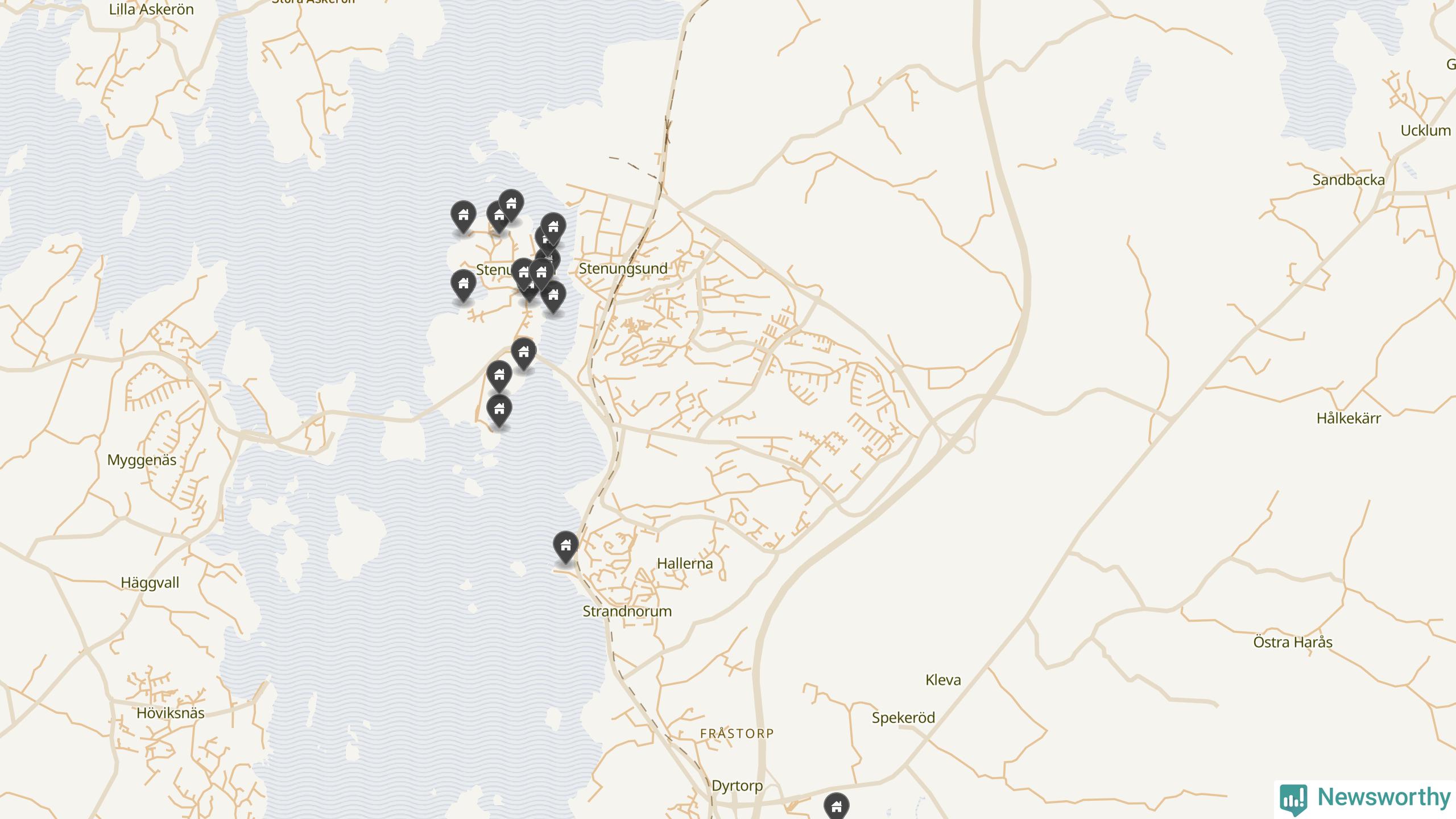 De 100 högst taxerade småhusfastigheterna i Stenungsund har ett snittvärde på nio miljoner kronor, vilket är omkring tre miljoner högre än snittet för alla kommuners 100 högst taxerade småhus. Det visar Newsworthys genomgång av kommunernas högst taxerade småhusfastigheter, som sammanställts med hjälp av data från The intelligence company.
