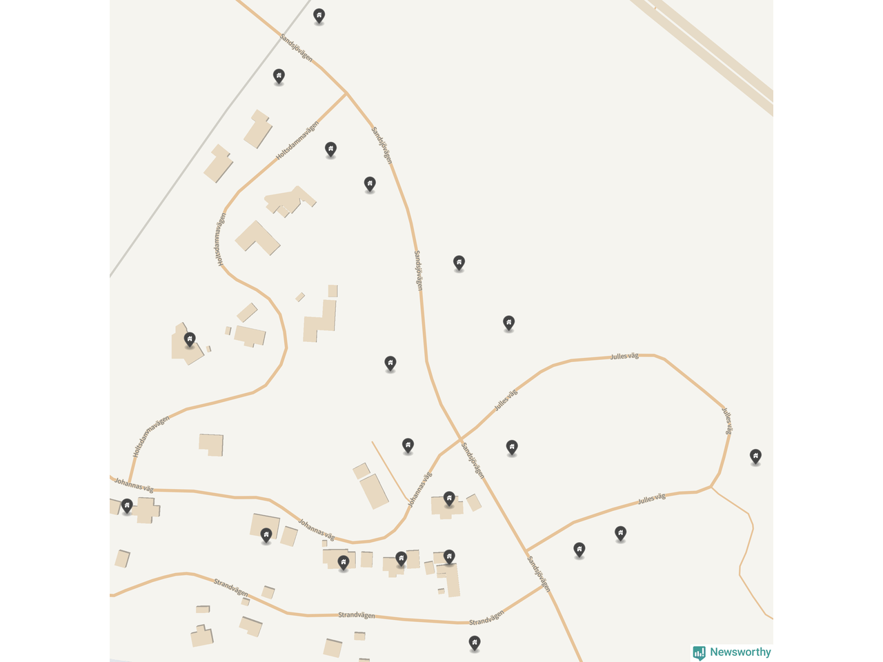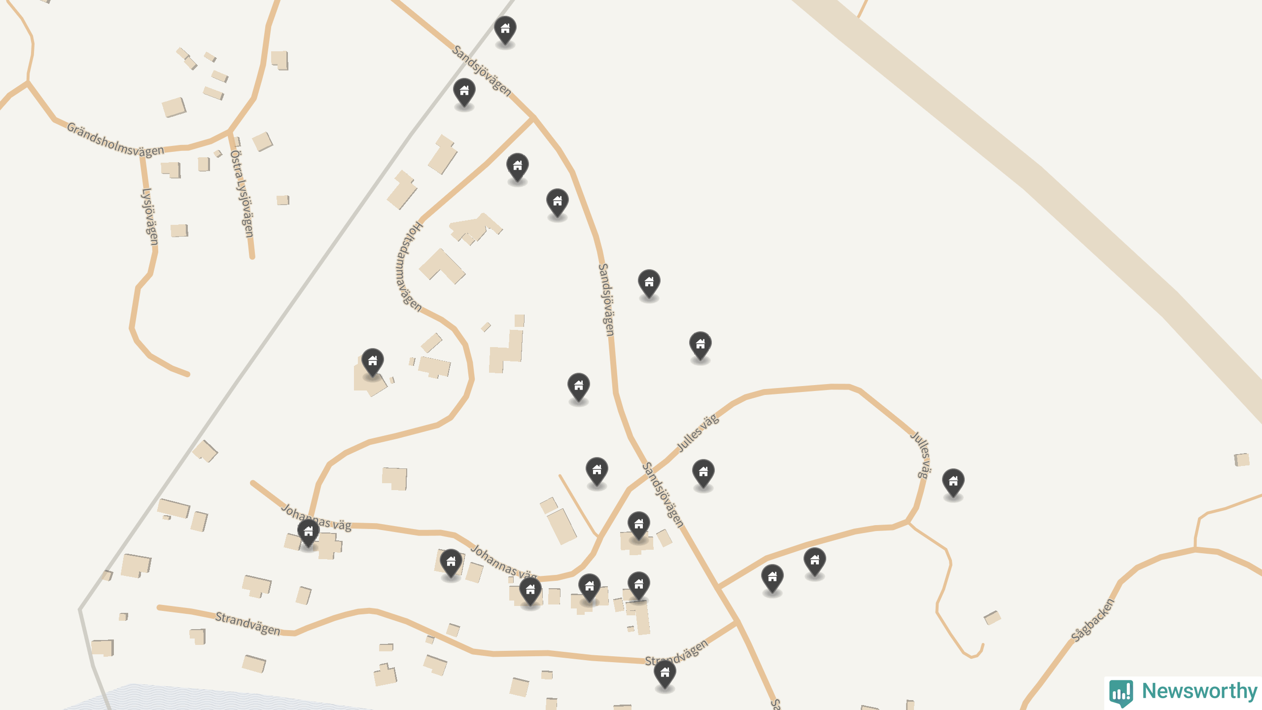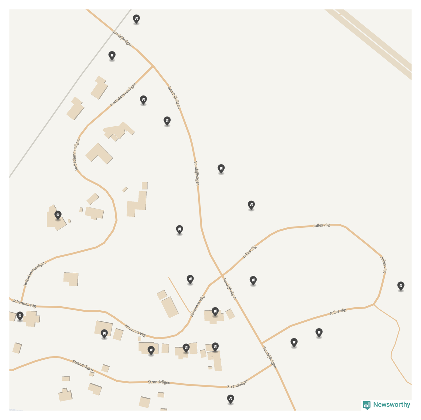 De 20 högst taxerade fastigheterna visas. En markör per fastighet. Samtaxerade fastigheter visas bara en gång. Notera att det är centrumpunkten för fastigheten som visas, vilket kan vara missvisande för stora fastigheter.