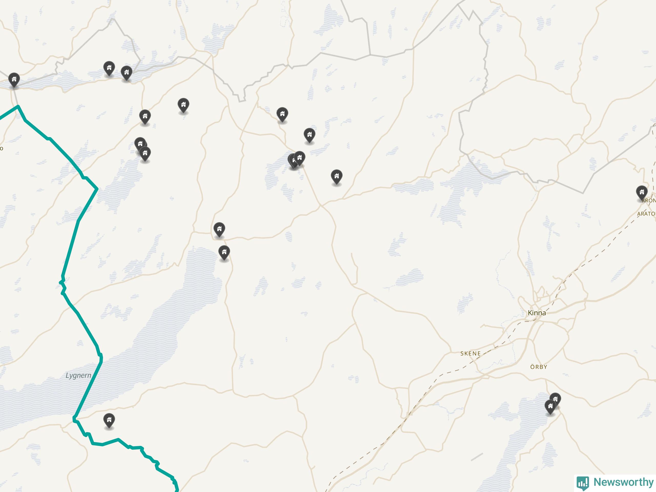 En markör per fastighet. Samtaxerade fastigheter visas bara en gång. Notera att det är centrumpunkten för fastigheterna som visas, vilket kan vara missvisande för stora fastigheter.