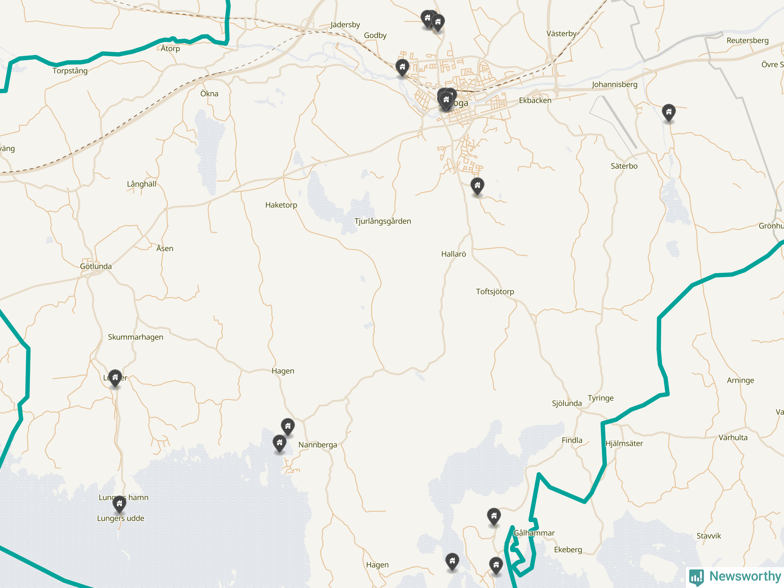En markör per fastighet. Samtaxerade fastigheter visas bara en gång. Notera att det är centrumpunkten för fastigheterna som visas, vilket kan vara missvisande för stora fastigheter.