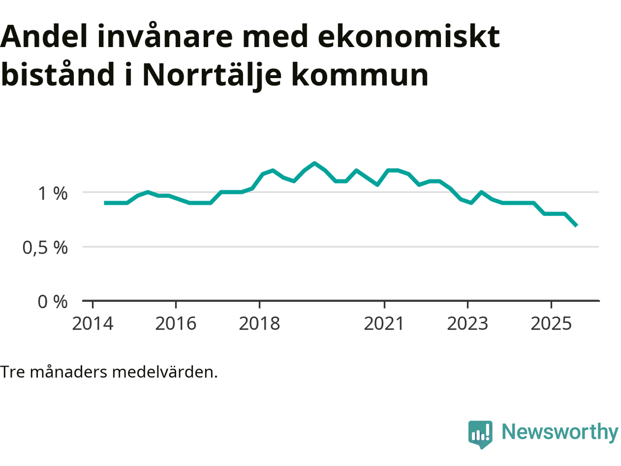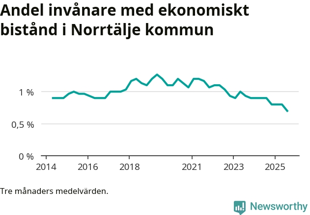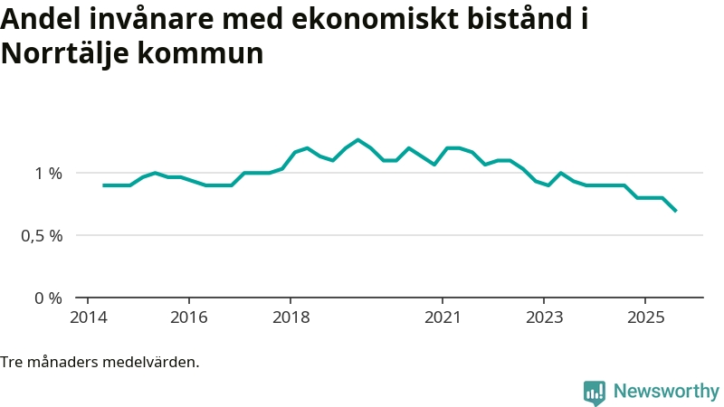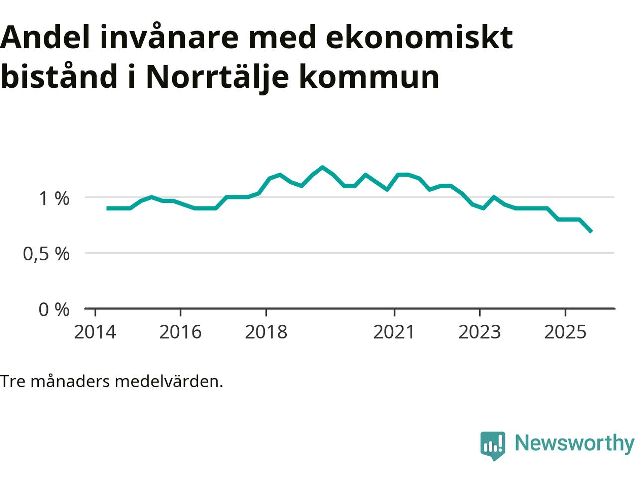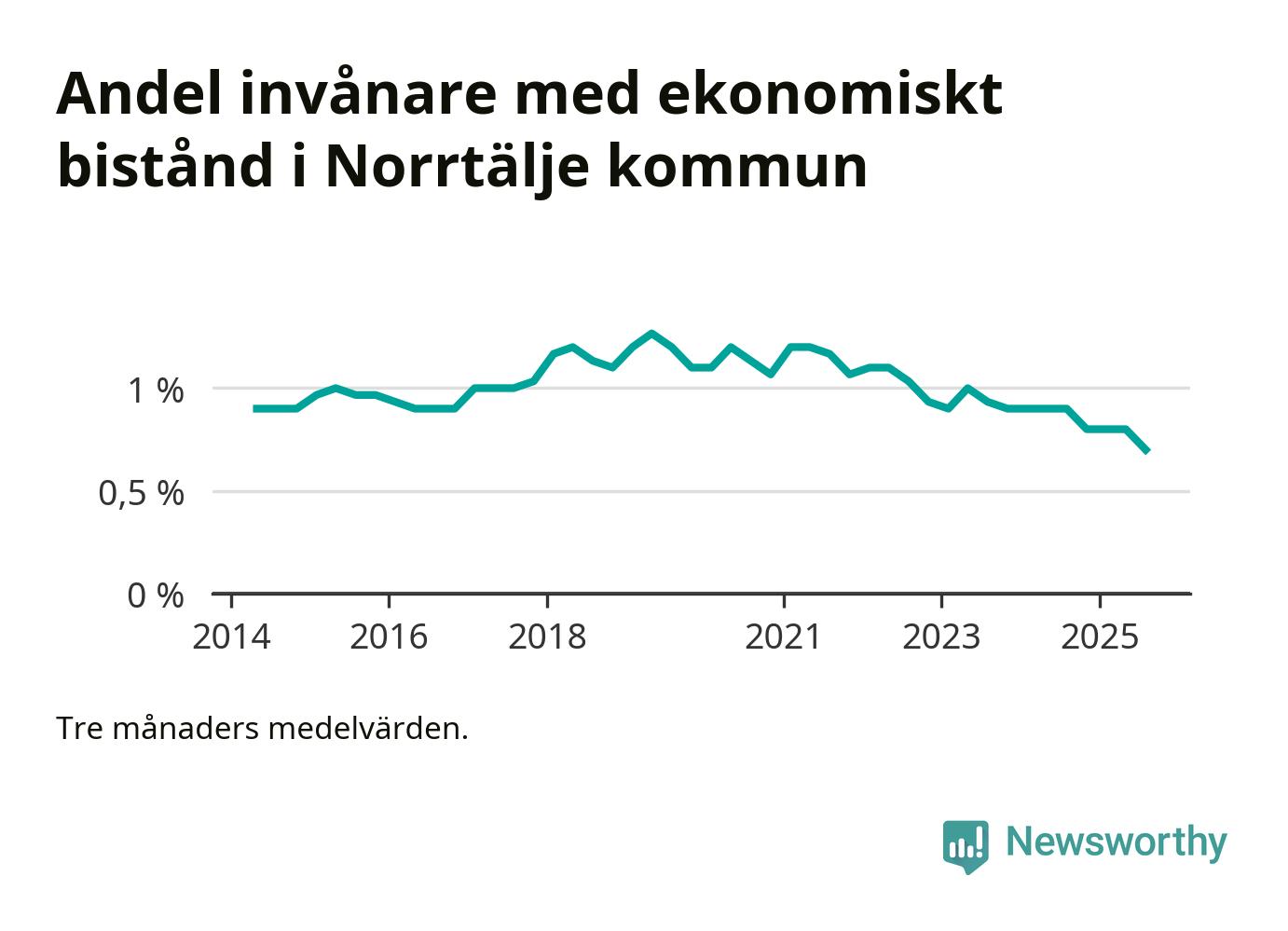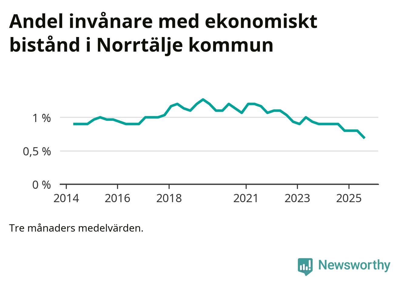 Andelen invånare med ekonomiskt bistånd i Norrtälje kommun var under sommaren den lägsta sedan åtminstone 2014. Det visar den senaste, preliminära statistiken från Socialstyrelsen.
