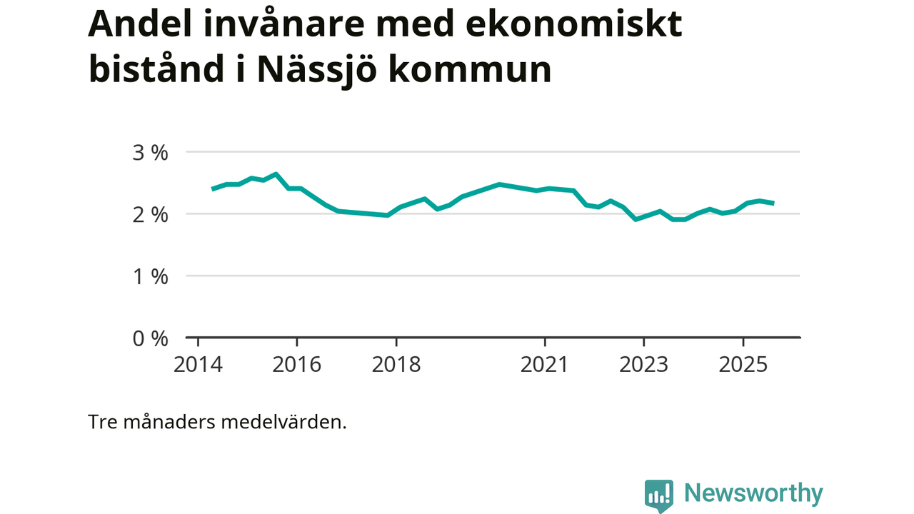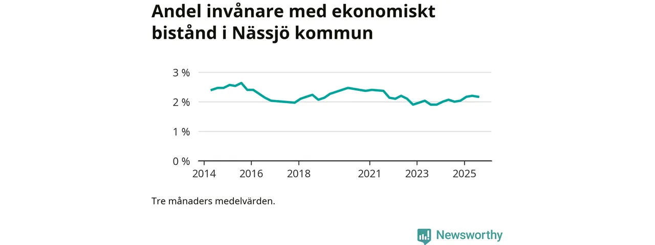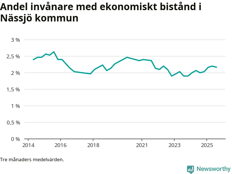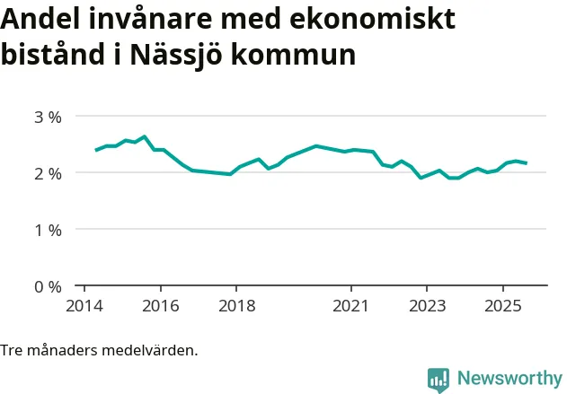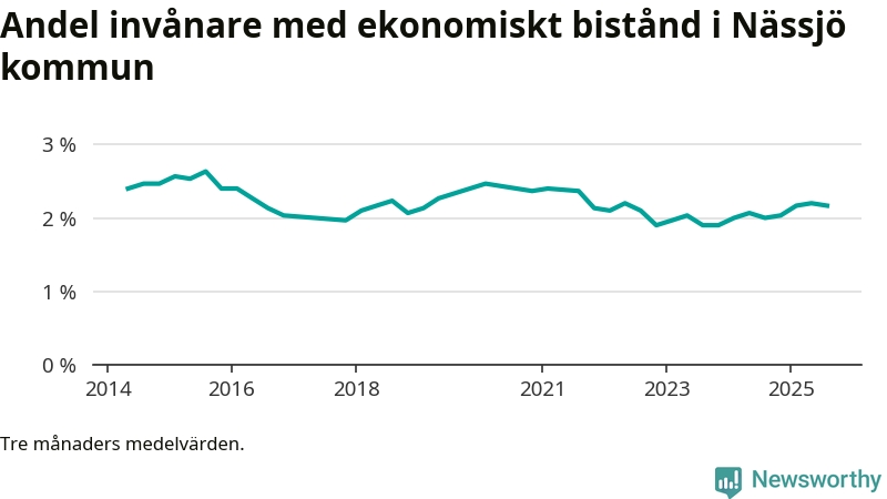 Den högsta andelen biståndstagare under det senaste decenniet hade kommunen under sommaren 2015 (2,6 procent), och den lägsta andelen under hösten 2022 (1,9 procent).