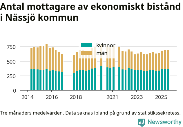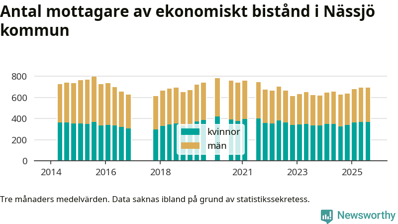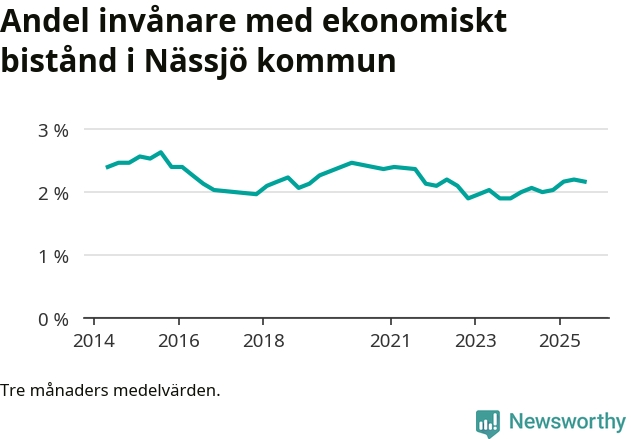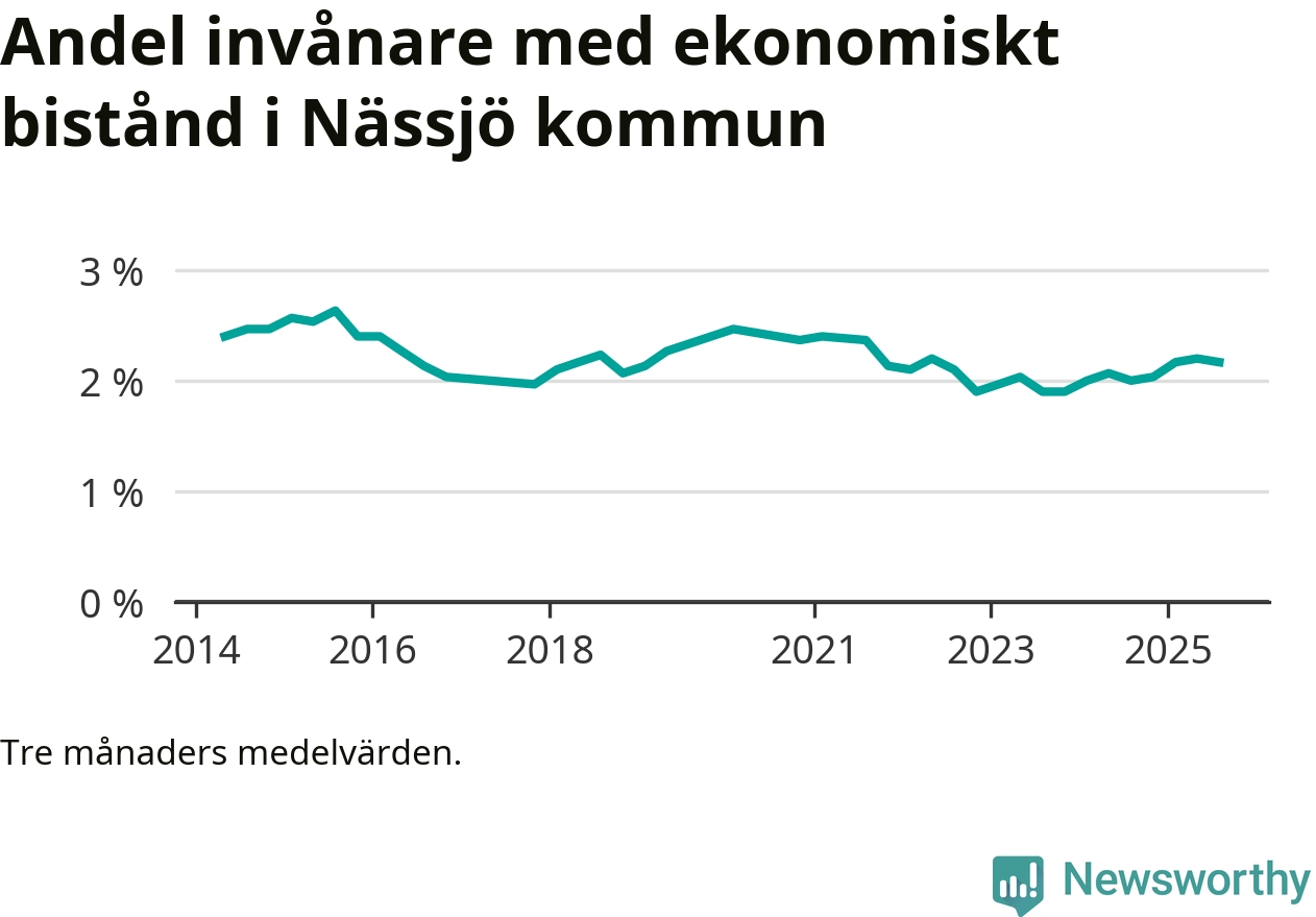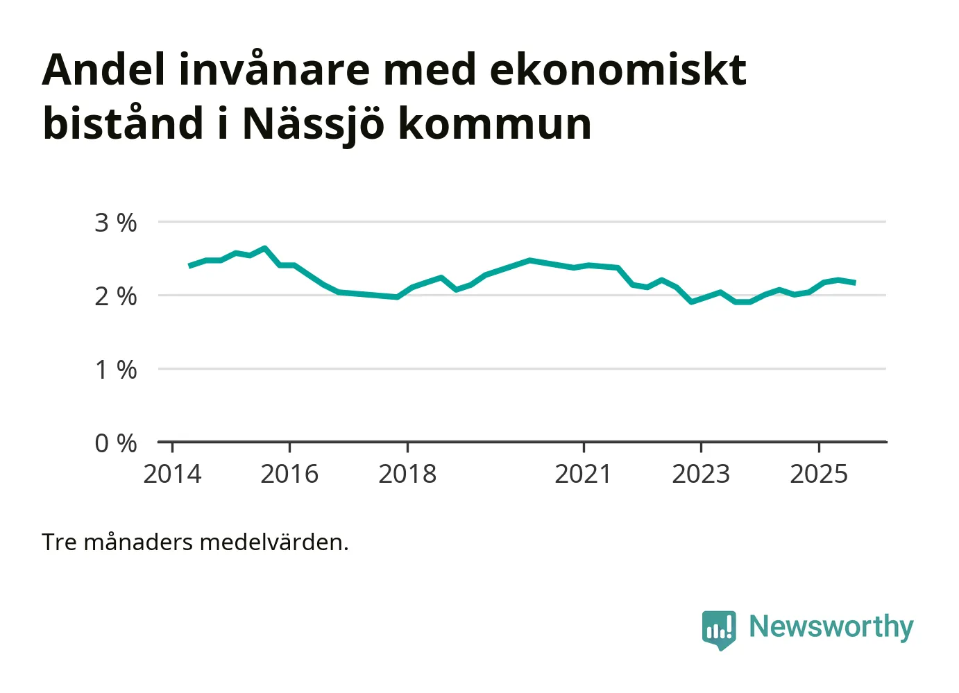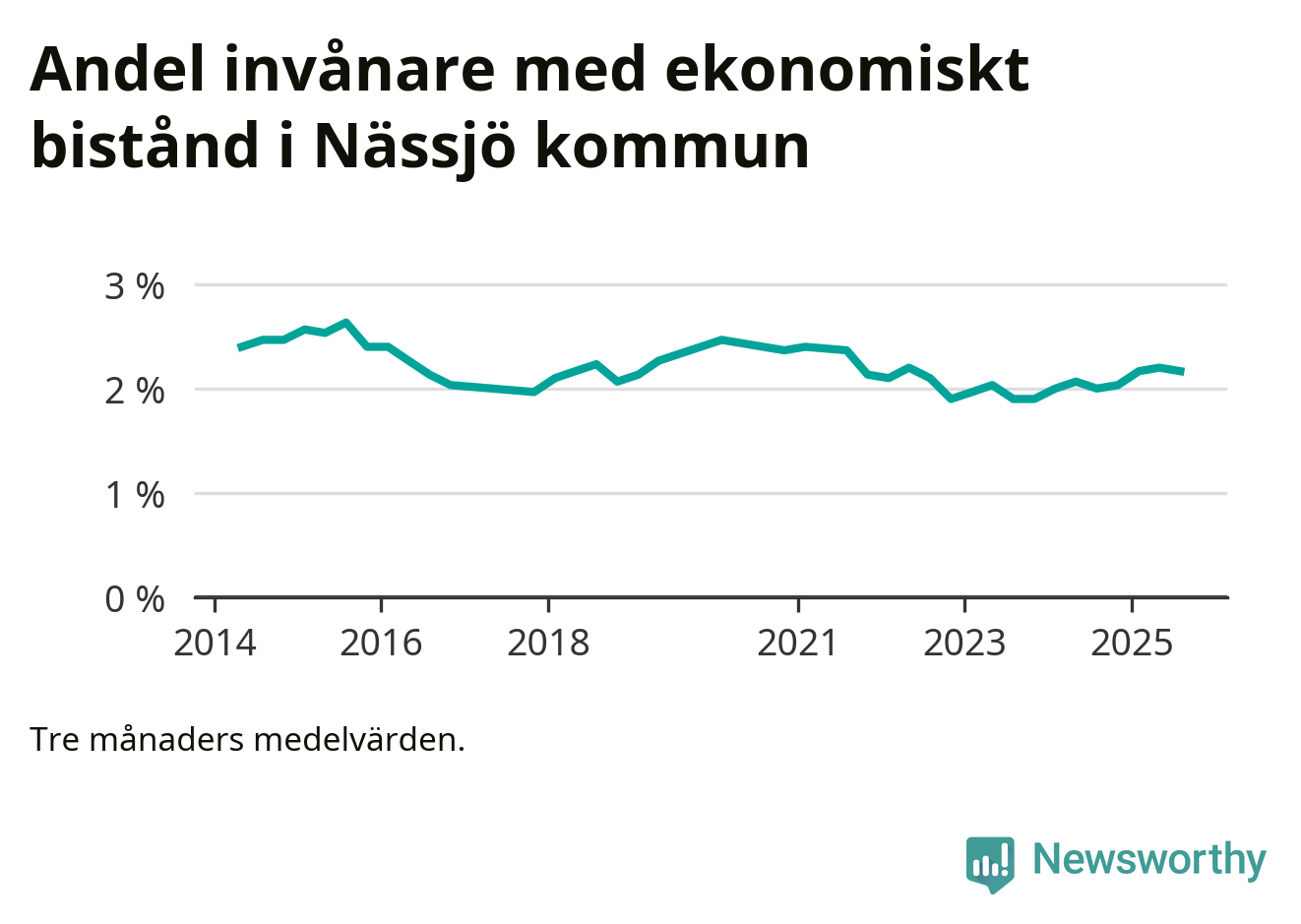 I genomsnitt 694 personer per månad fick ekonomiskt bistånd i Nässjö kommun under sommarmånaderna (juni till augusti), vilket motsvarar 2,2 procent av den vuxna befolkningen. Det är marginellt mindre än i våras, och något större andel än under sommaren för ett år sedan.