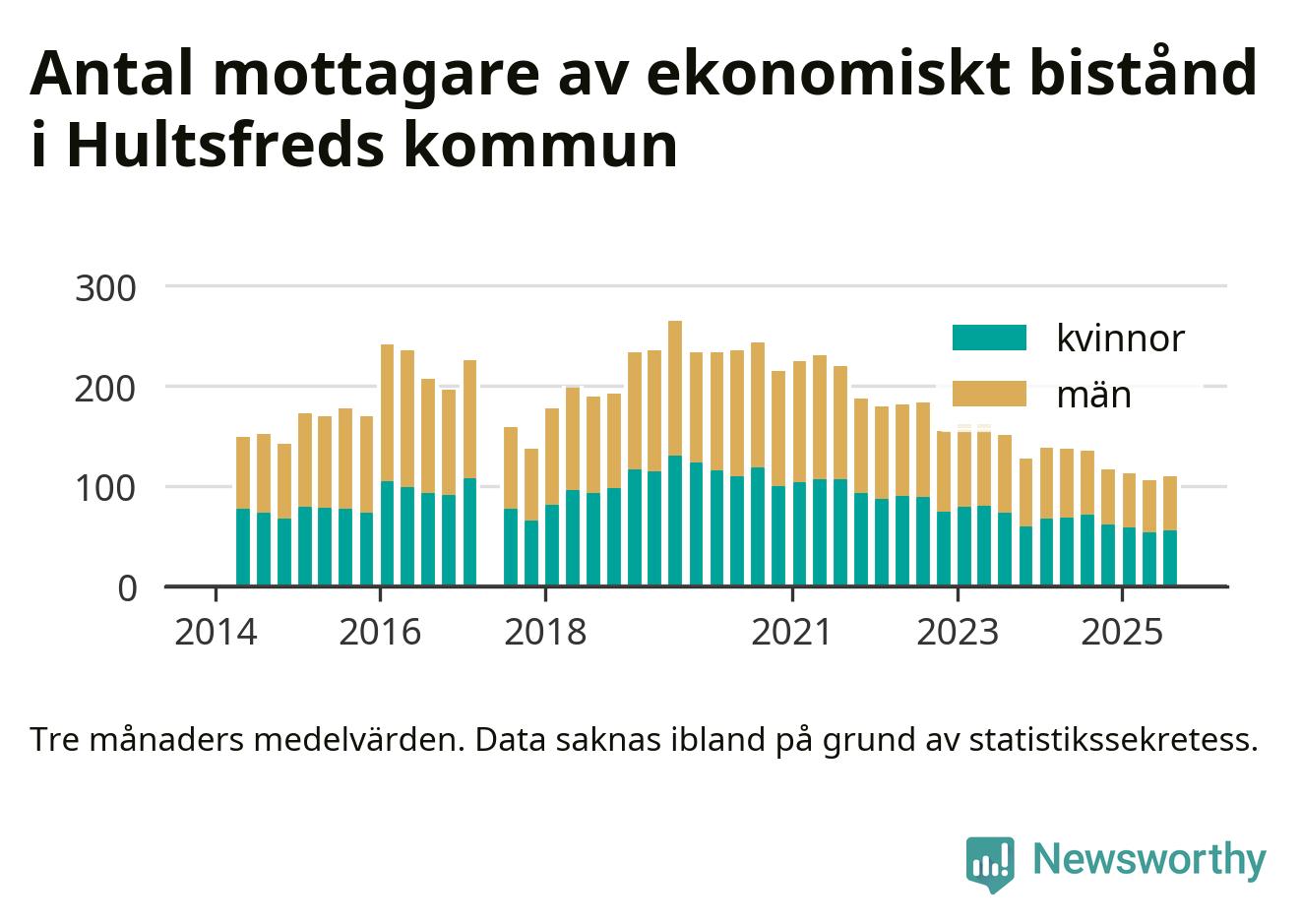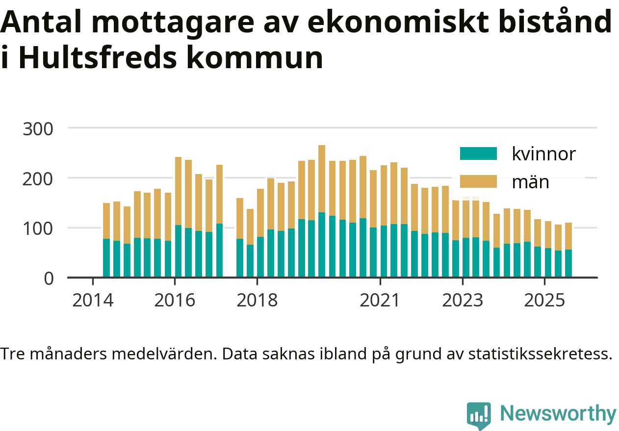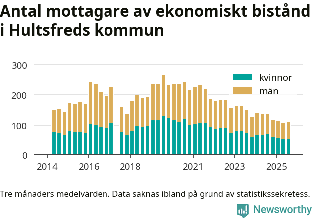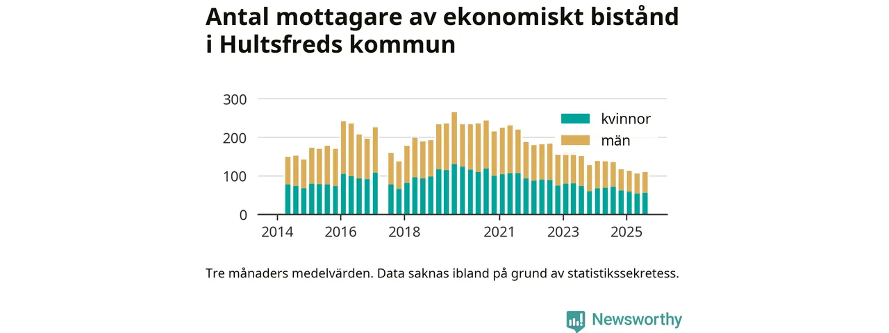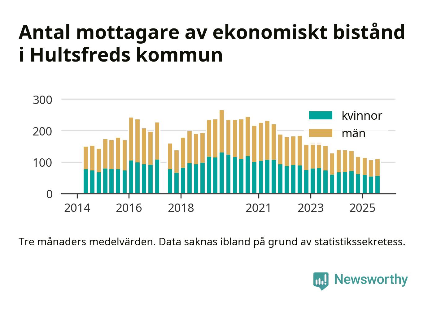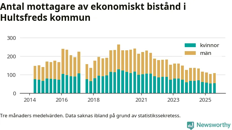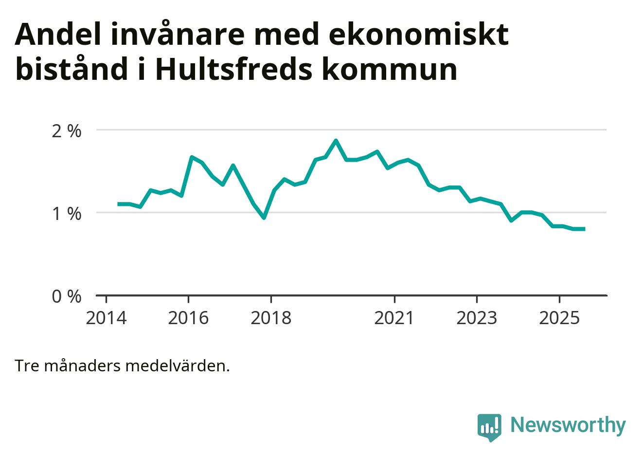I genomsnitt 110 personer per månad fick ekonomiskt bistånd i Hultsfreds kommun under sommarmånaderna (juni till augusti), vilket motsvarar 0,8 procent av den vuxna befolkningen. Det är lika stor andel som i våras, och något mindre andel än under sommaren för ett år sedan.