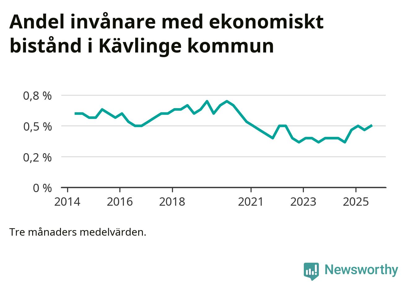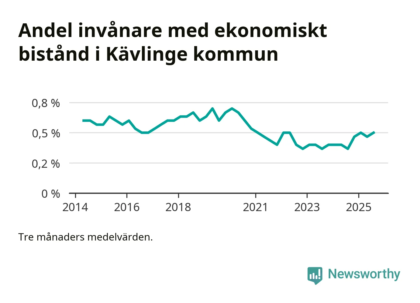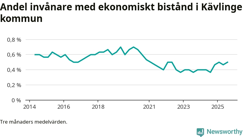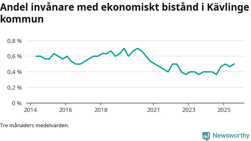 Den högsta andelen biståndstagare under det senaste decenniet hade kommunen under våren 2019 (0,7 procent), och den lägsta andelen under hösten 2022 (0,4 procent).
