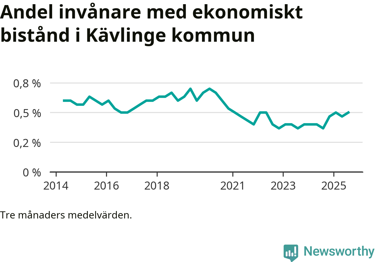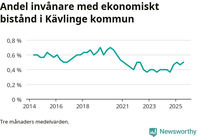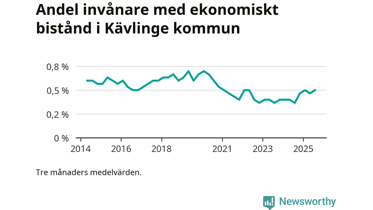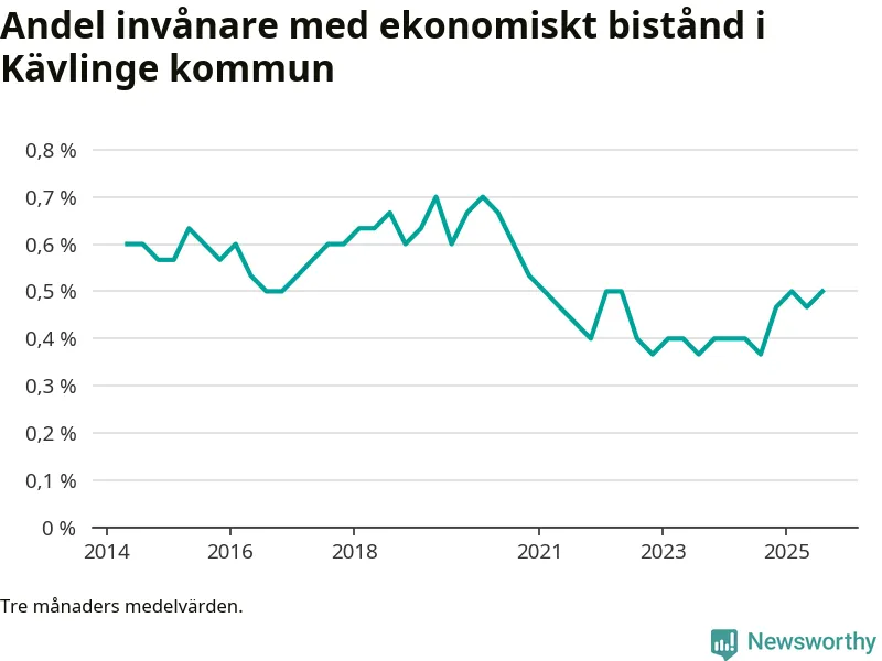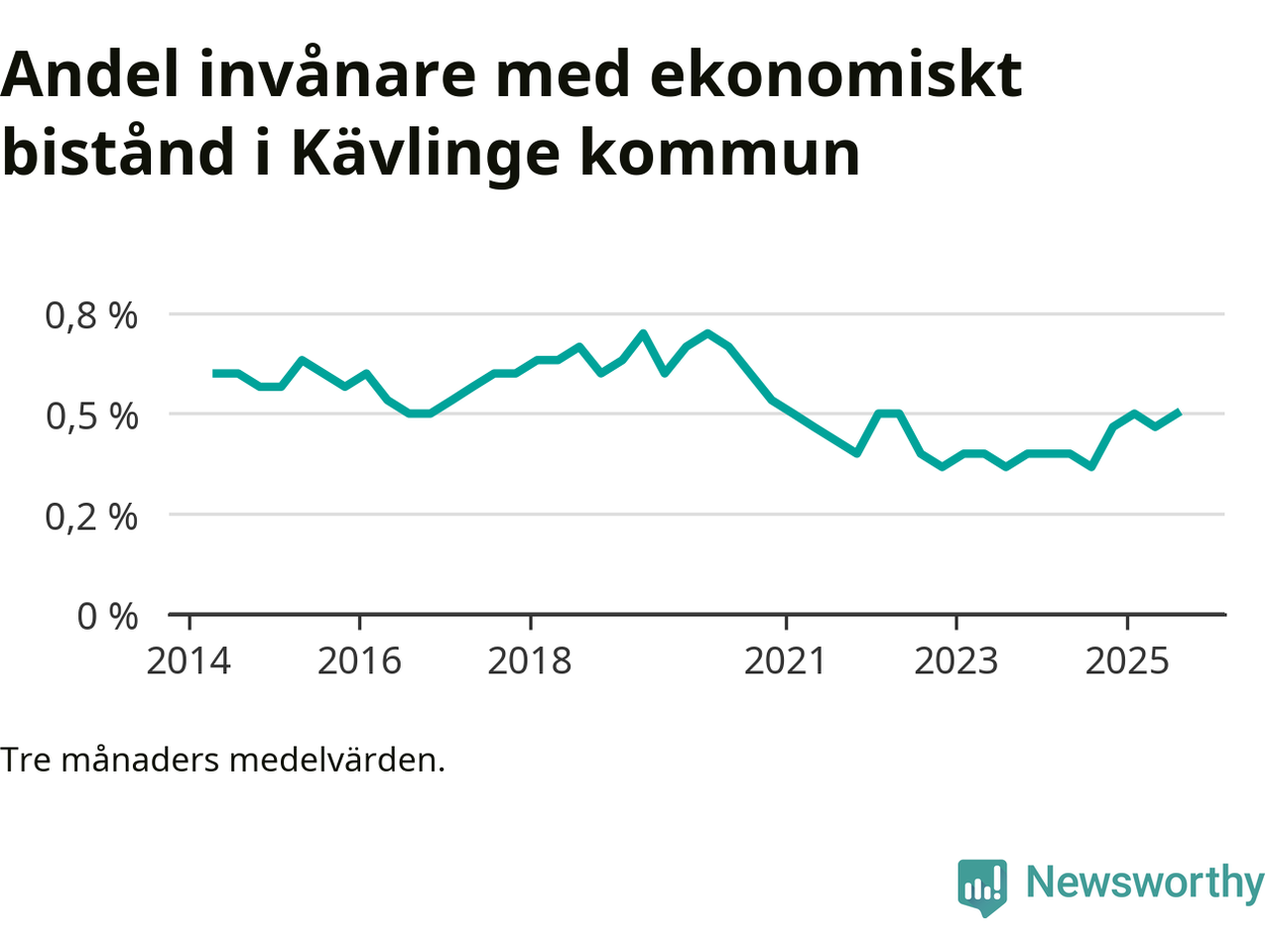 Den högsta andelen biståndstagare under det senaste decenniet hade kommunen under våren 2019 (0,7 procent), och den lägsta andelen under hösten 2022 (0,4 procent).