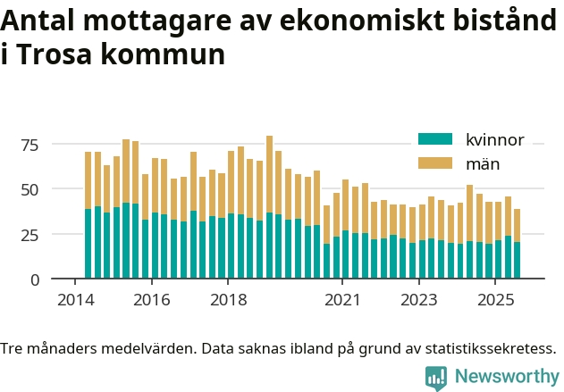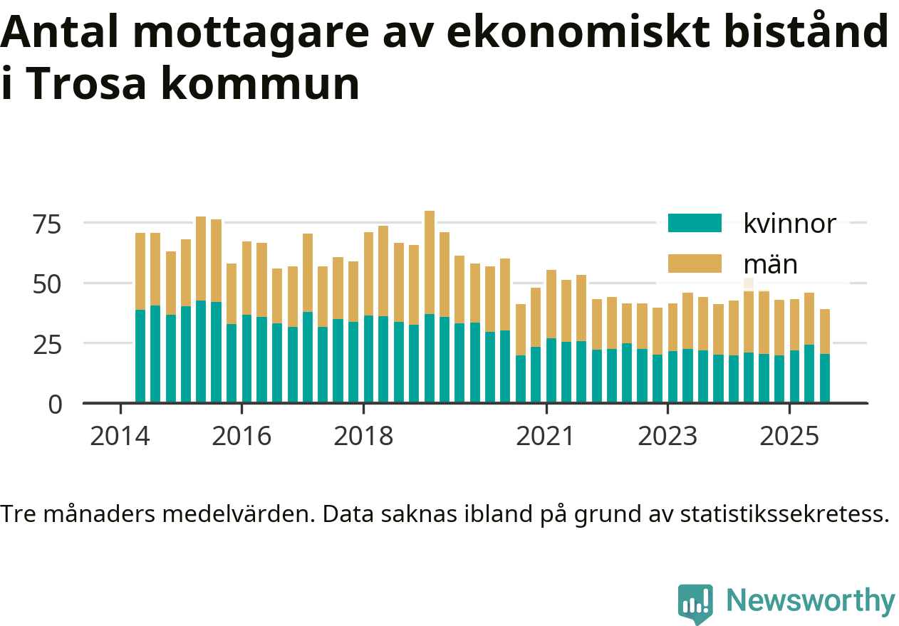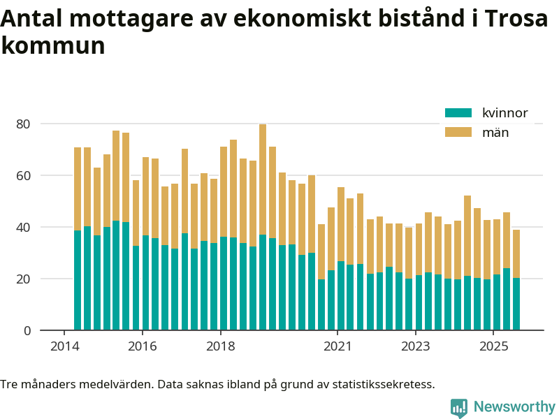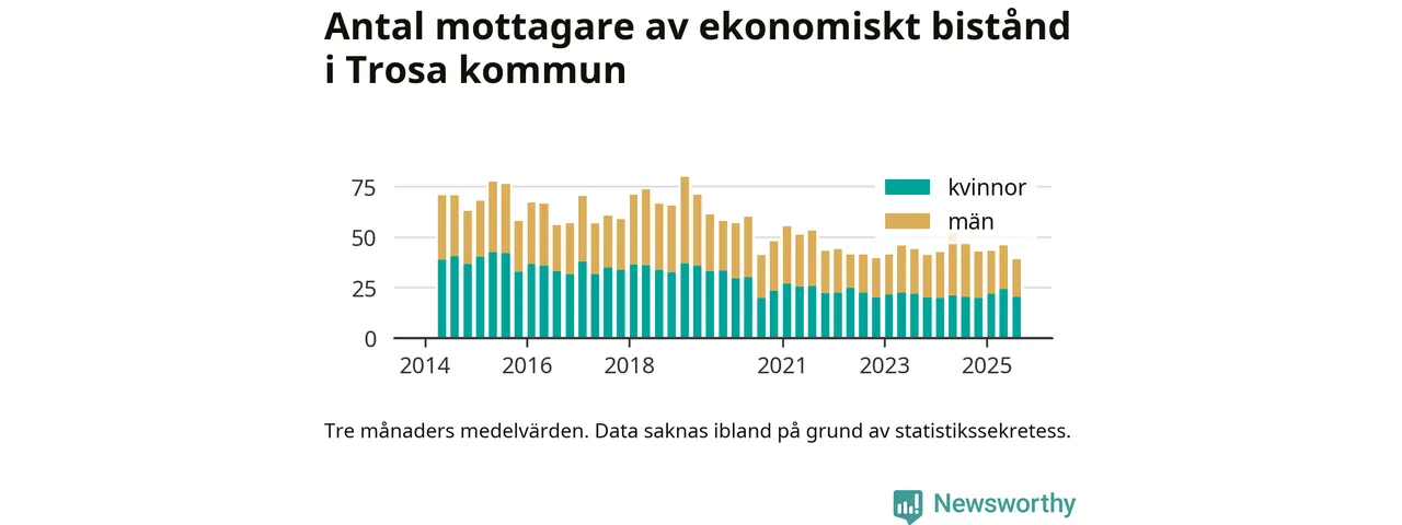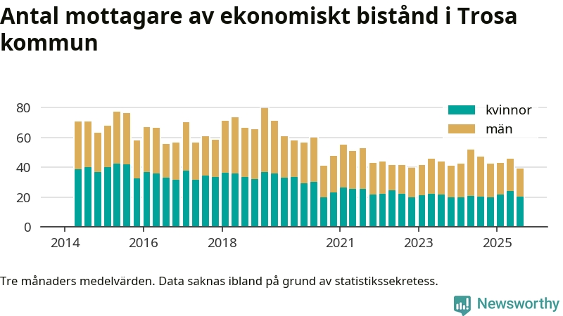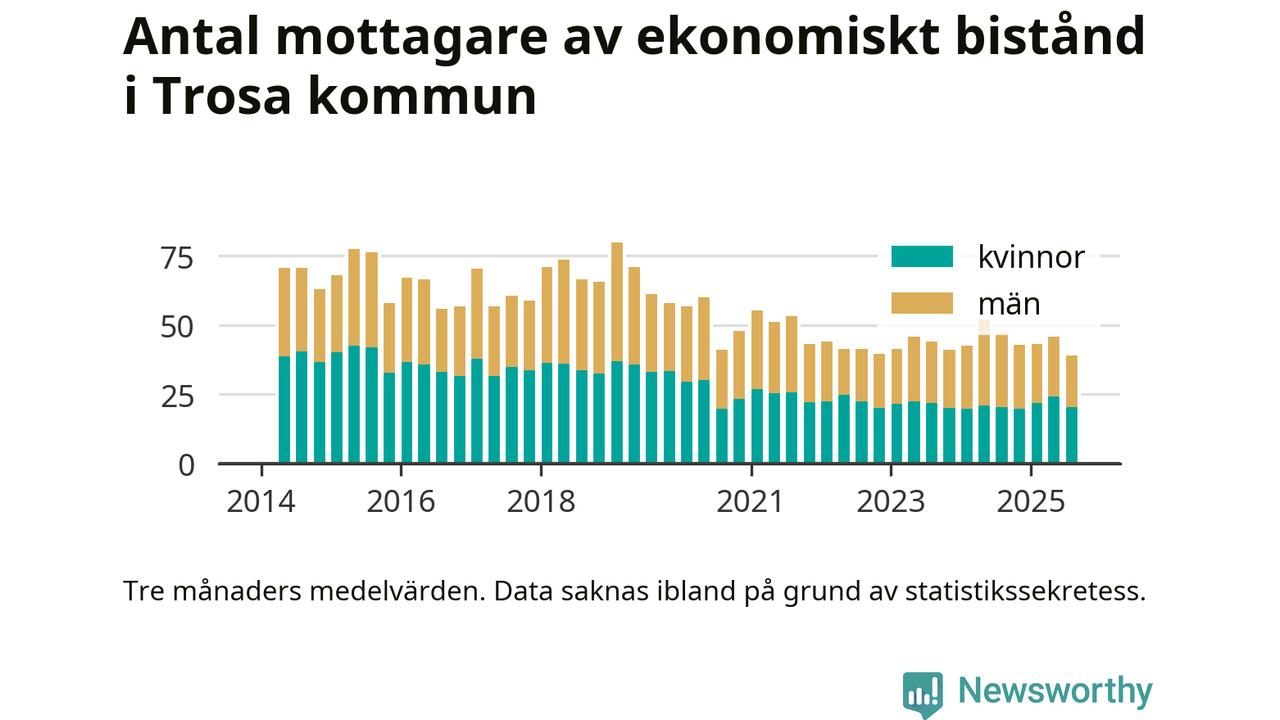 I genomsnitt 39 personer per månad fick ekonomiskt bistånd i Trosa kommun