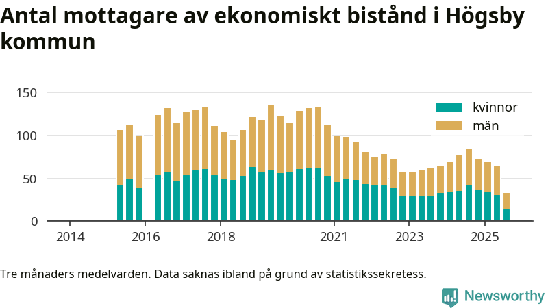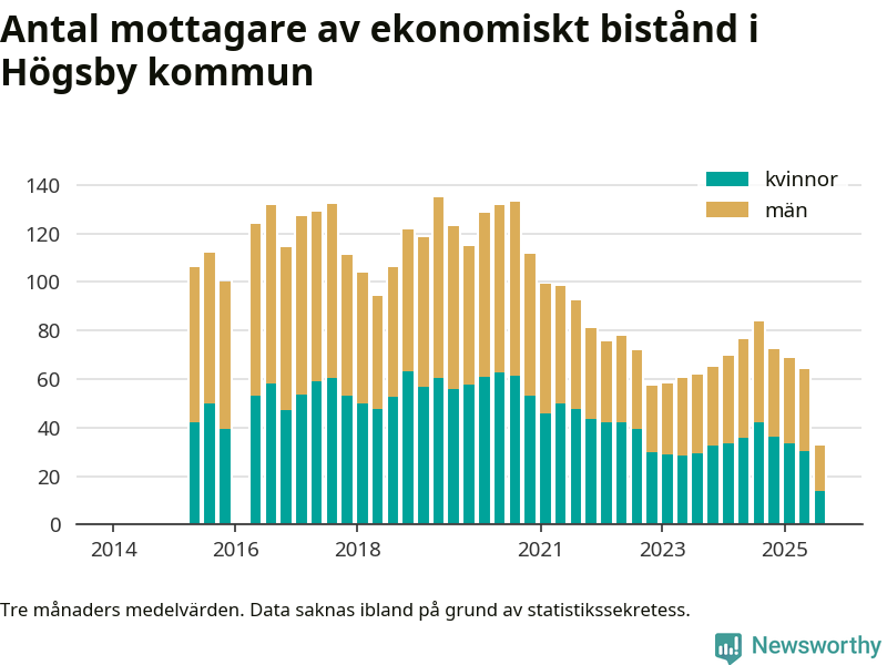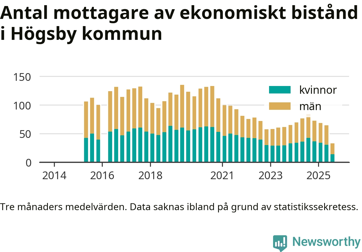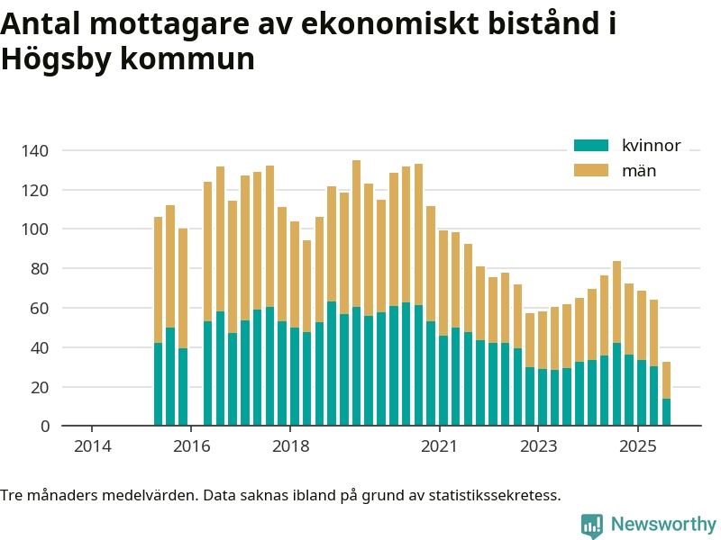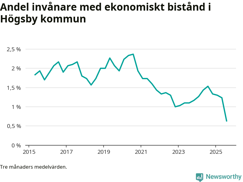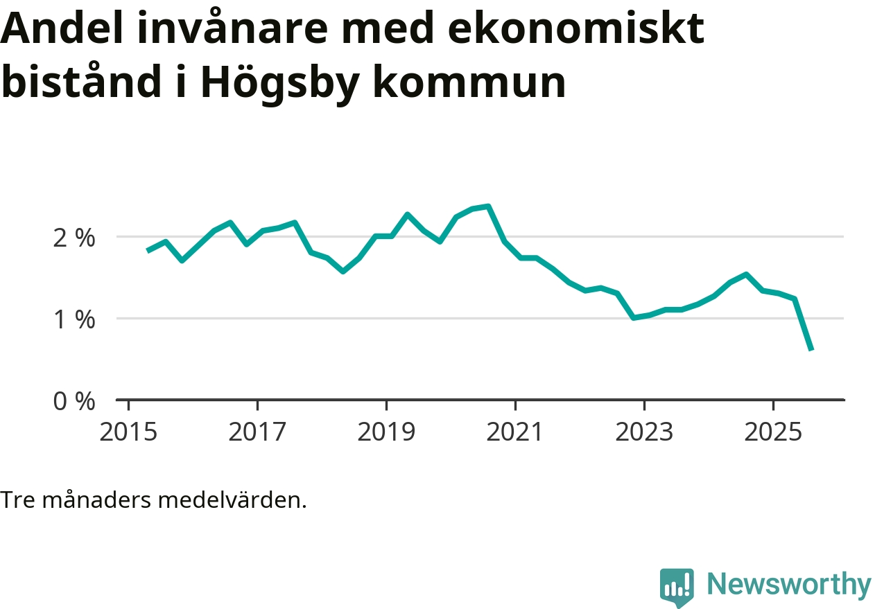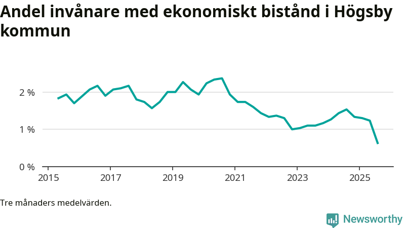 I genomsnitt 33 personer per månad fick ekonomiskt bistånd i Högsby kommun under sommarmånaderna (juni till augusti), vilket motsvarar 0,6 procent av den vuxna befolkningen. Det är en minskning med 0,6 procentenheter eller 32 personer jämfört med i våras, och något mindre andel än under sommaren för ett år sedan.