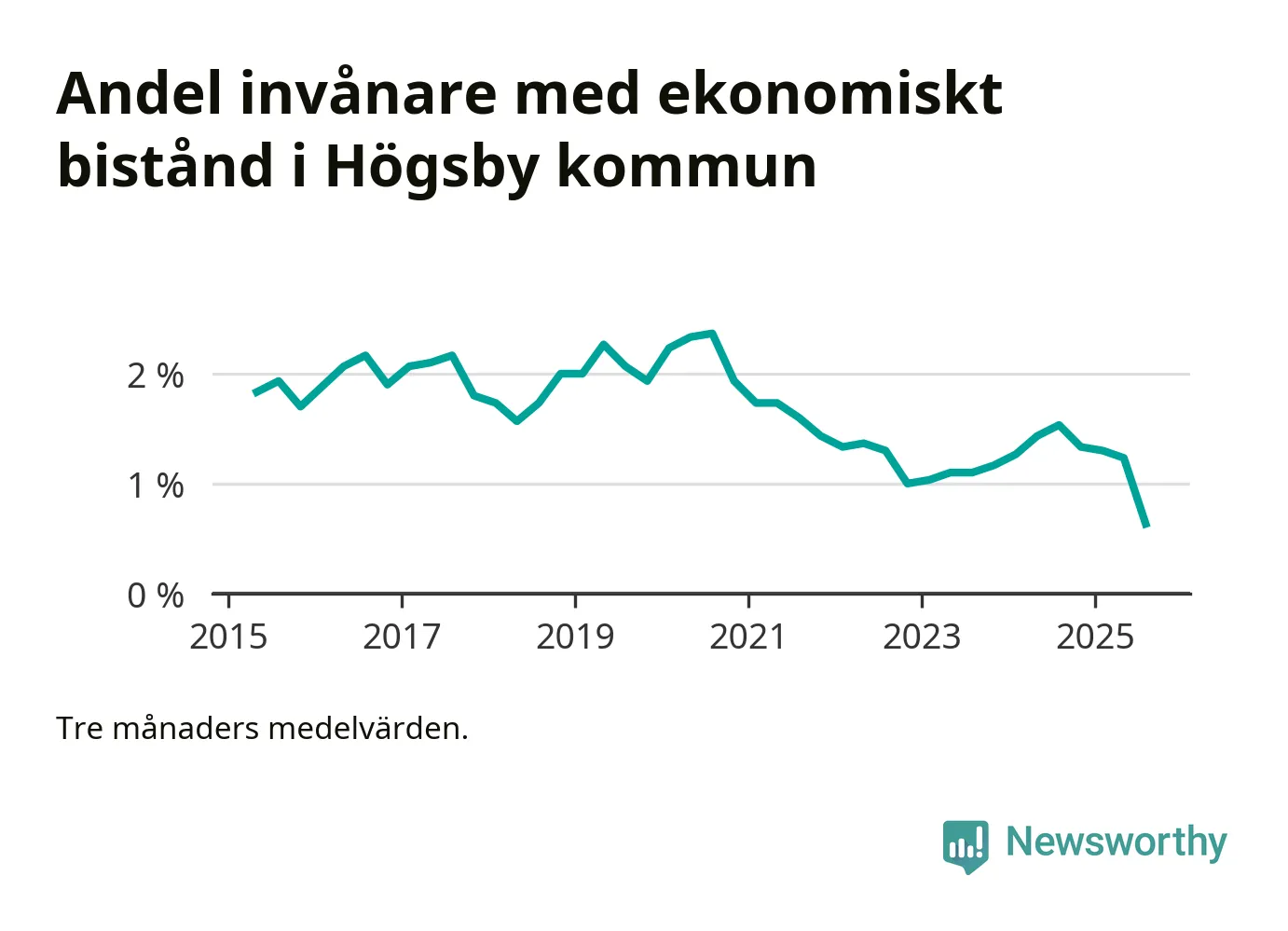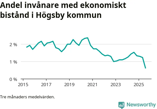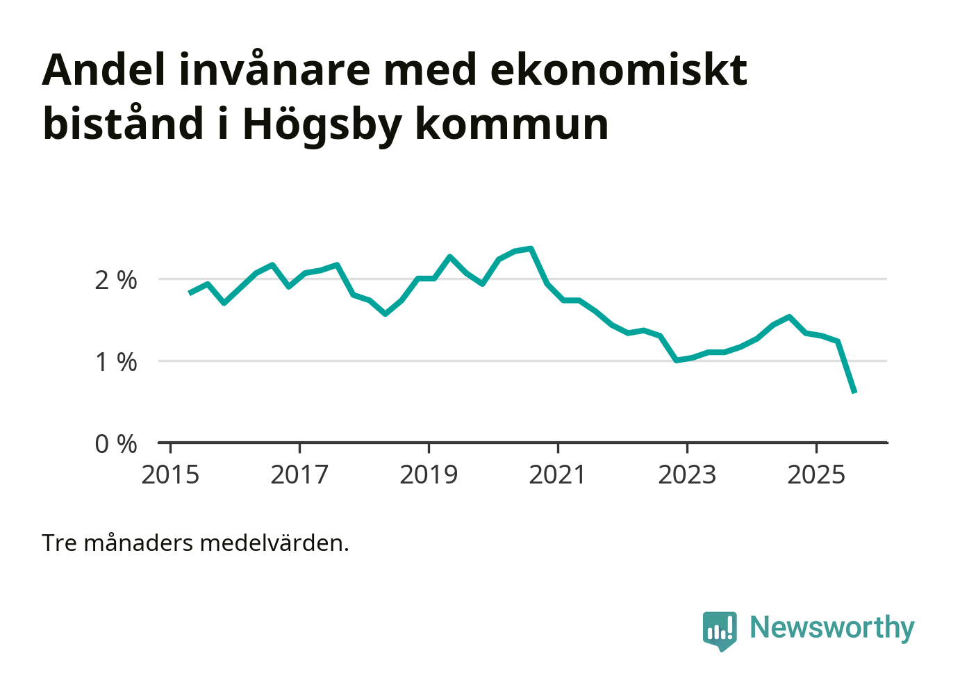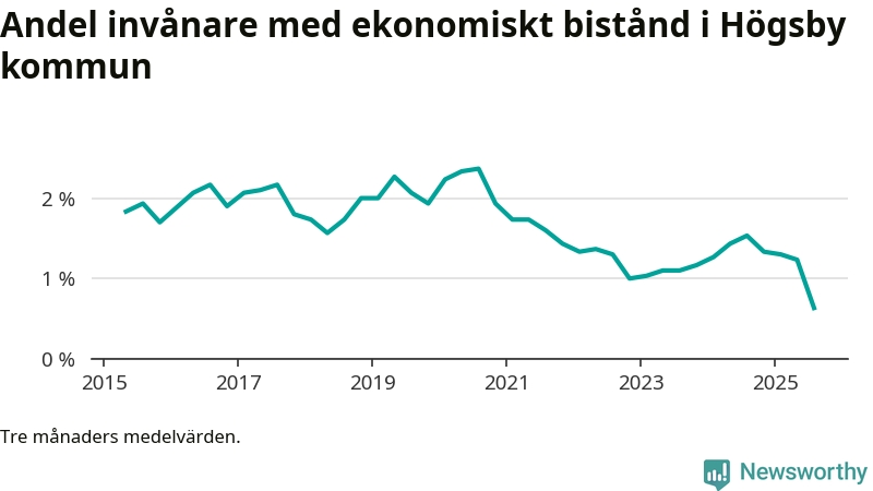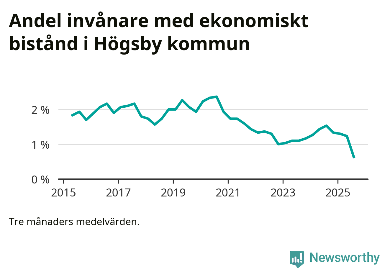 Andelen invånare med ekonomiskt bistånd i Högsby kommun var under sommaren den lägsta sedan åtminstone 2014. Det visar den senaste, preliminära statistiken från Socialstyrelsen.