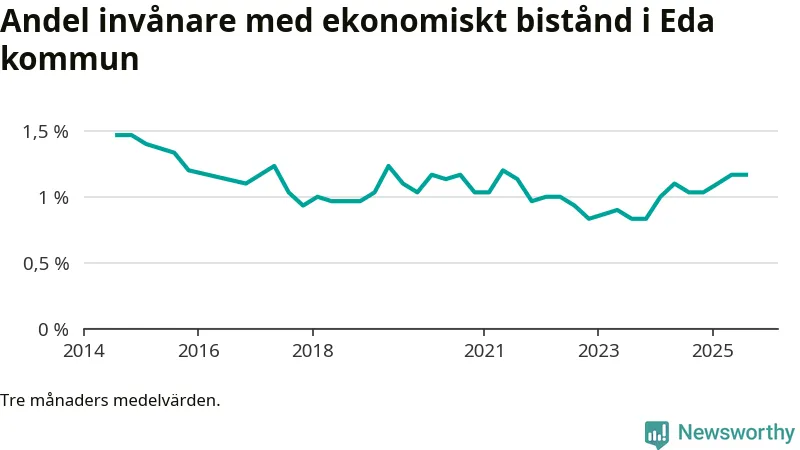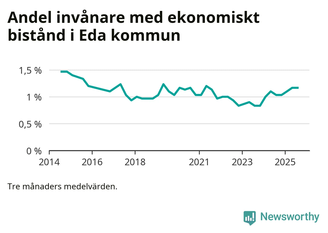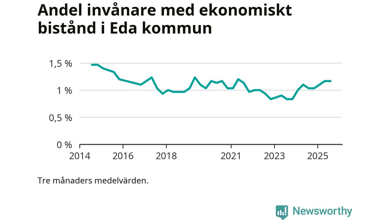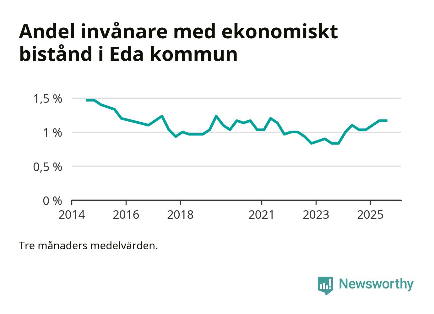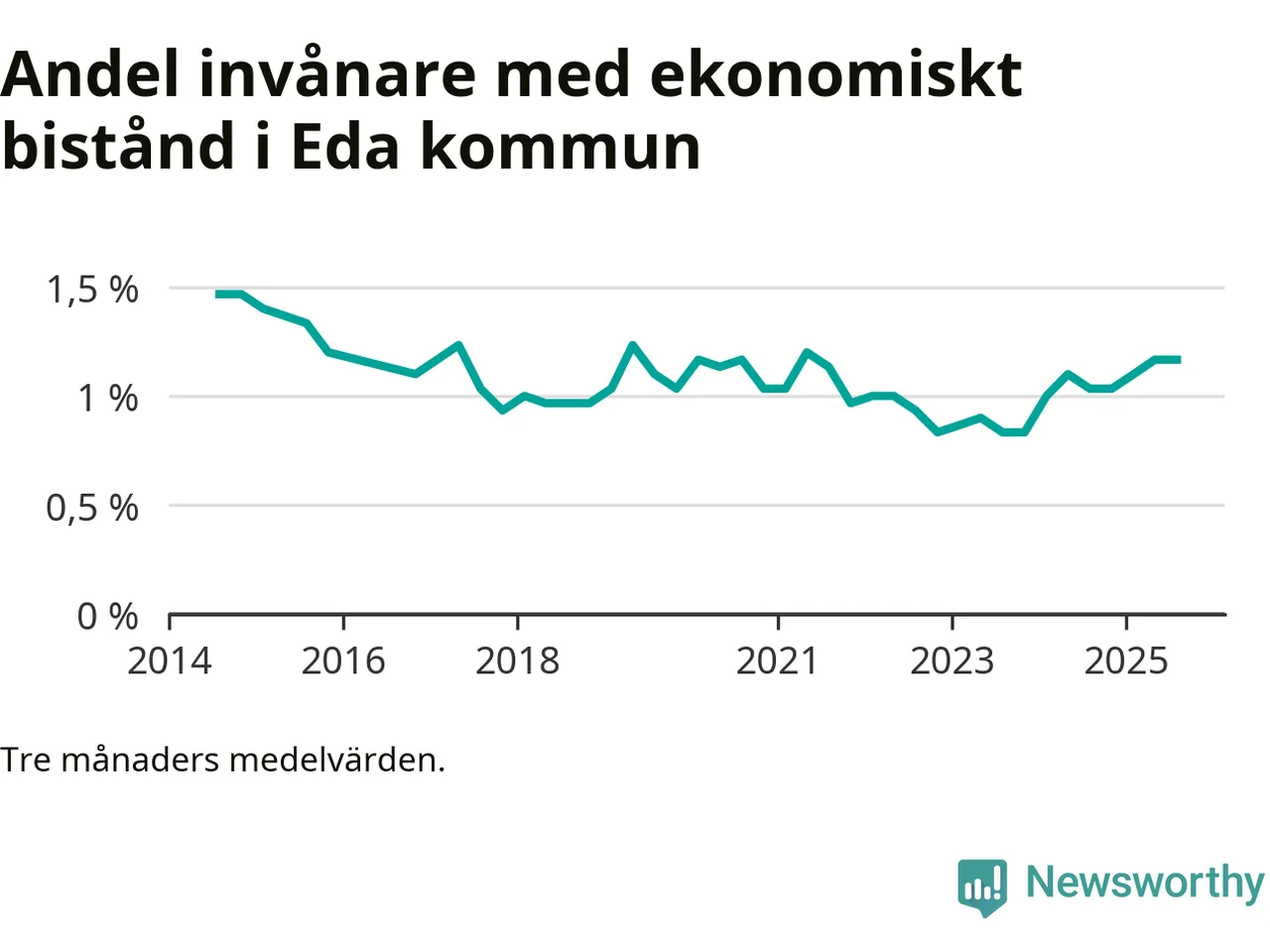 I genomsnitt 96 personer per månad fick ekonomiskt bistånd i Eda kommun under sommarmånaderna (juni till augusti), vilket motsvarar 1,2 procent av den vuxna befolkningen. Det är lika stor andel som i våras, och något större andel än under sommaren för ett år sedan.