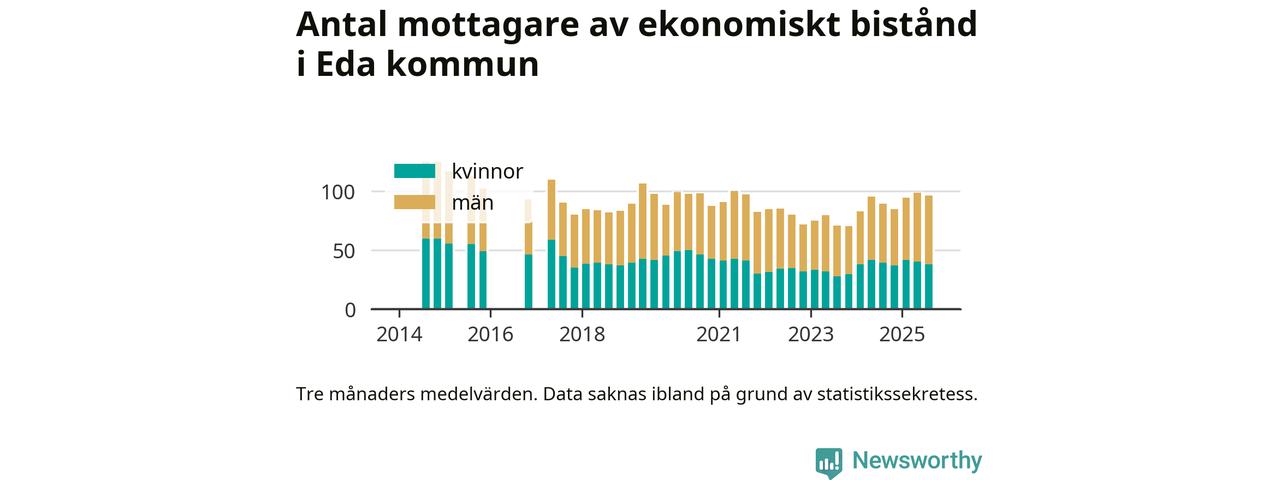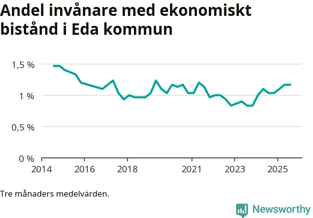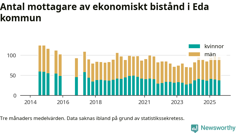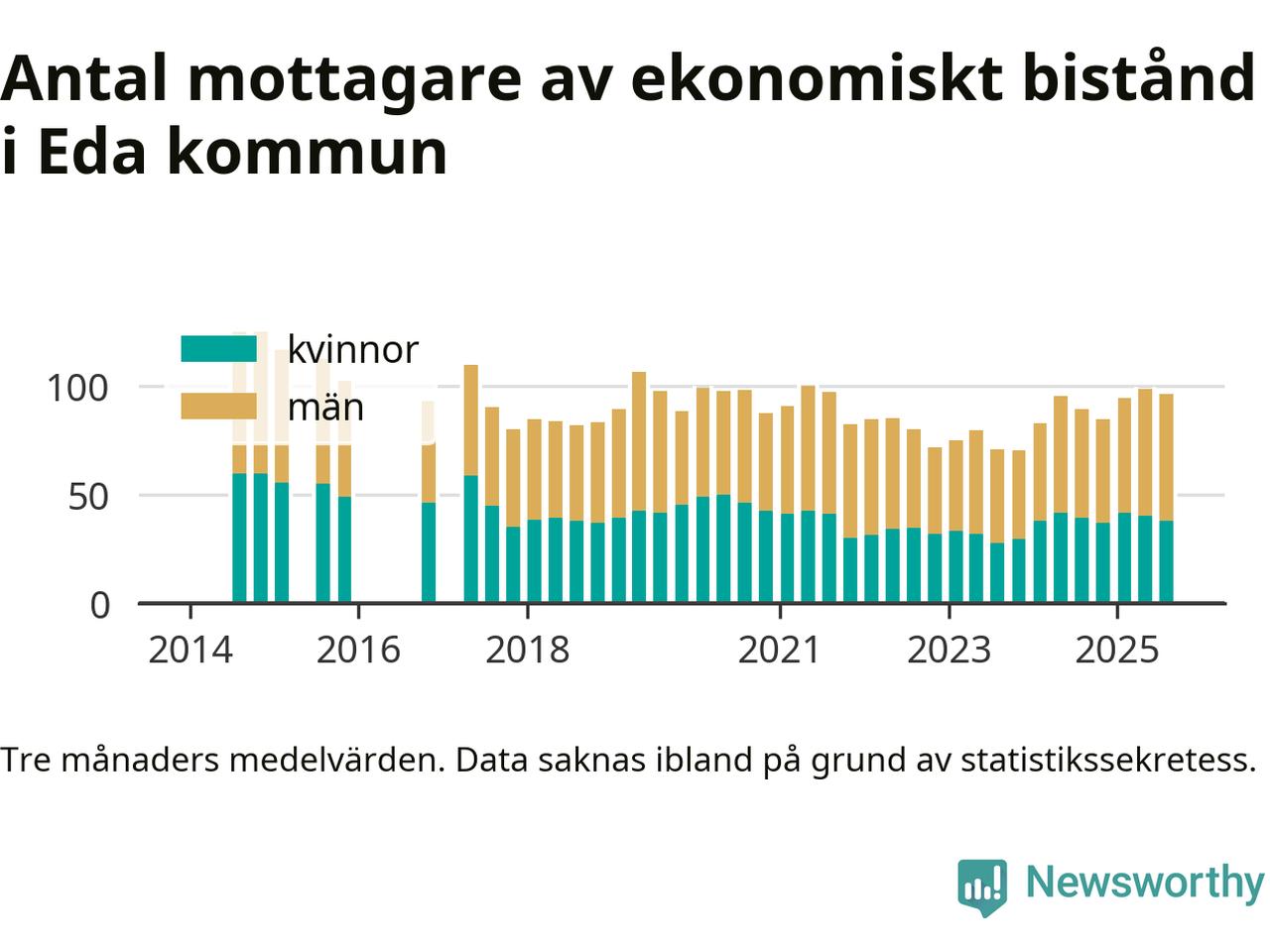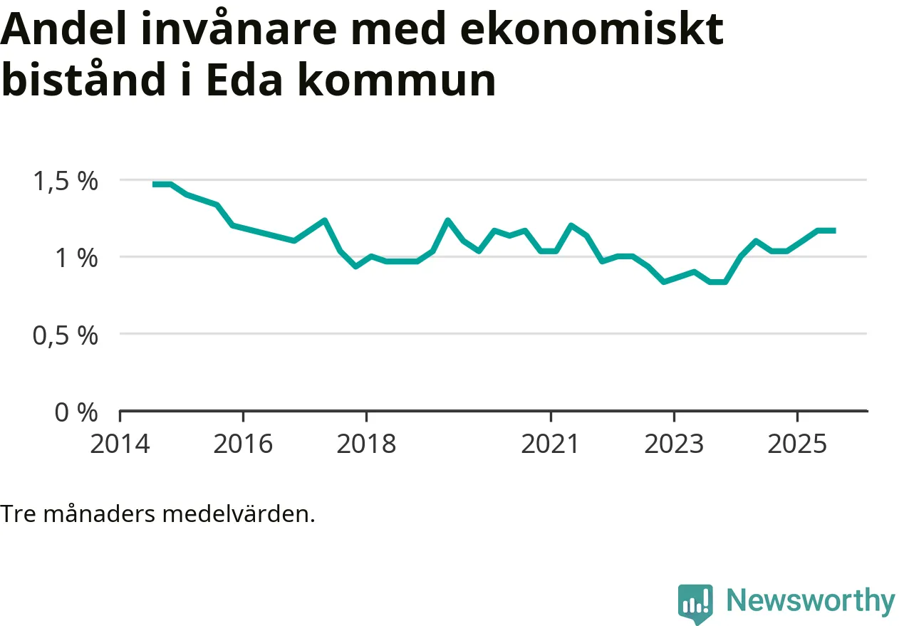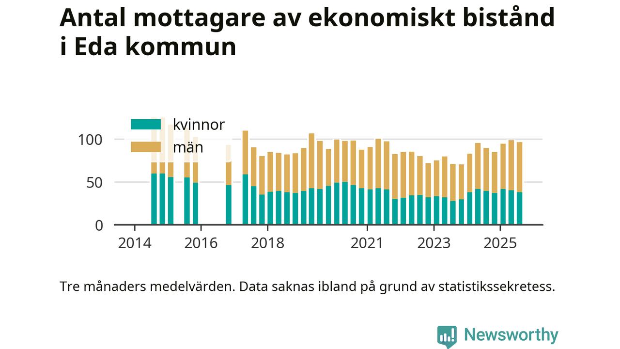 I genomsnitt 96 personer per månad fick ekonomiskt bistånd i Eda kommun under sommarmånaderna (juni till augusti), vilket motsvarar 1,2 procent av den vuxna befolkningen. Det är lika stor andel som i våras, och något större andel än under sommaren för ett år sedan.