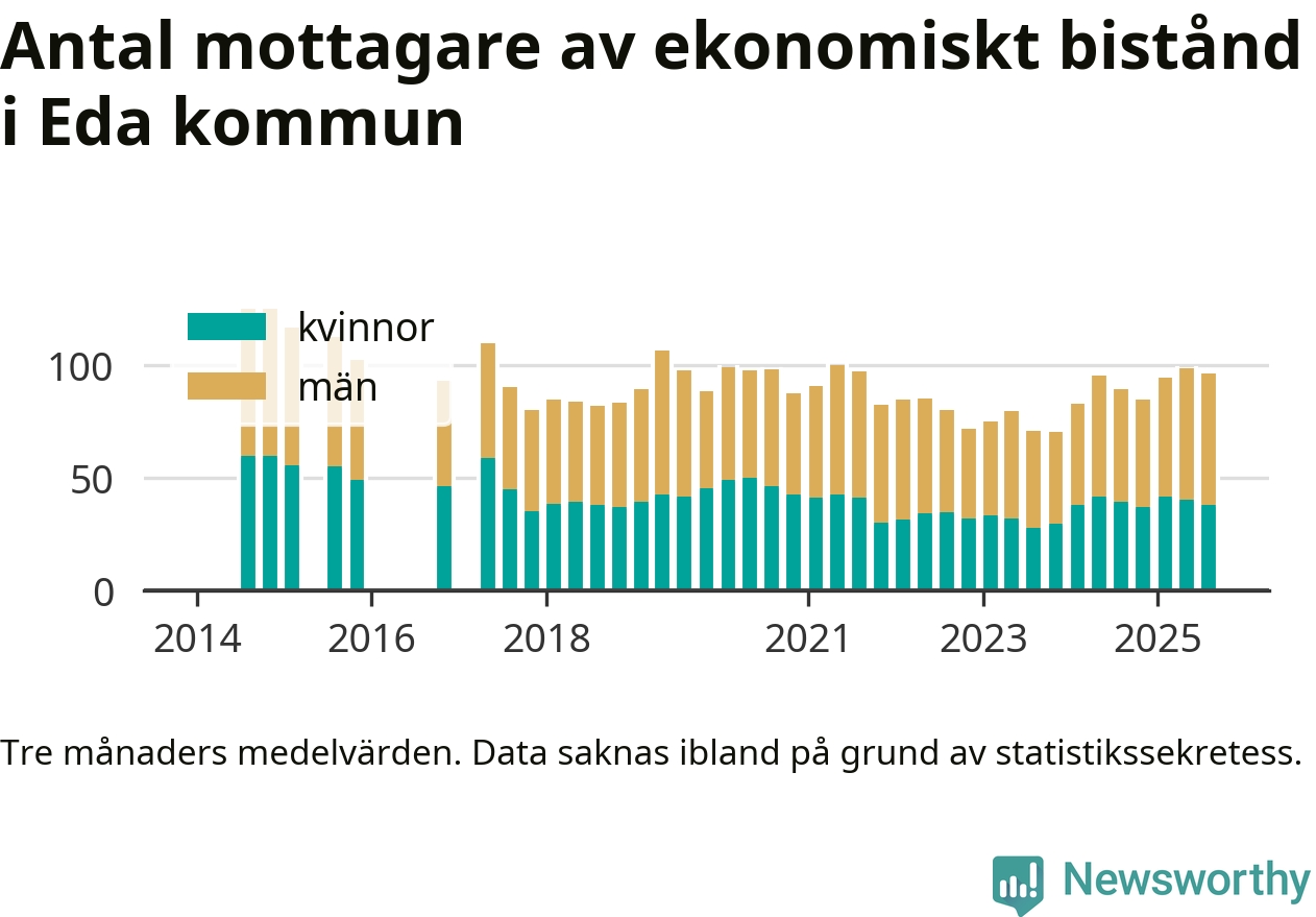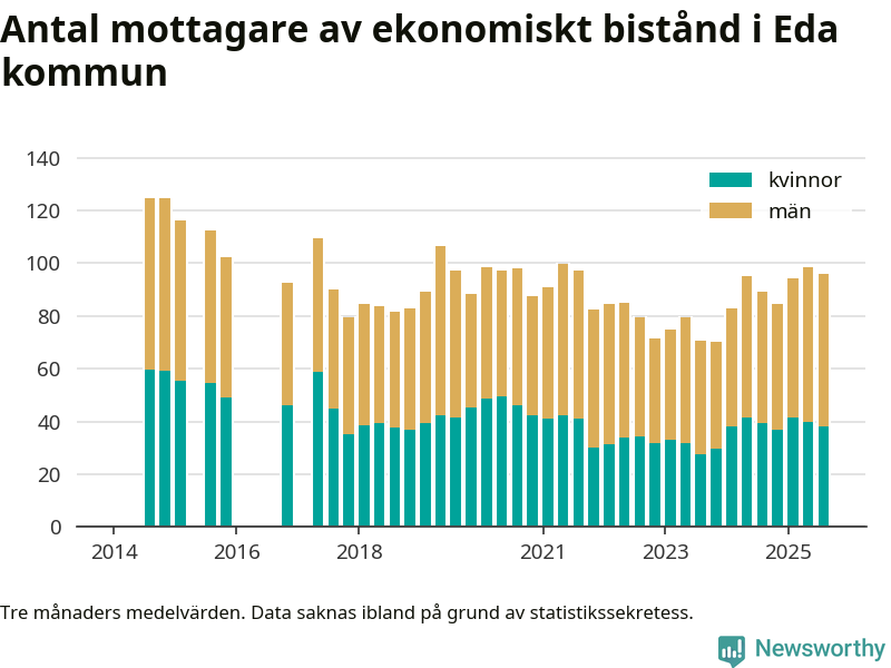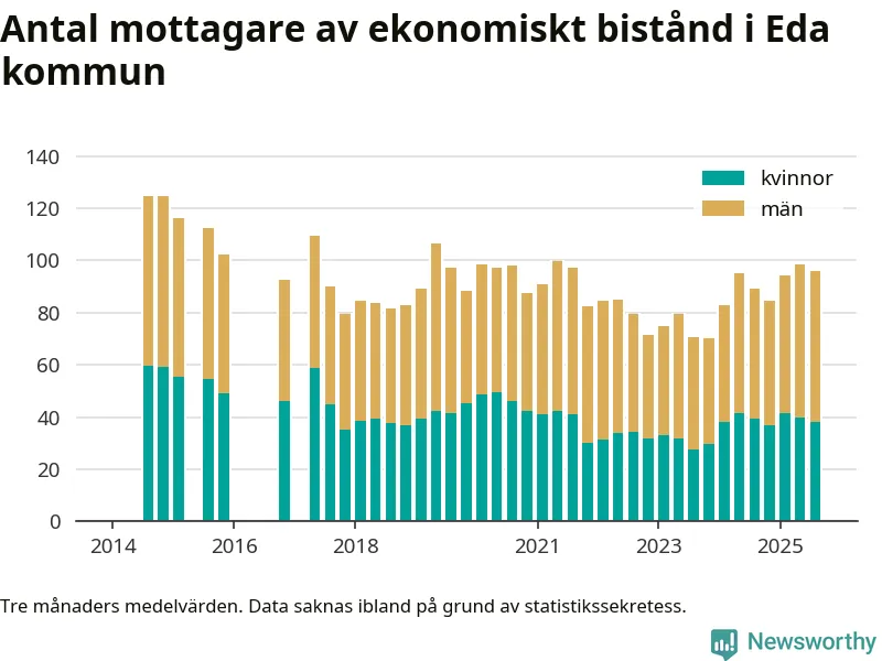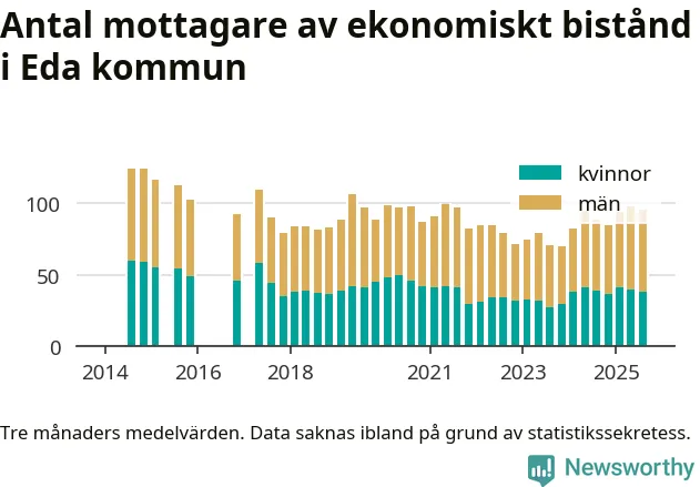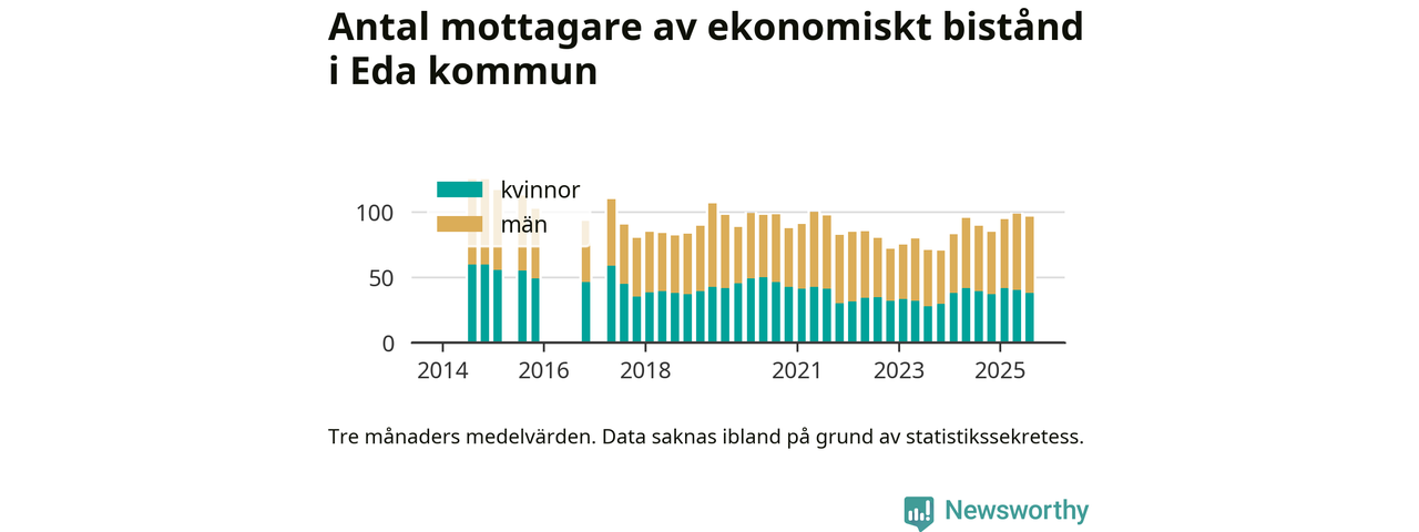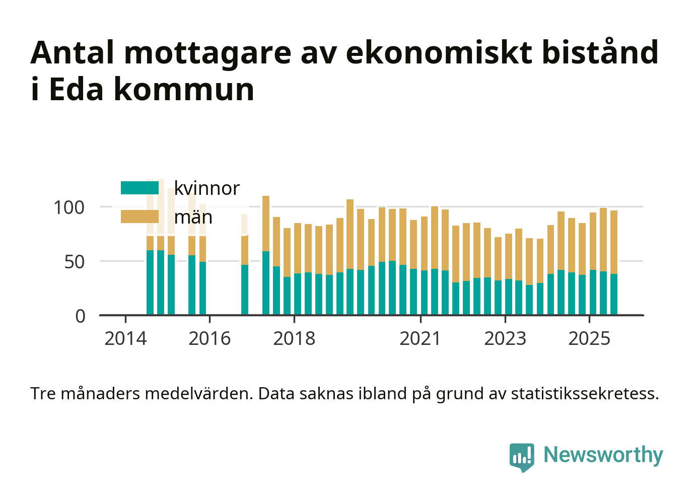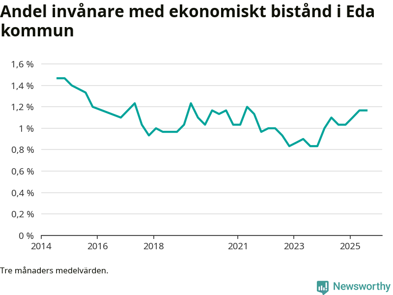 I genomsnitt 96 personer per månad fick ekonomiskt bistånd i Eda kommun under sommarmånaderna (juni till augusti), vilket motsvarar 1,2 procent av den vuxna befolkningen. Det är lika stor andel som i våras, och något större andel än under sommaren för ett år sedan.