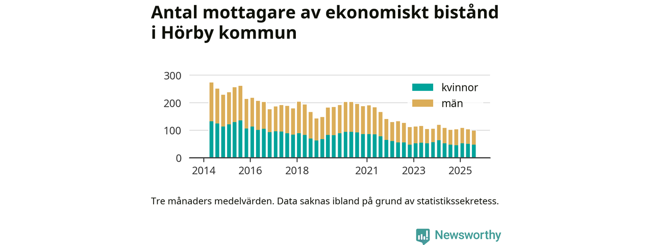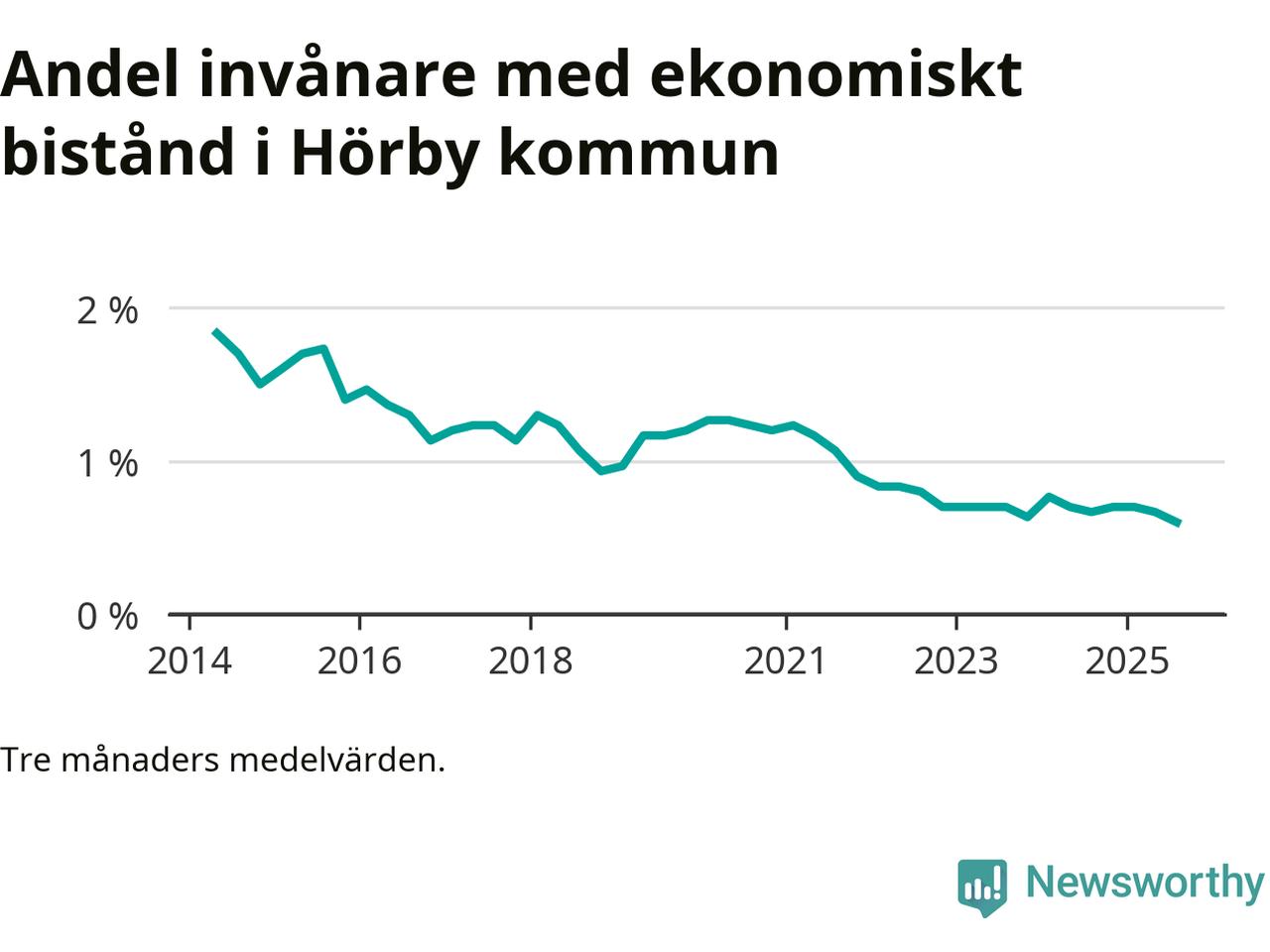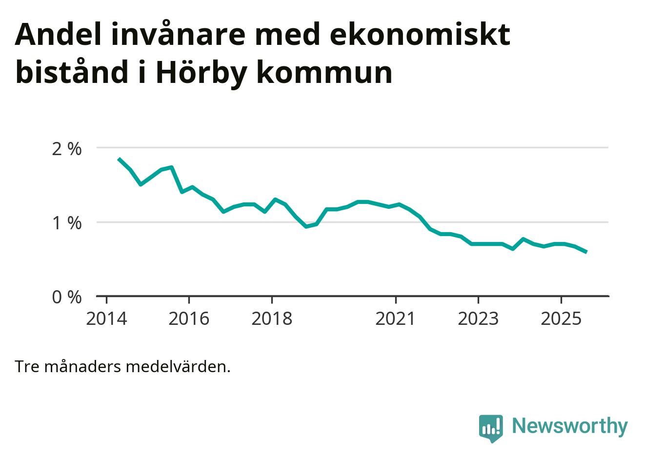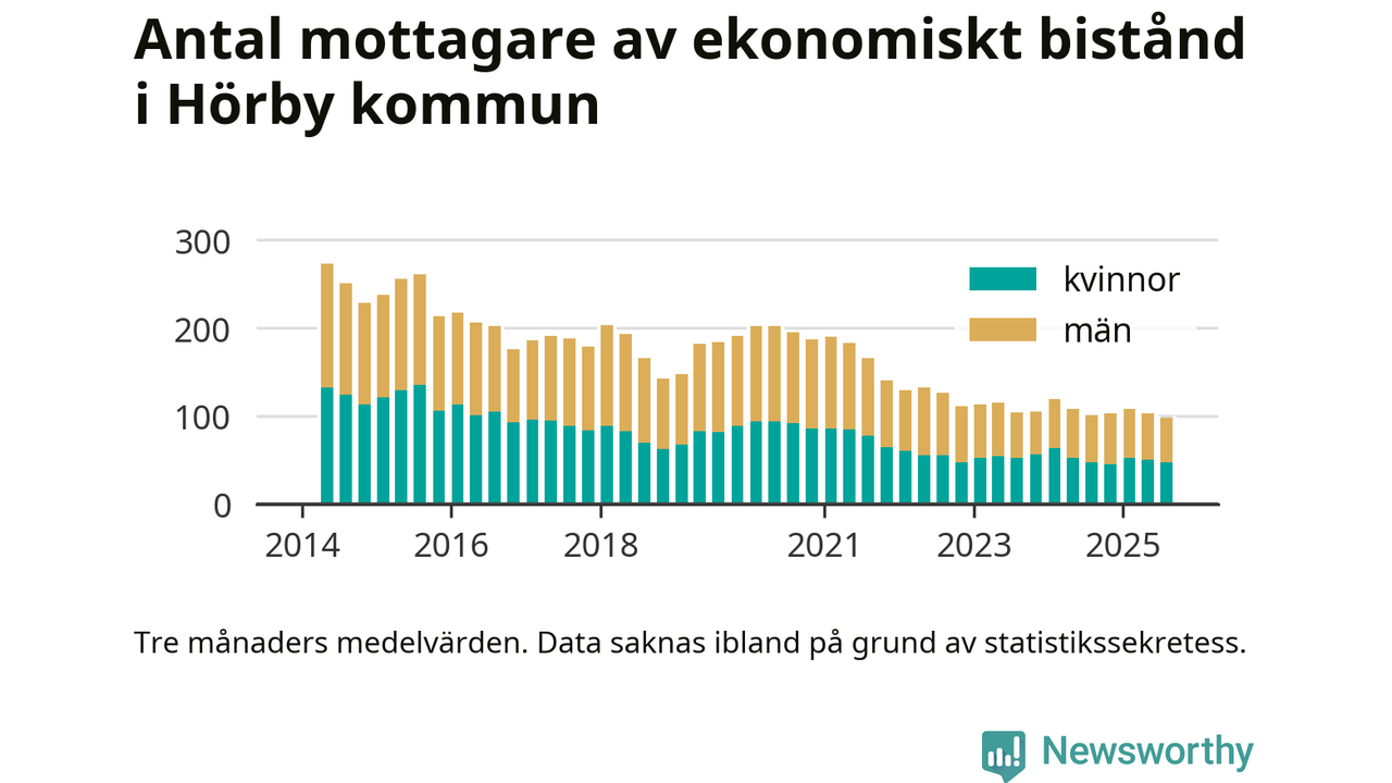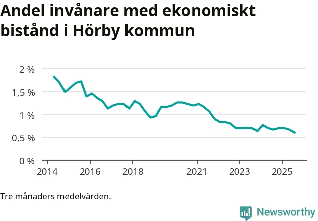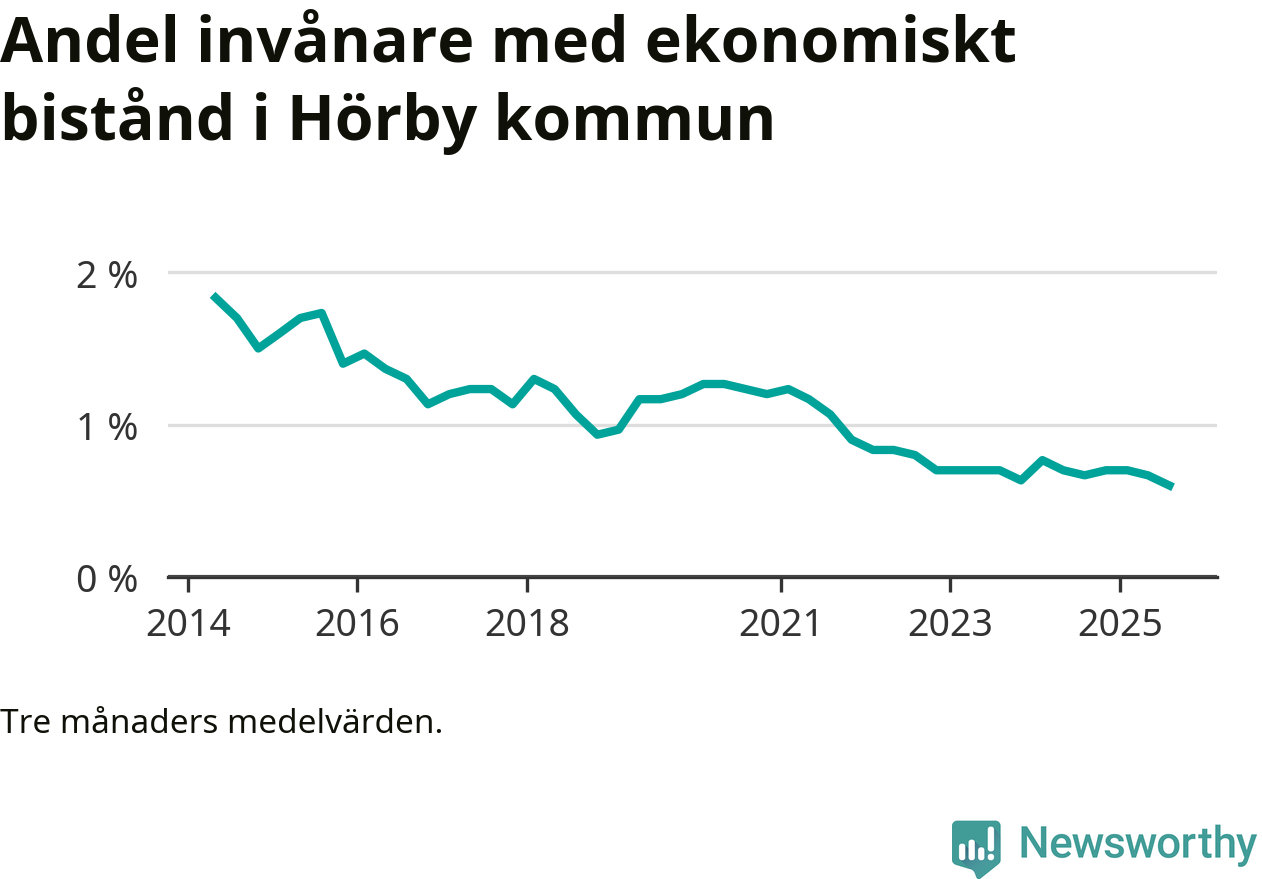 Andelen invånare med ekonomiskt bistånd i Hörby kommun var under sommaren den lägsta sedan åtminstone 2014. Det visar den senaste, preliminära statistiken från Socialstyrelsen.