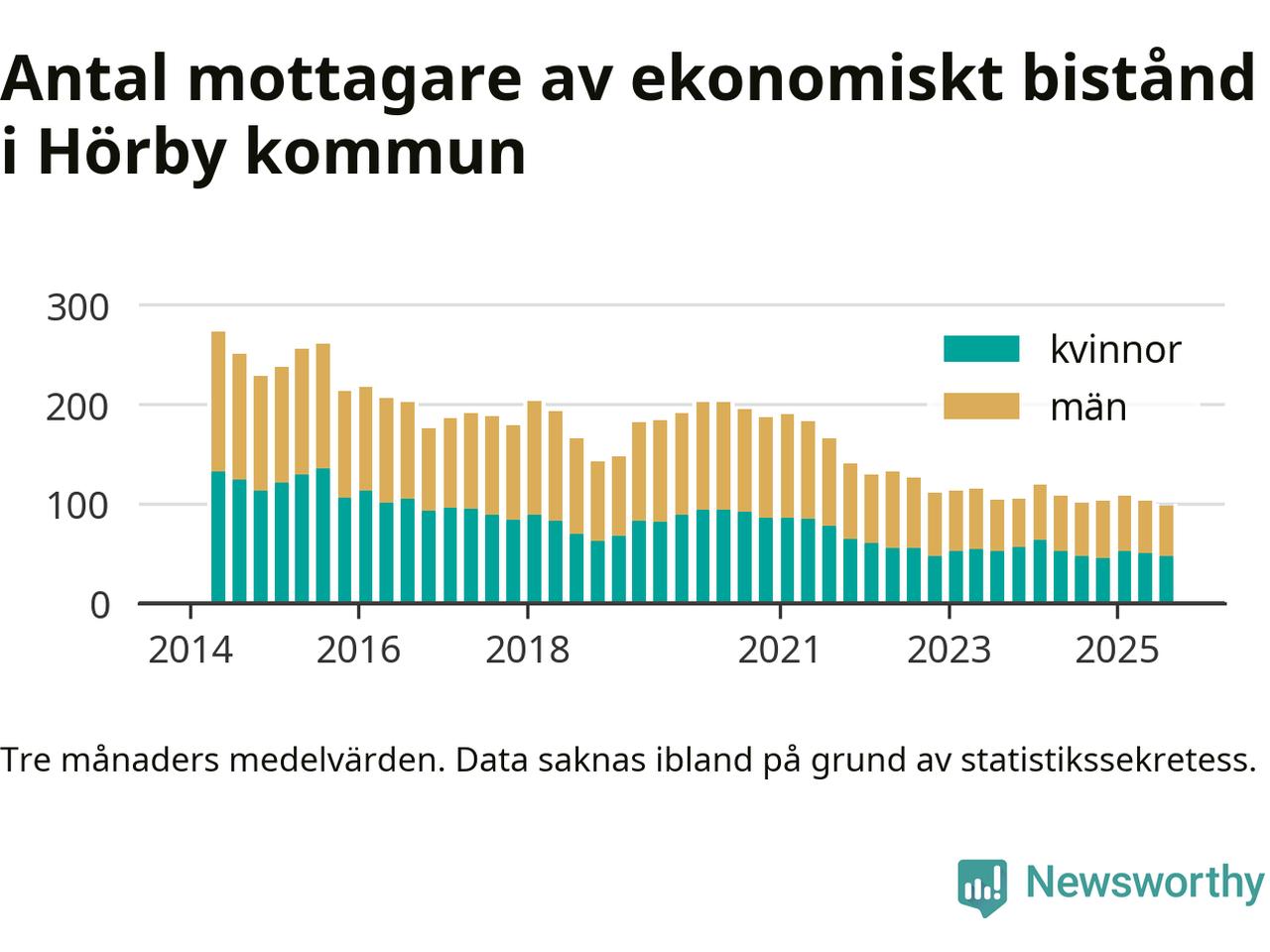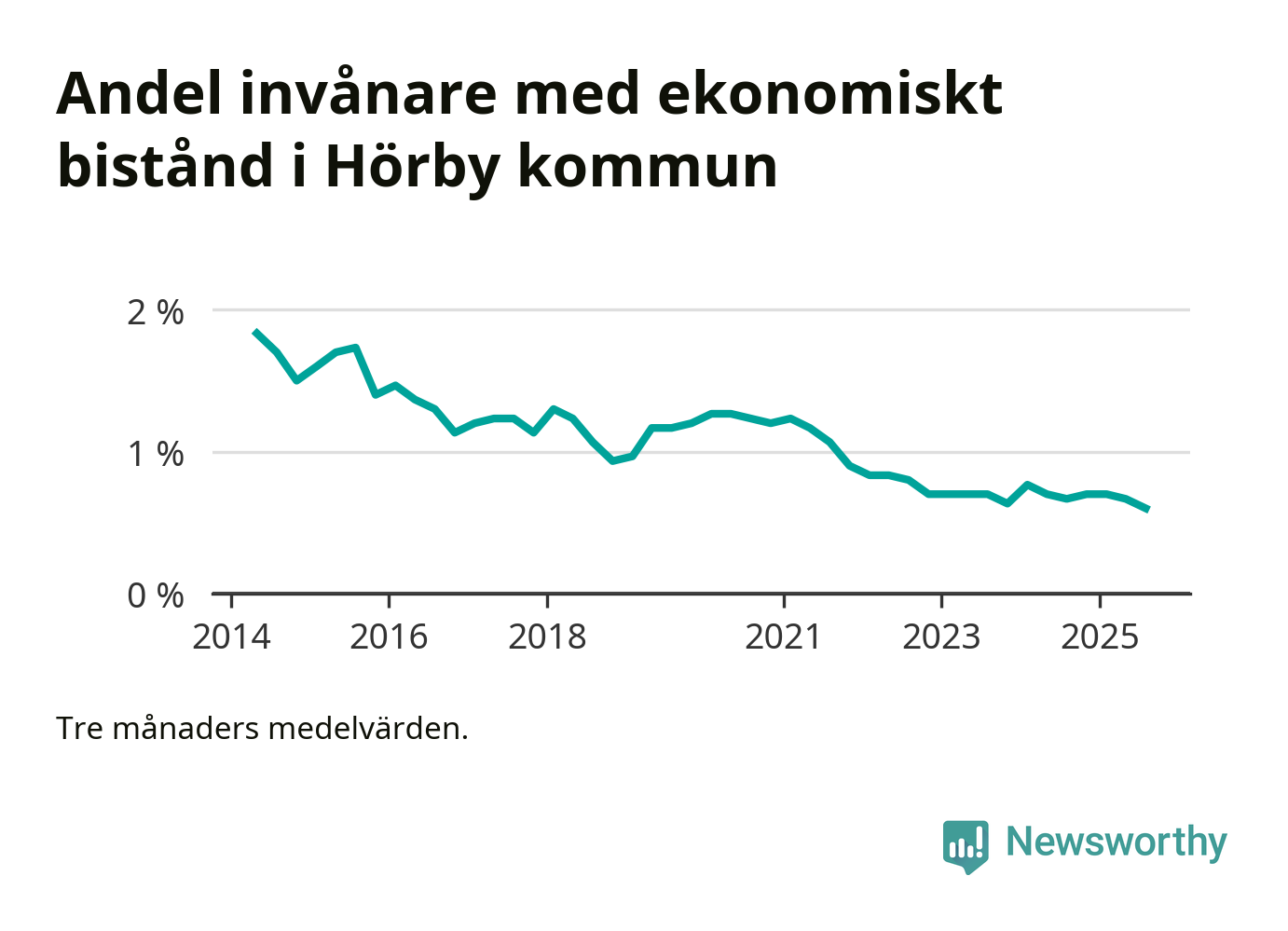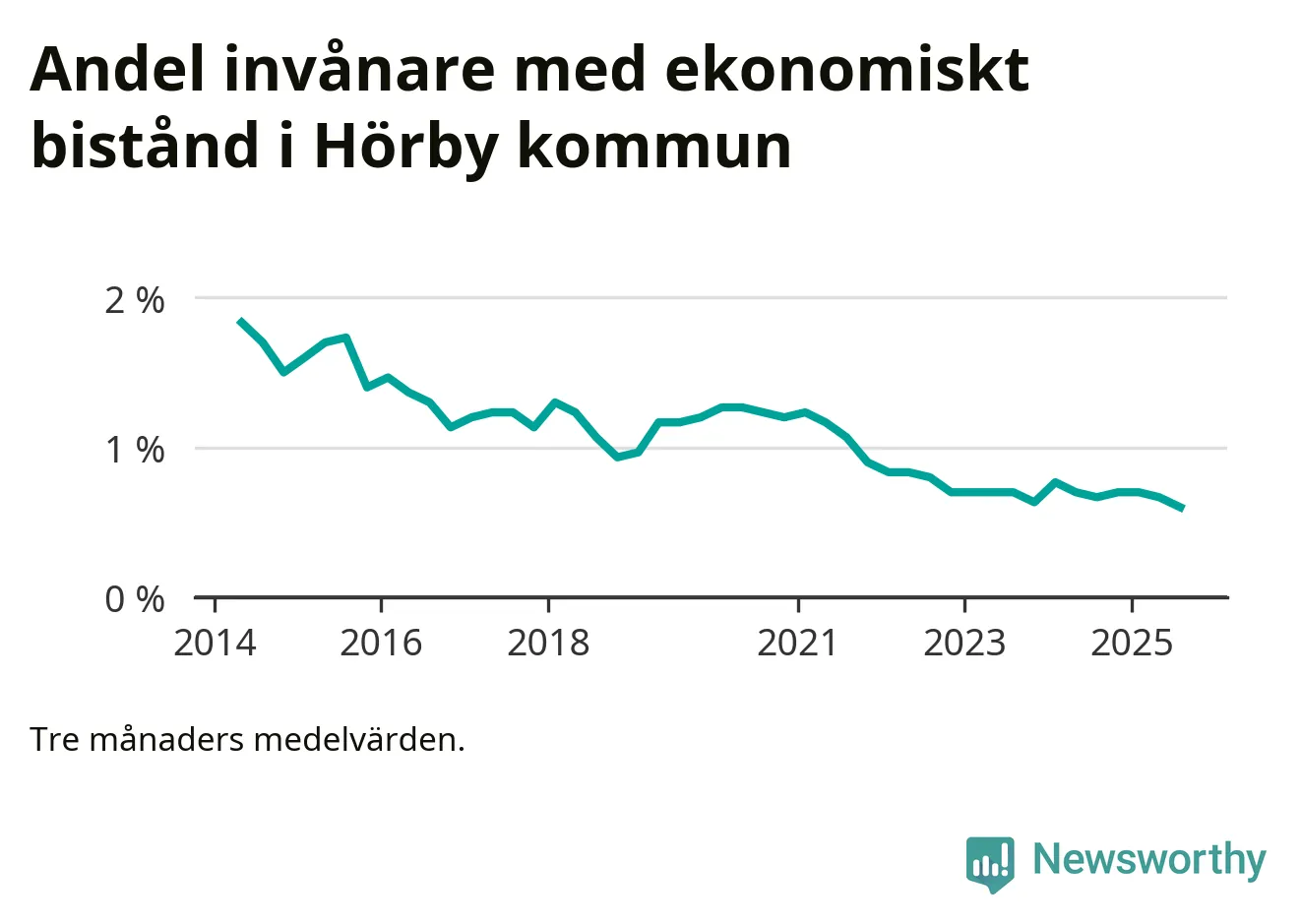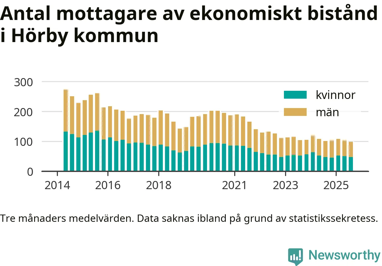 Andelen invånare med ekonomiskt bistånd i Hörby kommun var under sommaren den lägsta sedan åtminstone 2014. Det visar den senaste, preliminära statistiken från Socialstyrelsen.