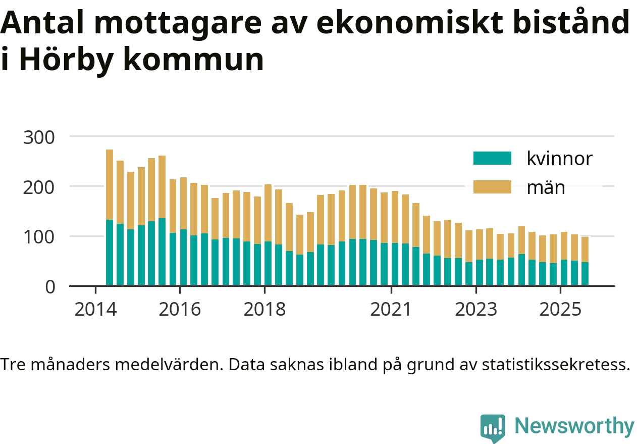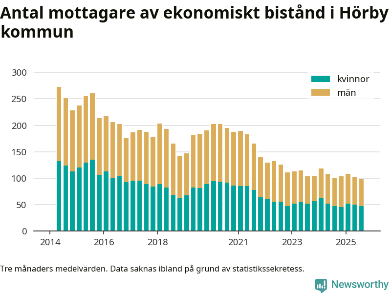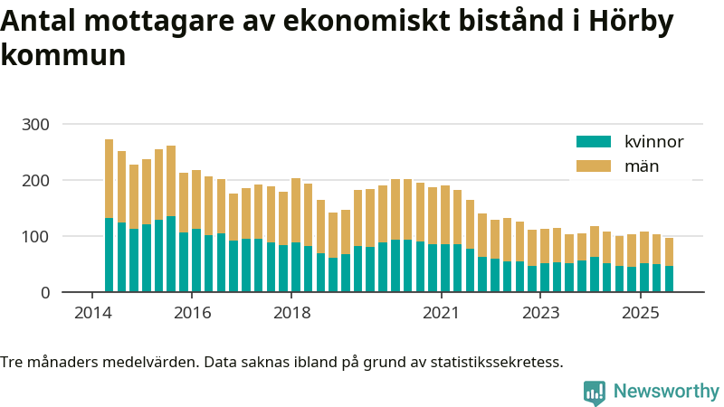 I genomsnitt 98 personer per månad fick ekonomiskt bistånd i Hörby kommun under sommarmånaderna (juni till augusti), vilket motsvarar 0,6 procent av den vuxna befolkningen. Det är marginellt mindre än i våras, och något mindre andel än under sommaren för ett år sedan.