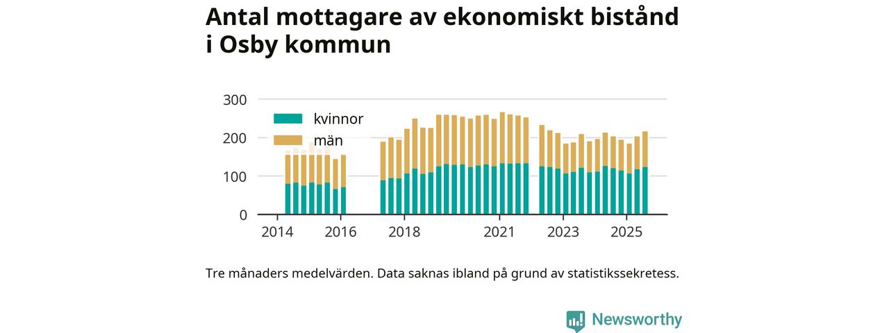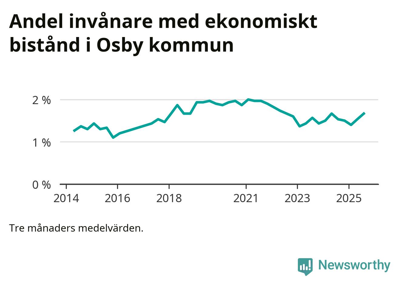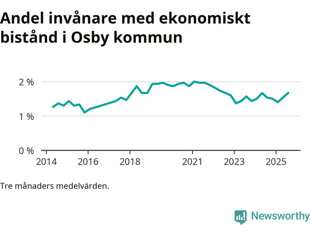 I genomsnitt 215 personer per månad fick ekonomiskt bistånd i Osby kommun under sommarmånaderna (juni till augusti), vilket motsvarar 1,7 procent av den vuxna befolkningen. Det är en ökning med 0,1 procentenheter eller 13 personer jämfört med i våras, och något större andel än under sommaren för ett år sedan.