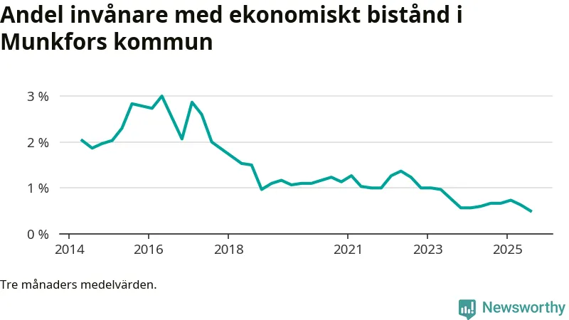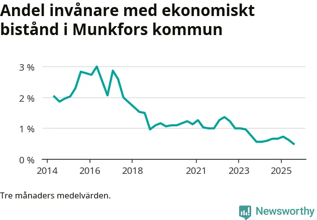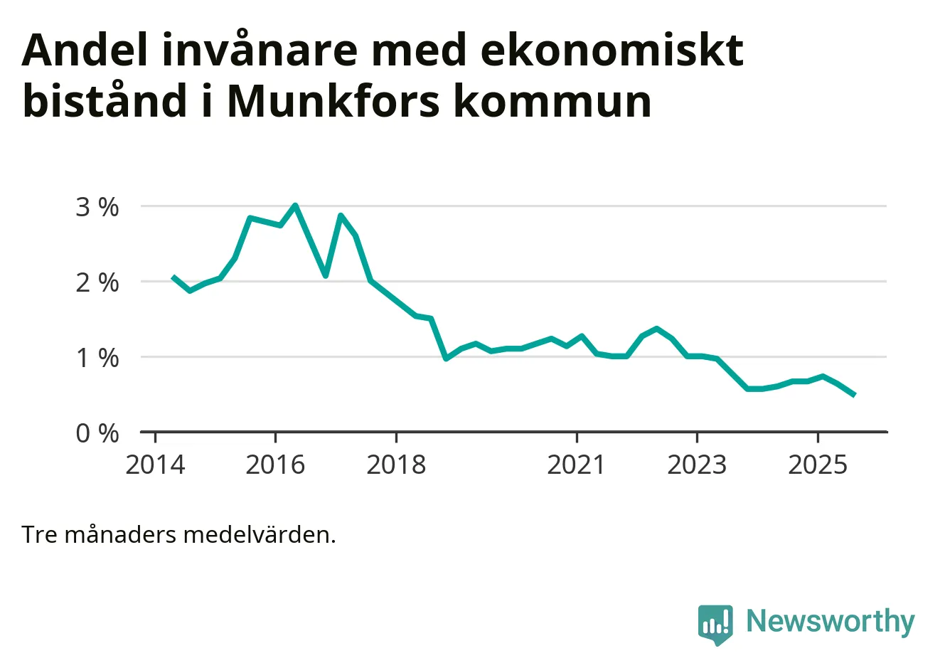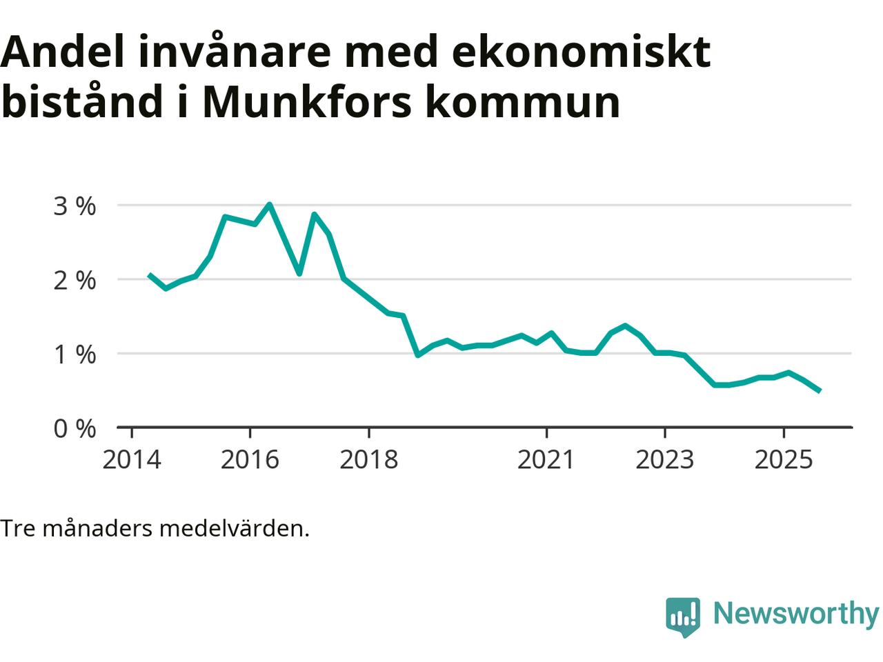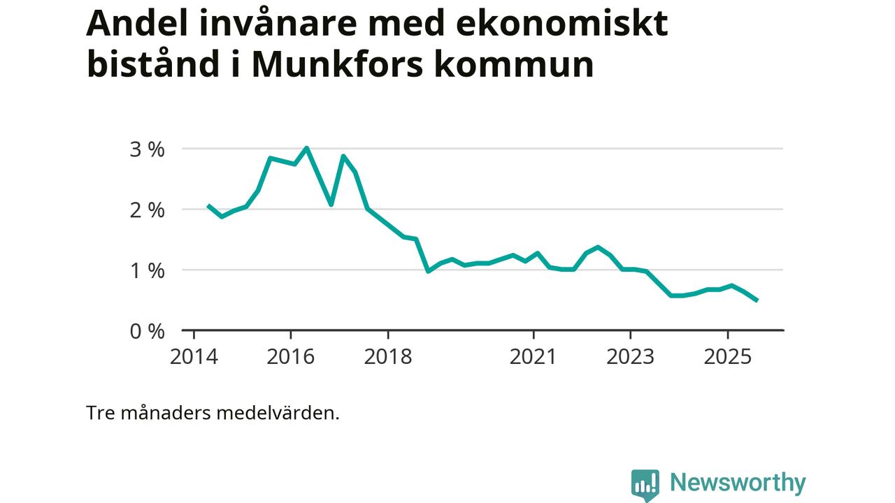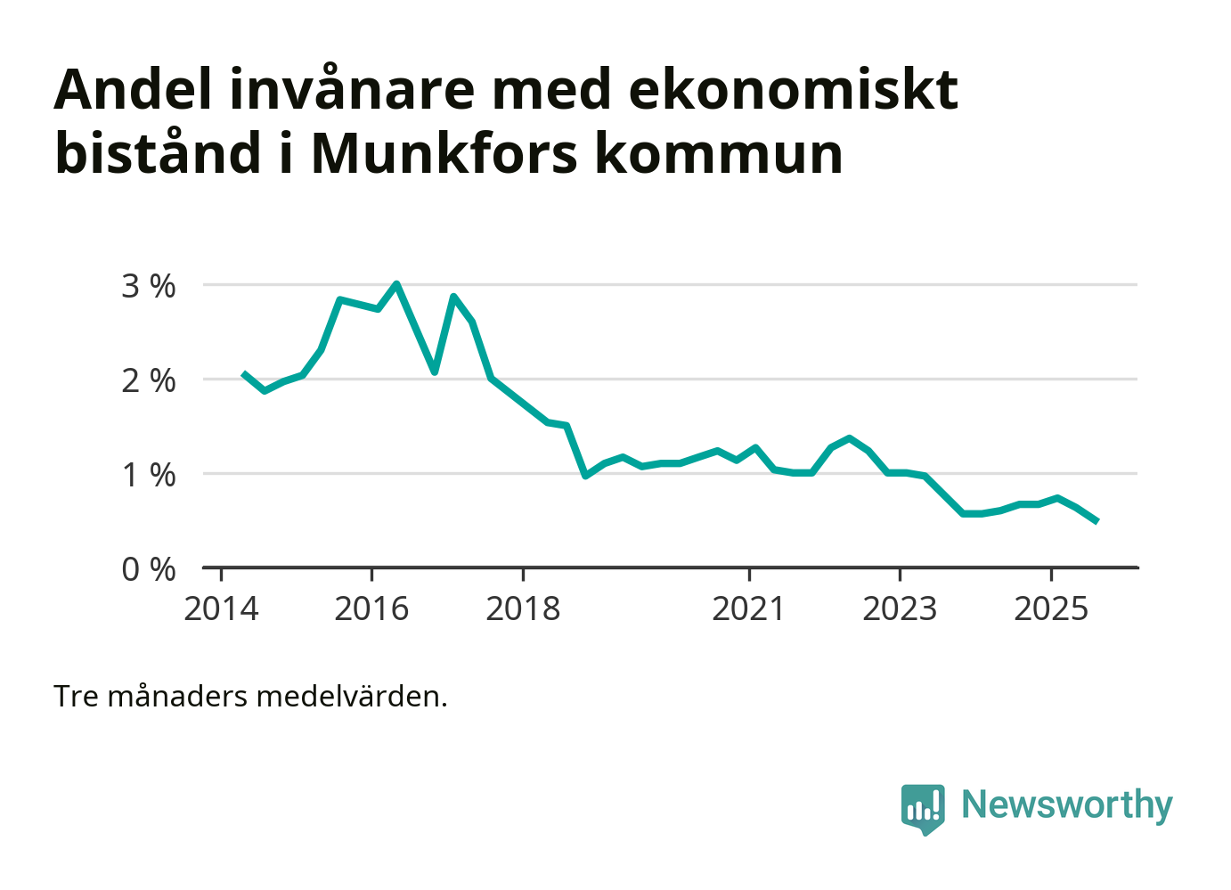 Andelen invånare med ekonomiskt bistånd i Munkfors kommun var under sommaren den lägsta sedan åtminstone 2014. Det visar den senaste, preliminära statistiken från Socialstyrelsen.